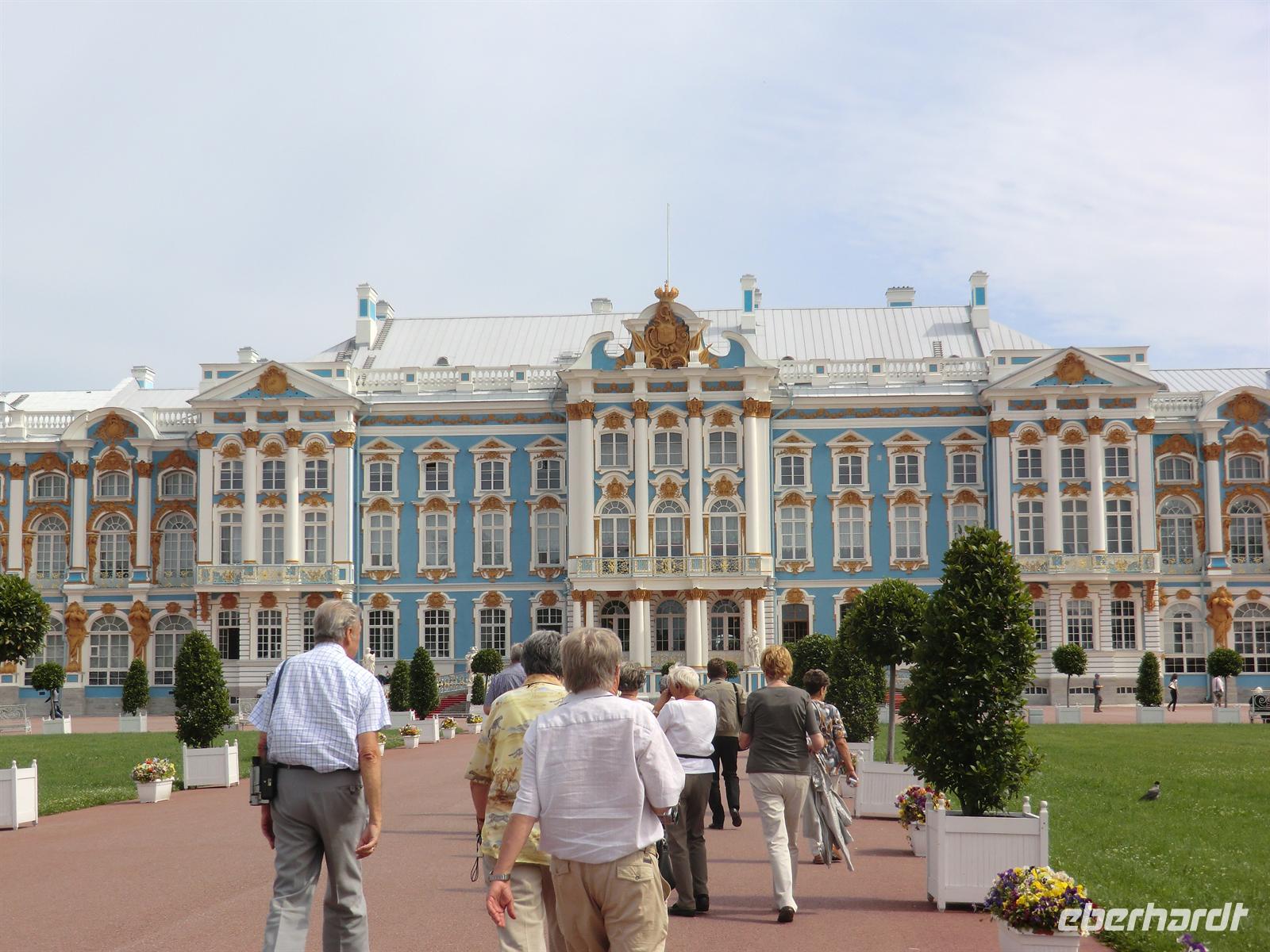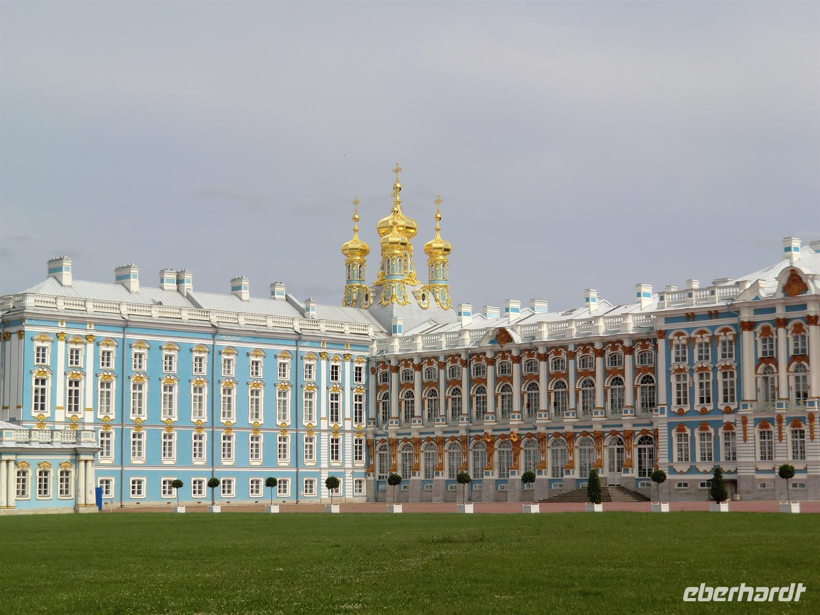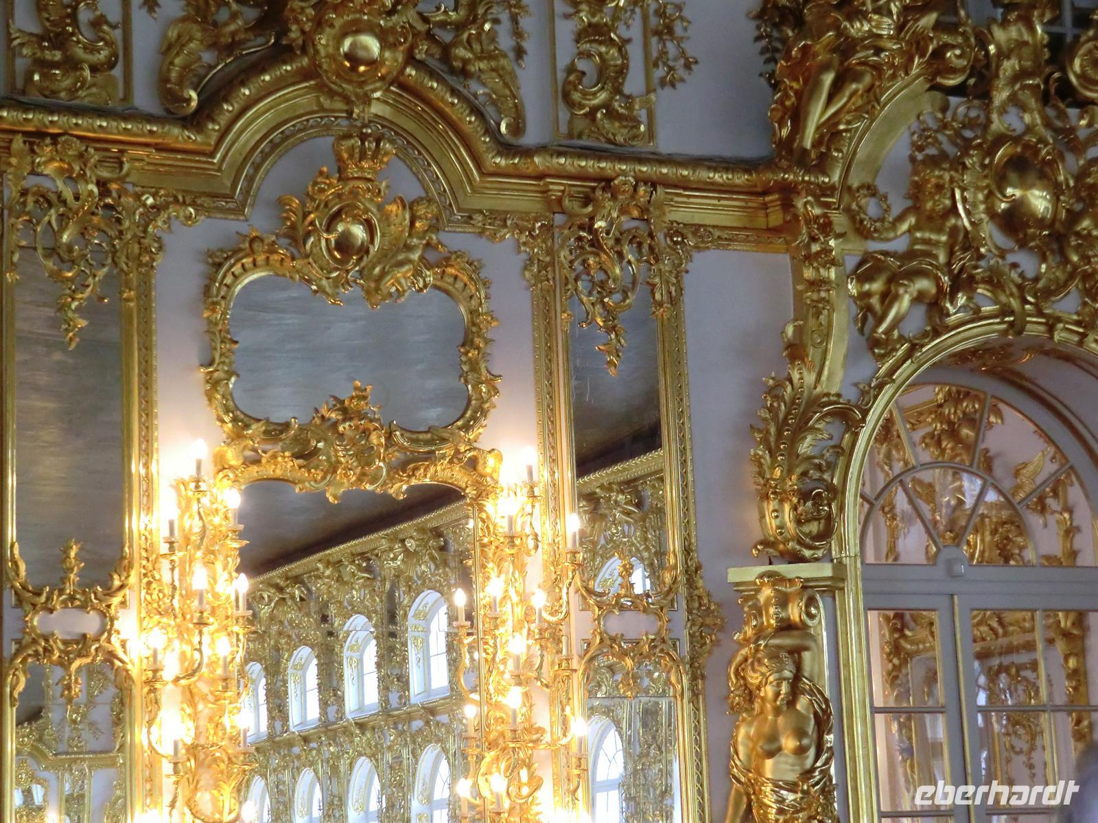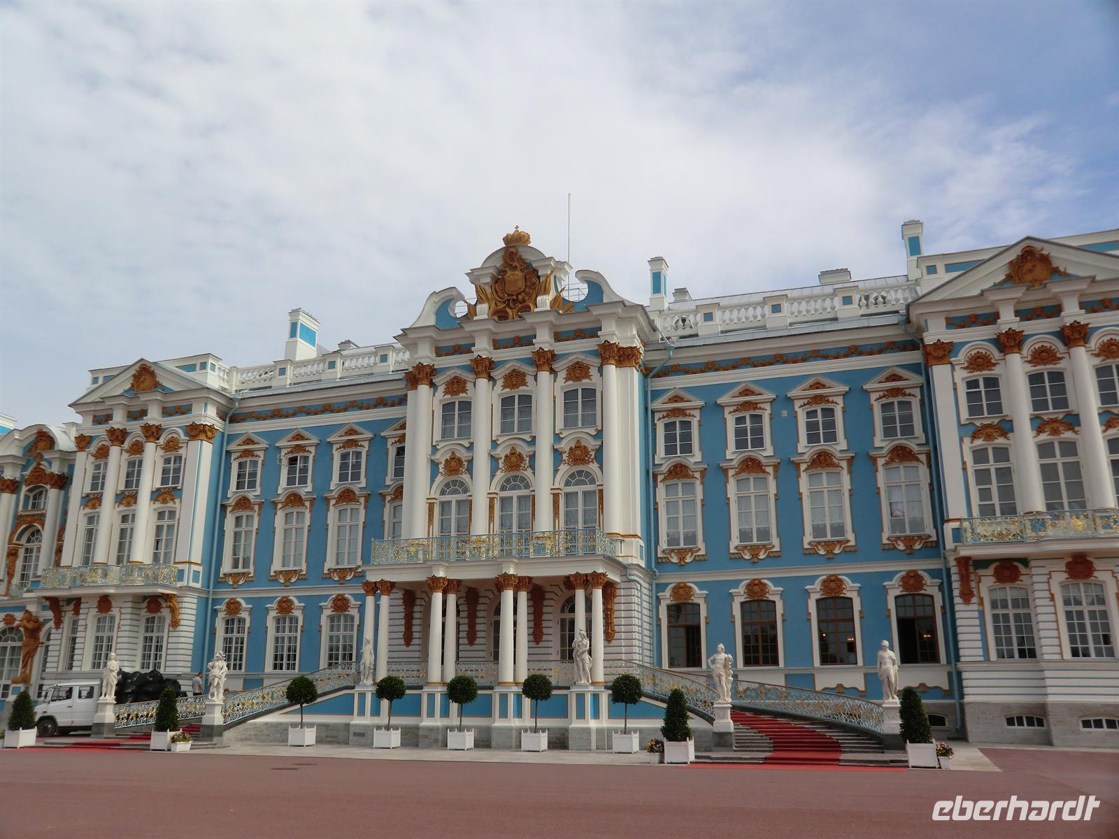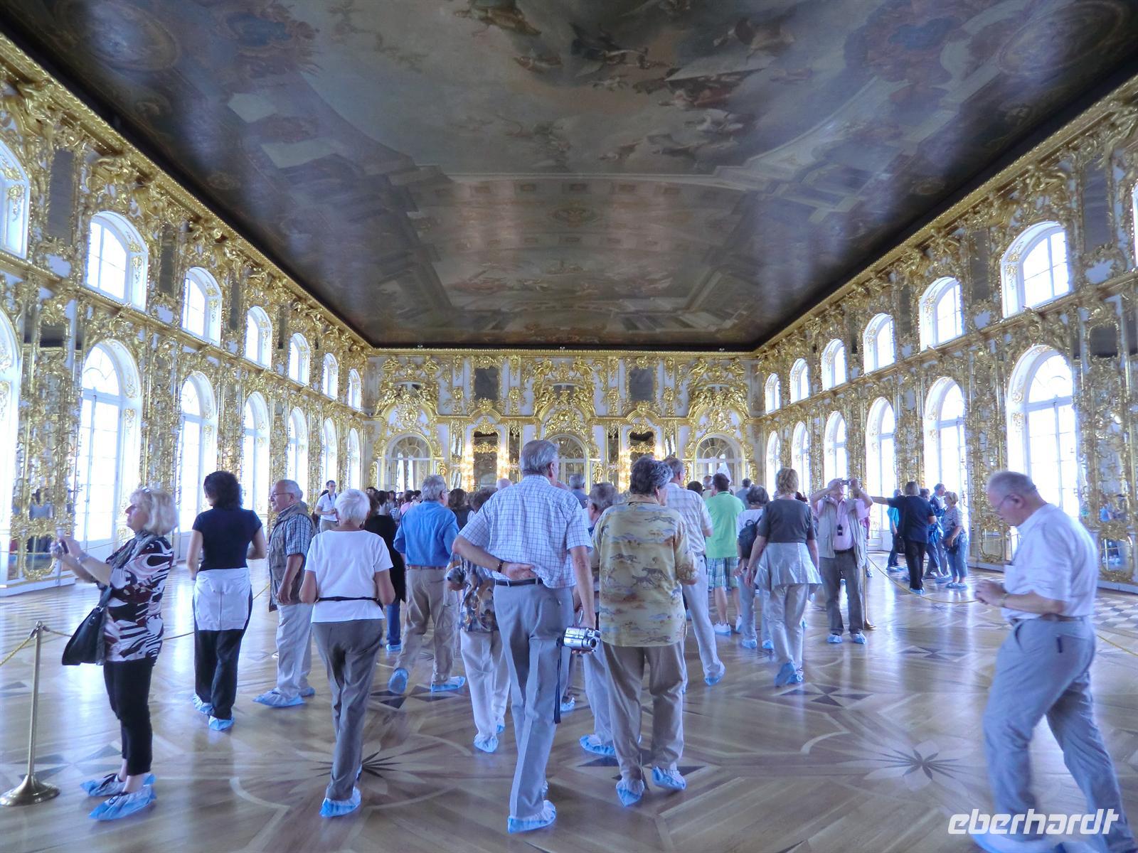 Nach dem Passieren des Ägyptischen Tores, des „Alexander Puschkin-Hauses“ und des Alexanderpalais erreichten wir gegen 15 Uhr den Parkplatz des Katharinenpalais, um kurz darauf das Goldene Tor zu passieren. Die Berühmtheit der Anlage lässt sich nicht zuletzt an einer äußerst hohen Besucherzahl von durchschnittlich 15.000 Personen pro Tag ablesen. Und so sammelten sich auch heute zahlreiche Gruppen vor dem Eingang des Palastes. Trotz des hohen Andrangs konnten wir die prunkvolle Pracht genießen, deren denkbarer Höhepunkt das sagenumwobene
