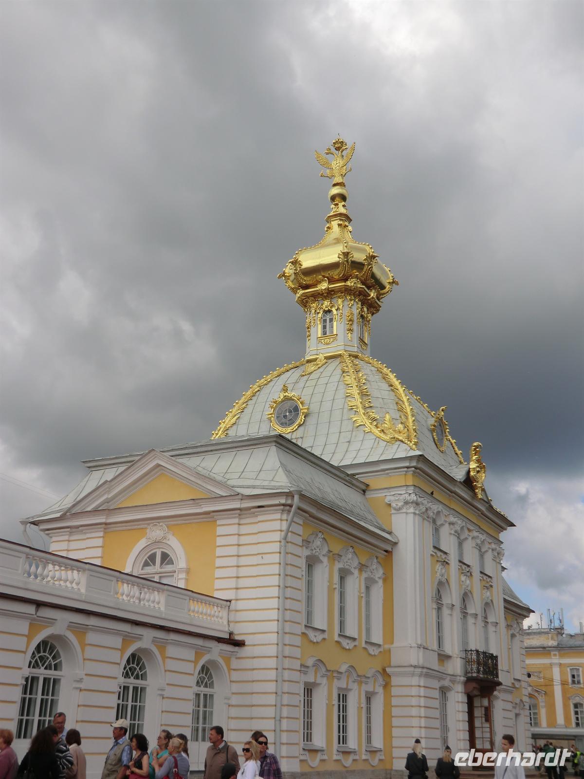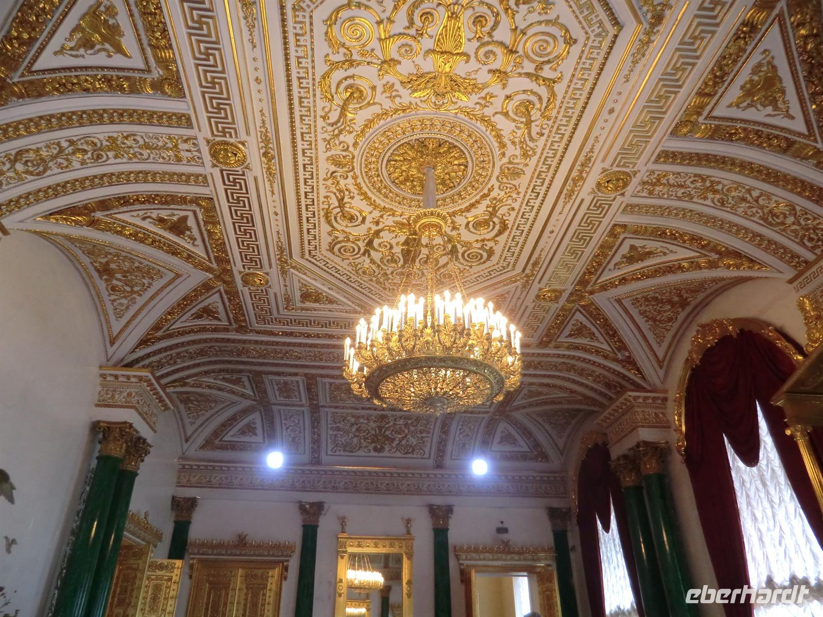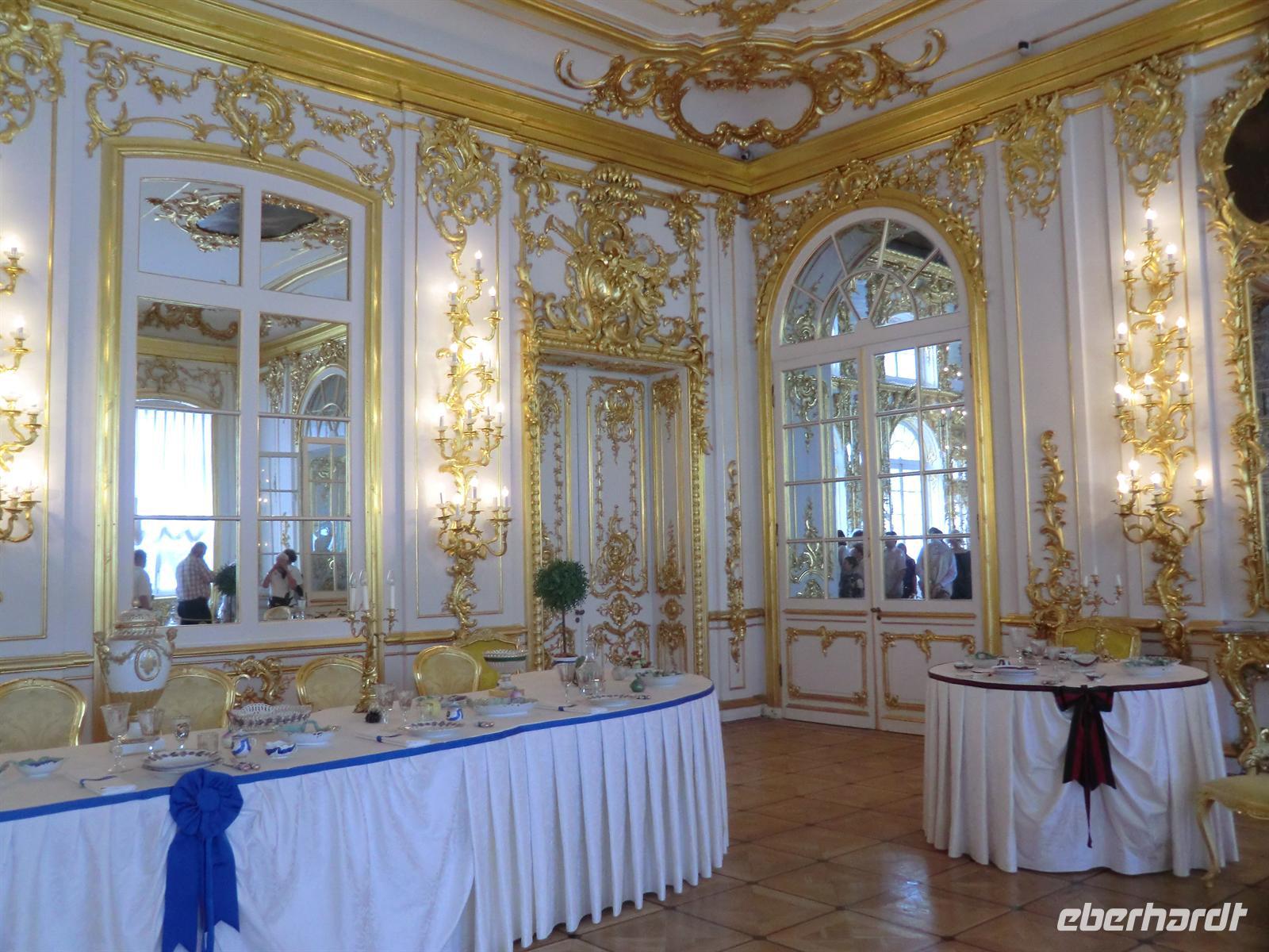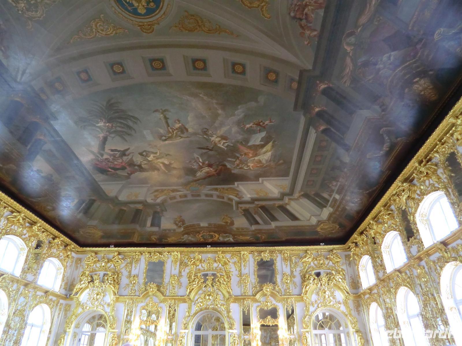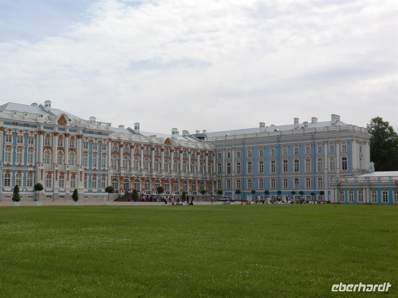 Nach dem Passieren des Ägyptischen Tores, des „Alexander Puschkin-Hauses“ und des Alexanderpalais erreichten wir gegen 15 Uhr den Parkplatz des Katharinenpalais, um kurz darauf das Goldene Tor zu passieren. Die Berühmtheit der Anlage lässt sich nicht zuletzt an einer äußerst hohen Besucherzahl von durchschnittlich 15.000 Personen pro Tag ablesen. Und so sammelten sich auch heute zahlreiche Gruppen vor dem Eingang des Palastes. Trotz des hohen Andrangs konnten wir die prunkvolle Pracht genießen, deren denkbarer Höhepunkt das sagenumwobene
