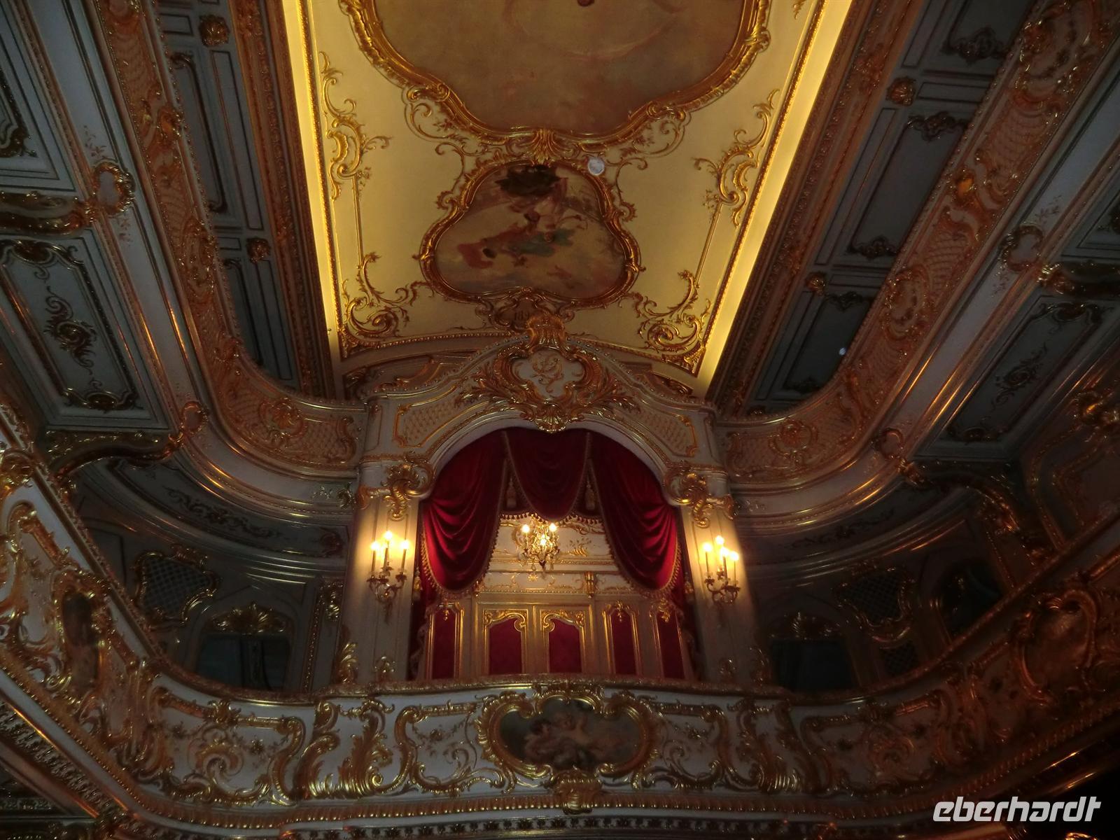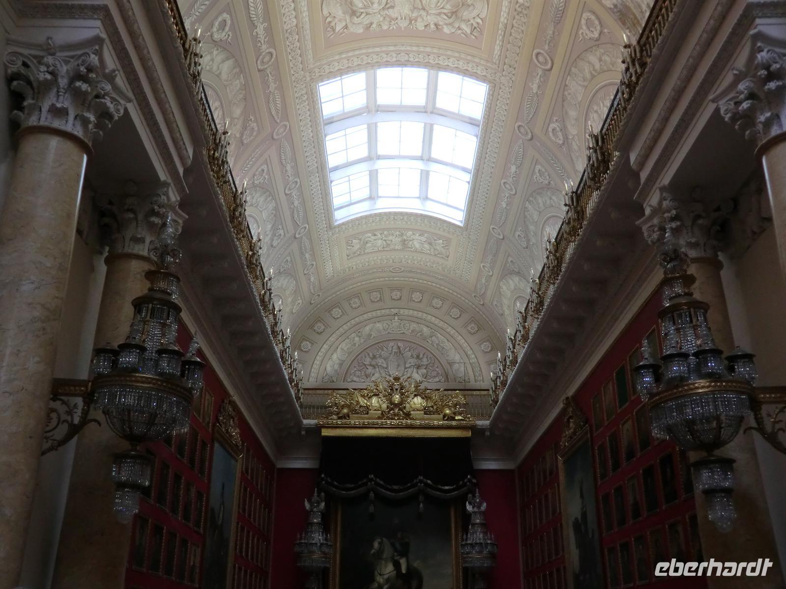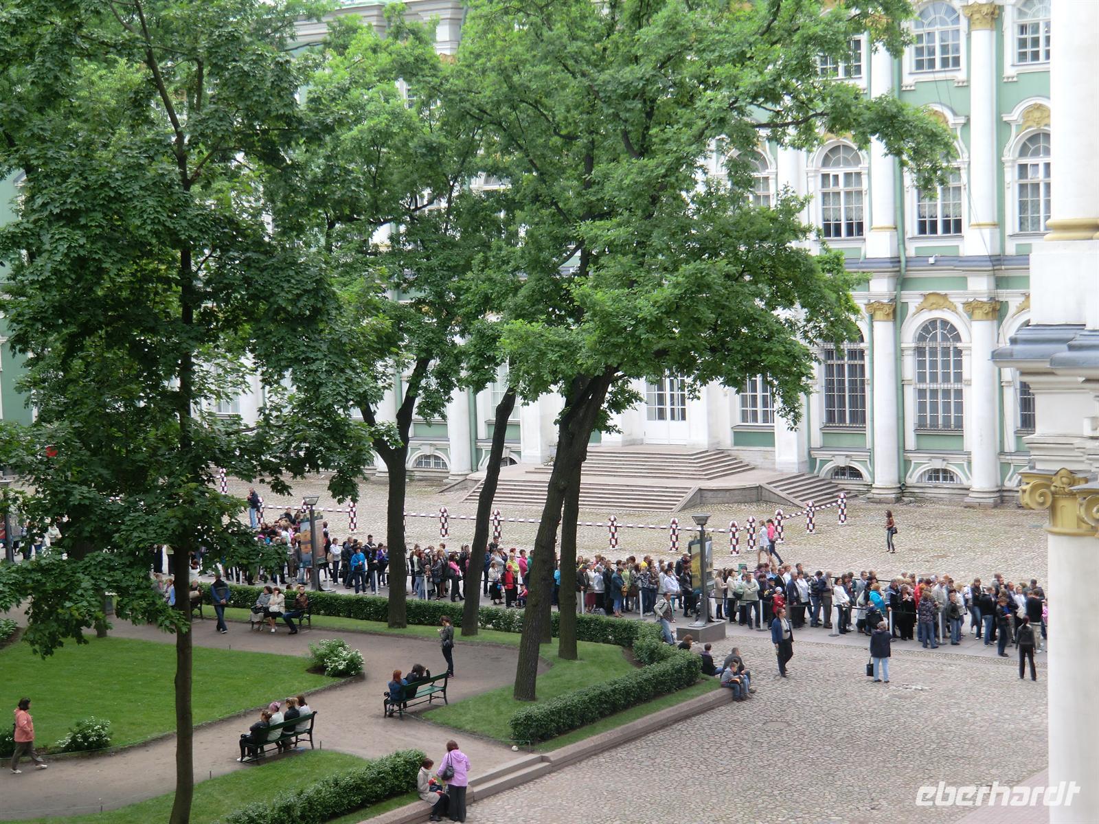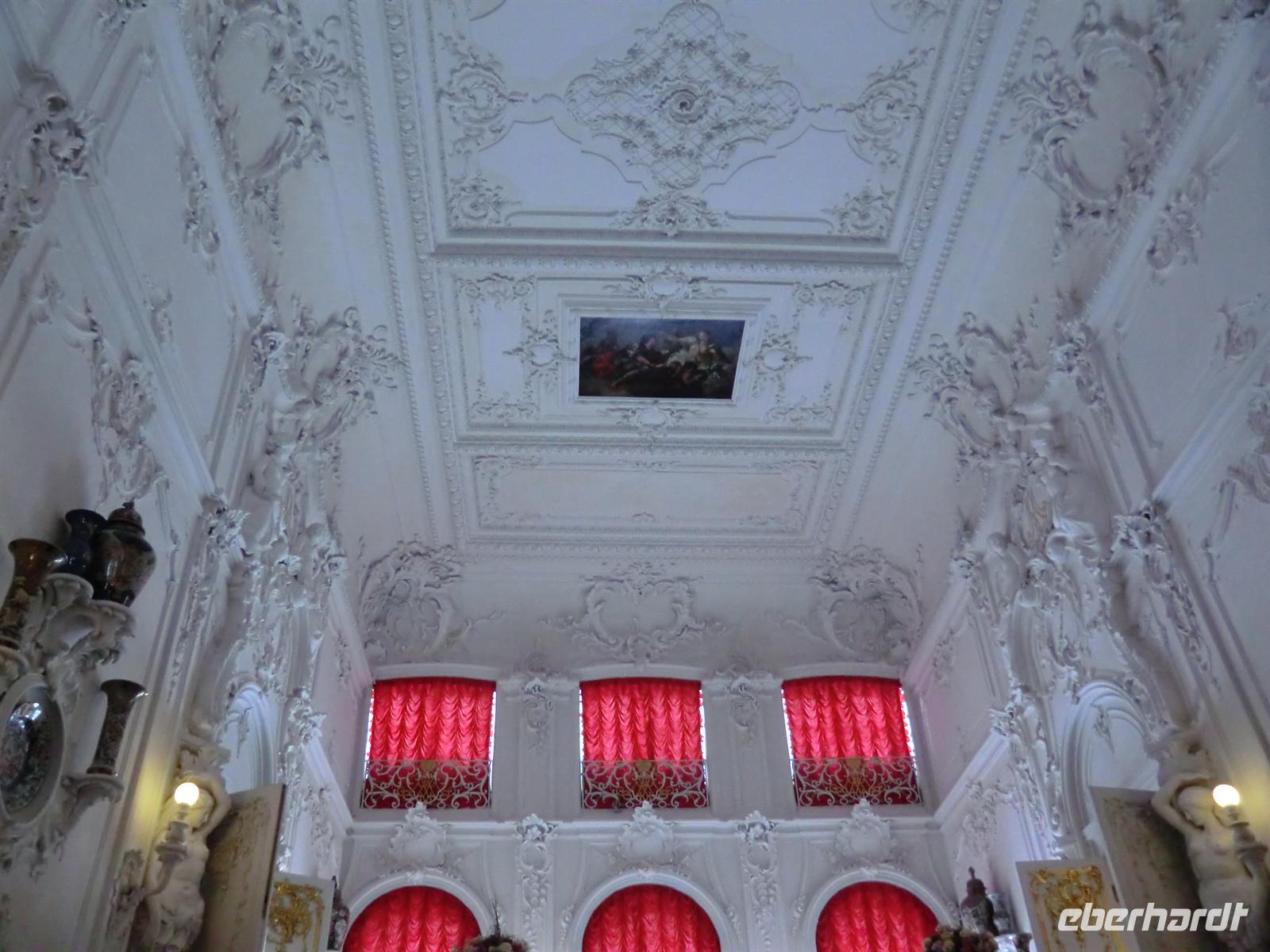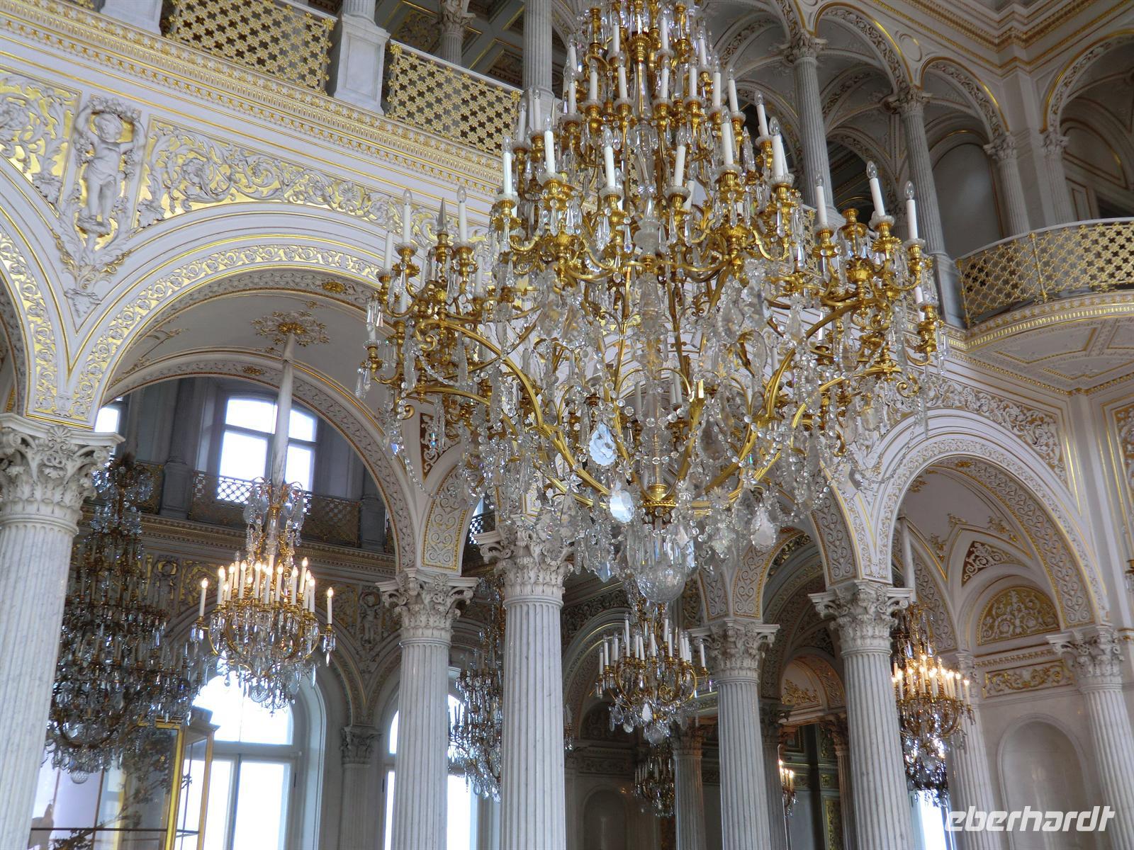 Nach dem Passieren des Ägyptischen Tores, des „Alexander Puschkin-Hauses“ und des Alexanderpalais erreichten wir gegen 15 Uhr den Parkplatz des Katharinenpalais, um kurz darauf das Goldene Tor zu passieren. Die Berühmtheit der Anlage lässt sich nicht zuletzt an einer äußerst hohen Besucherzahl von durchschnittlich 15.000 Personen pro Tag ablesen. Und so sammelten sich auch heute zahlreiche Gruppen vor dem Eingang des Palastes. Trotz des hohen Andrangs konnten wir die prunkvolle Pracht genießen, deren denkbarer Höhepunkt das sagenumwobene
