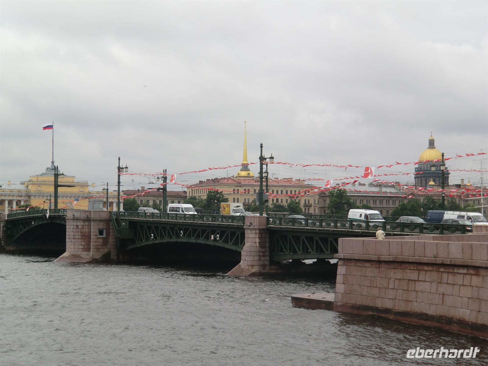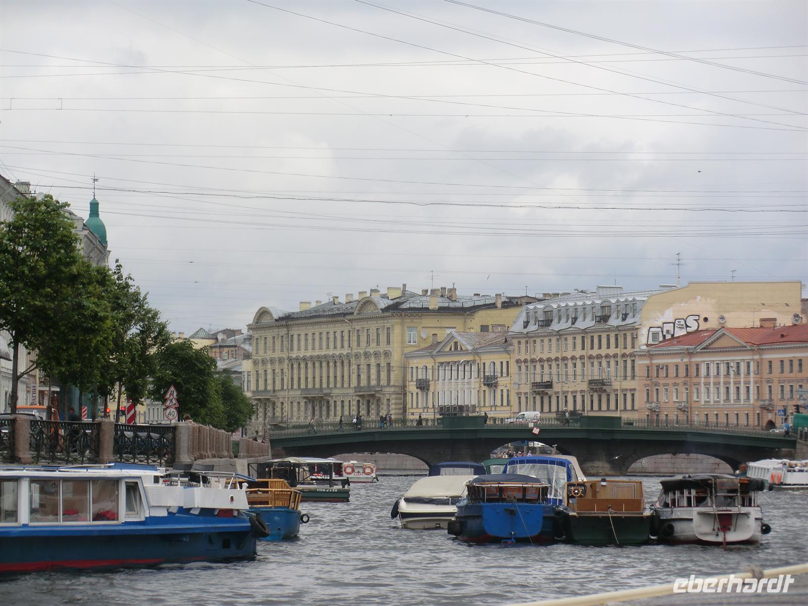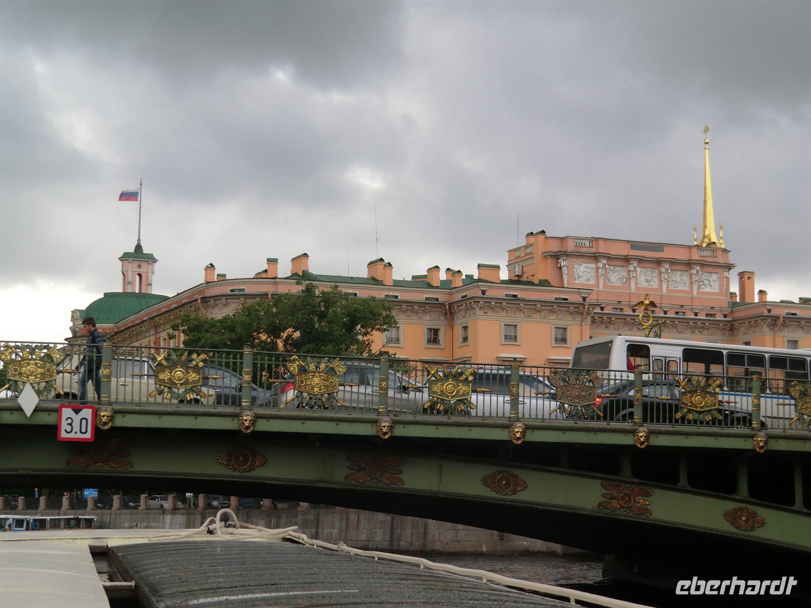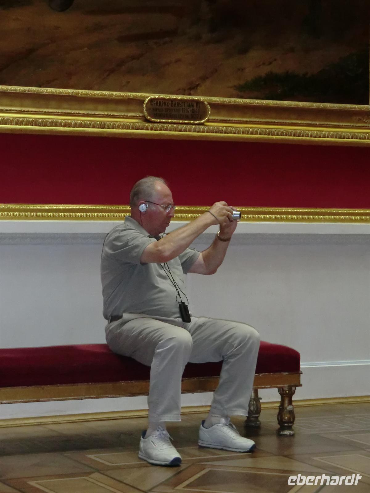Auch heute hieß es ausschlafen und entspannt frühstücken ehe wir 10 Uhr von Igor und Sergej zu unserer heutigen Besichtigungstour abgeholt. Bereits nach einer halben Stunde Fahrt entlang des Platzes der Arbeit, des Wohnhauses von Otto von Bismarck und der Dreifaltigkeitsbrücke erreichten wir die Anlegestelle am Newa-Kai. Unser privates Boot erwartete uns bereits auf den Wogen des Flusses. Während einer einstündigen Bootspartie entlang der Kanäle von St. Petersburg bestaunten wir die Sehenswürdigkeiten der Stadt vom Wasser aus. Durch den hohen Pegelstand der Newa wurde die Fahrt zum Abenteuer, indem es beim Durchfahren der zahlreichen Brücken hieß: „Köpfe einziehen!“. Jene Gäste, die sich für das wohlig warme Sitzen unter Deck entschieden hatten, lebten in diesem Fall weniger gefährlich und konnten das Wohnhaus von Puschkin, das edle Hotel Kempinski und andere am Ufer stehende Gebäude durch die Panoramafenster beobachten.
