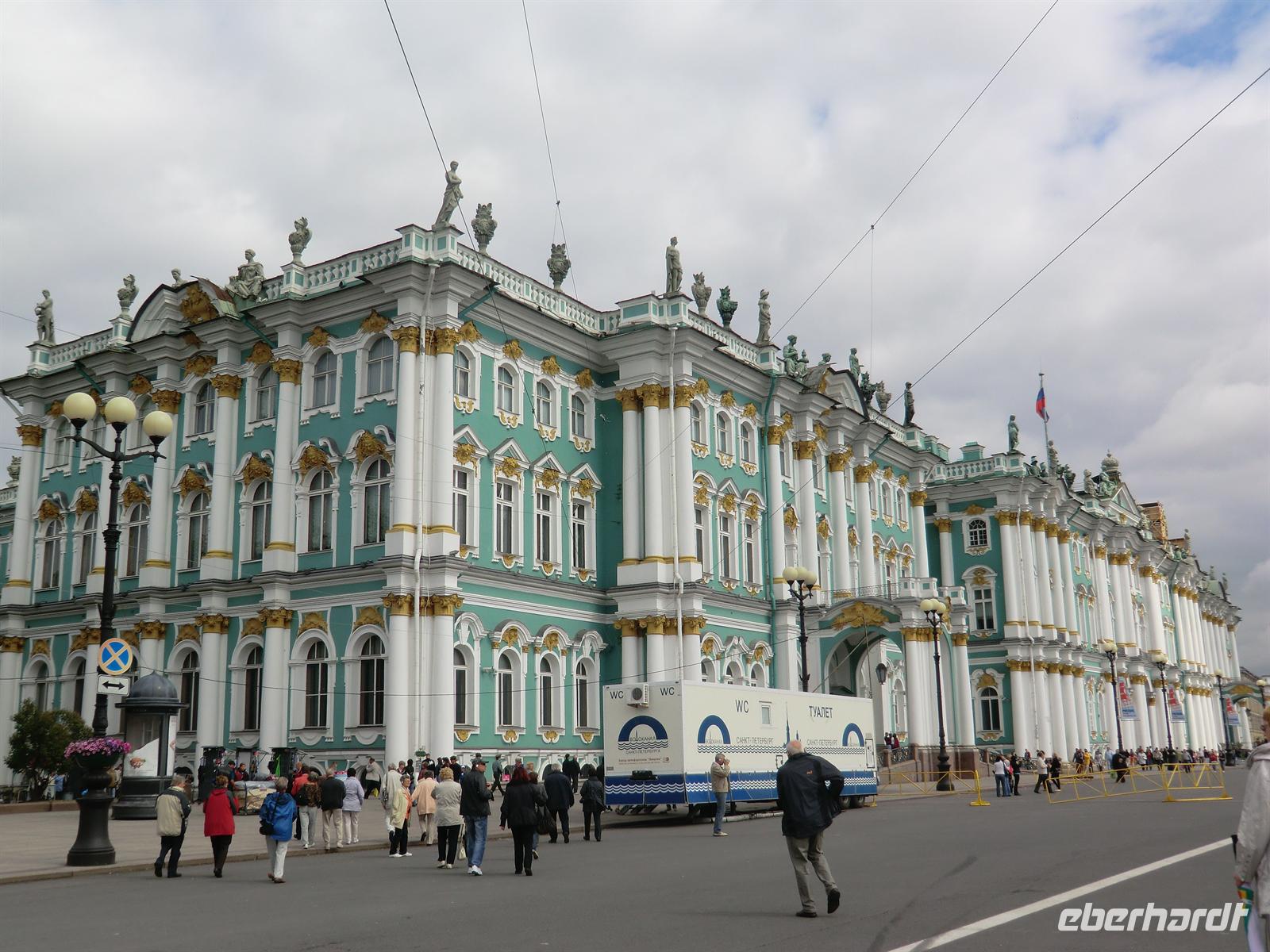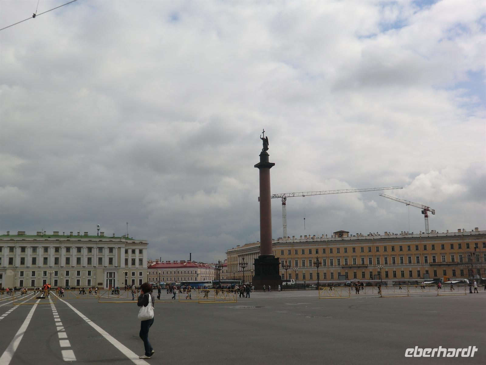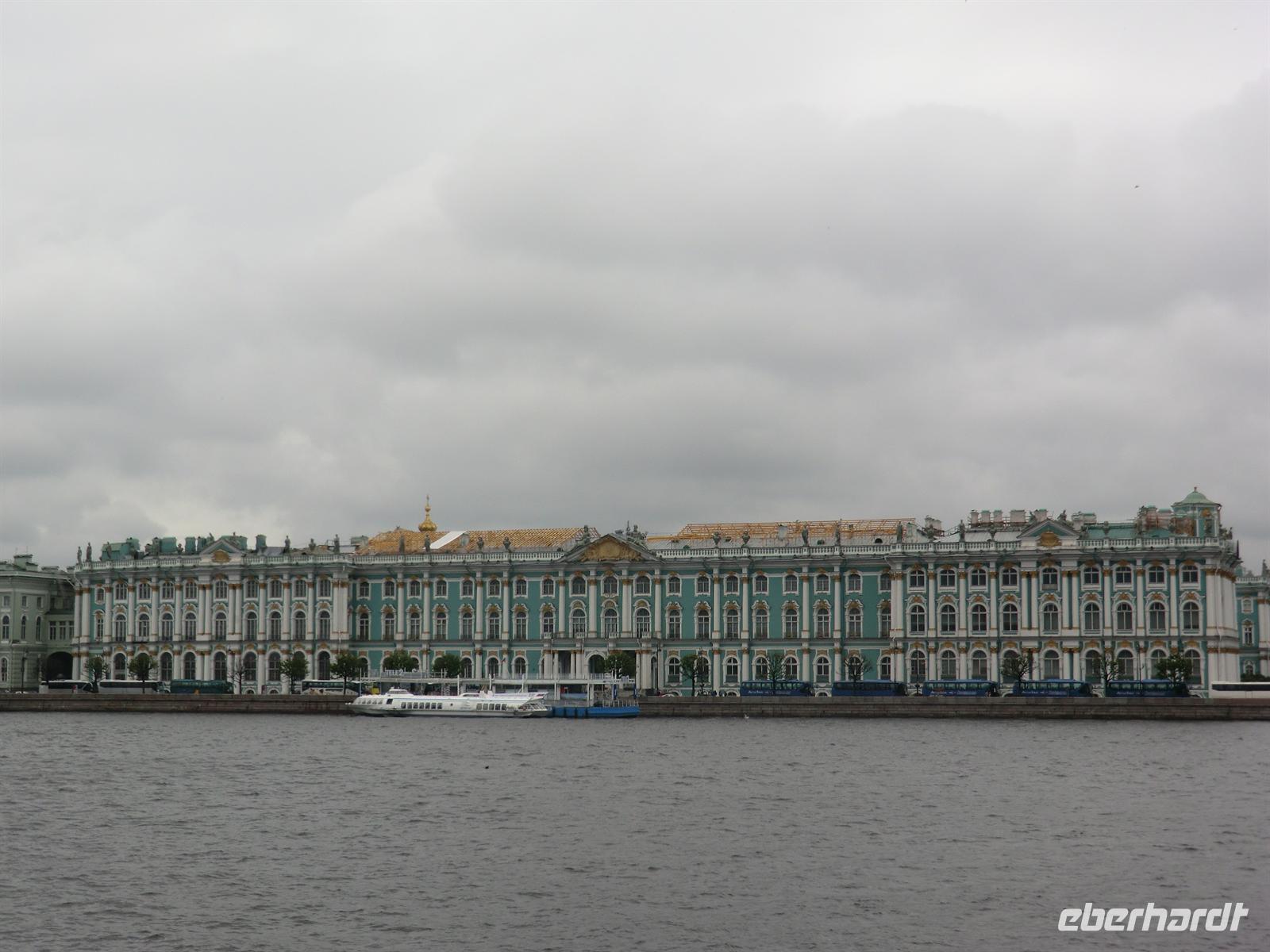 Nach einem köstlichen Frühstück erwartete uns Igor 10 Uhr im Foyer. Zusammen mit unserem Fahrer Sergej starteten wir pünktlich mit unserer erkundenden Stadtrundfahrt durch die prunkvolle Zarenstadt. Unser Weg führte uns zunächst entlang des Messegeländes und Bolschoi-Prospekts in Richtung der Akademie der Künste, der ältesten Kunstakademie Russlands. Nachdem uns Igor vor dem ersten Stopp das Kennzeichen unseres Busses mitteilte, um so vergebliches Suchen nach den Ausstiegen zu vermeiden, stand den kommenden Besichtigungen auch nichts mehr im Weg. Erste schöne Aufnahmen schossen wir am östlichen Zipfel der Wassiljewski-Insel. Von dort genossen wir einen herrlichen Blick auf den Winterpalast und die Peter- und