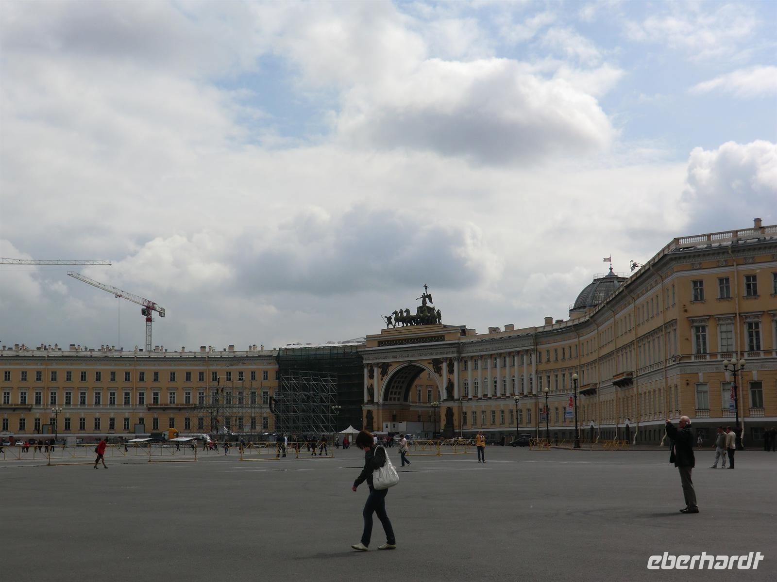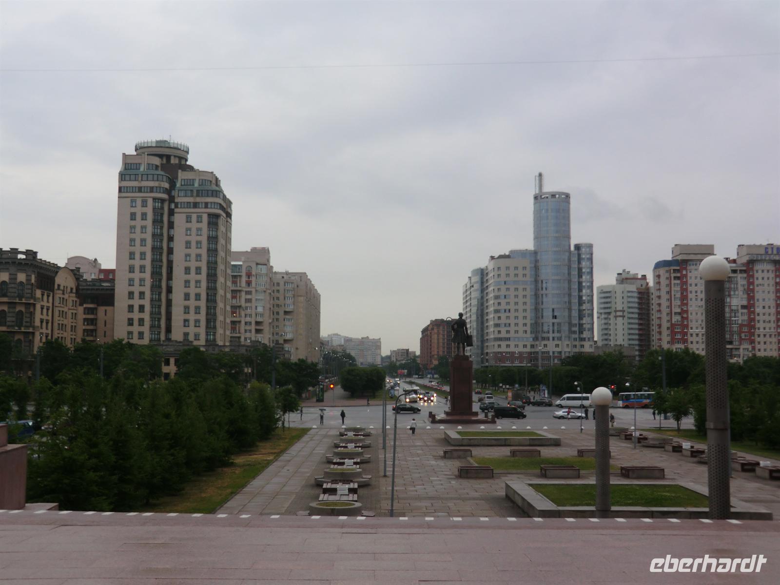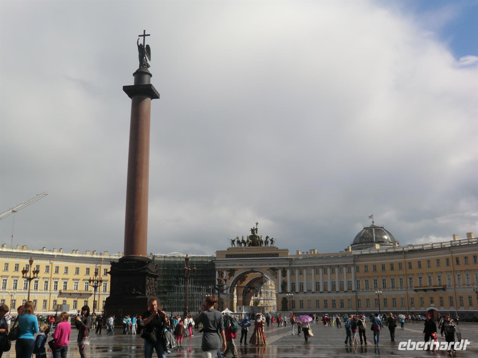 Nach einem köstlichen Frühstück erwartete uns Igor 10 Uhr im Foyer. Zusammen mit unserem Fahrer Sergej starteten wir pünktlich mit unserer erkundenden Stadtrundfahrt durch die prunkvolle Zarenstadt. Unser Weg führte uns zunächst entlang des Messegeländes und Bolschoi-Prospekts in Richtung der Akademie der Künste, der ältesten Kunstakademie Russlands. Nachdem uns Igor vor dem ersten Stopp das Kennzeichen unseres Busses mitteilte, um so vergebliches Suchen nach den Ausstiegen zu vermeiden, stand den kommenden Besichtigungen auch nichts mehr im Weg. Erste schöne Aufnahmen schossen wir am östlichen Zipfel der Wassiljewski-Insel. Von dort genossen wir einen herrlichen Blick auf den Winterpalast und die Peter- und