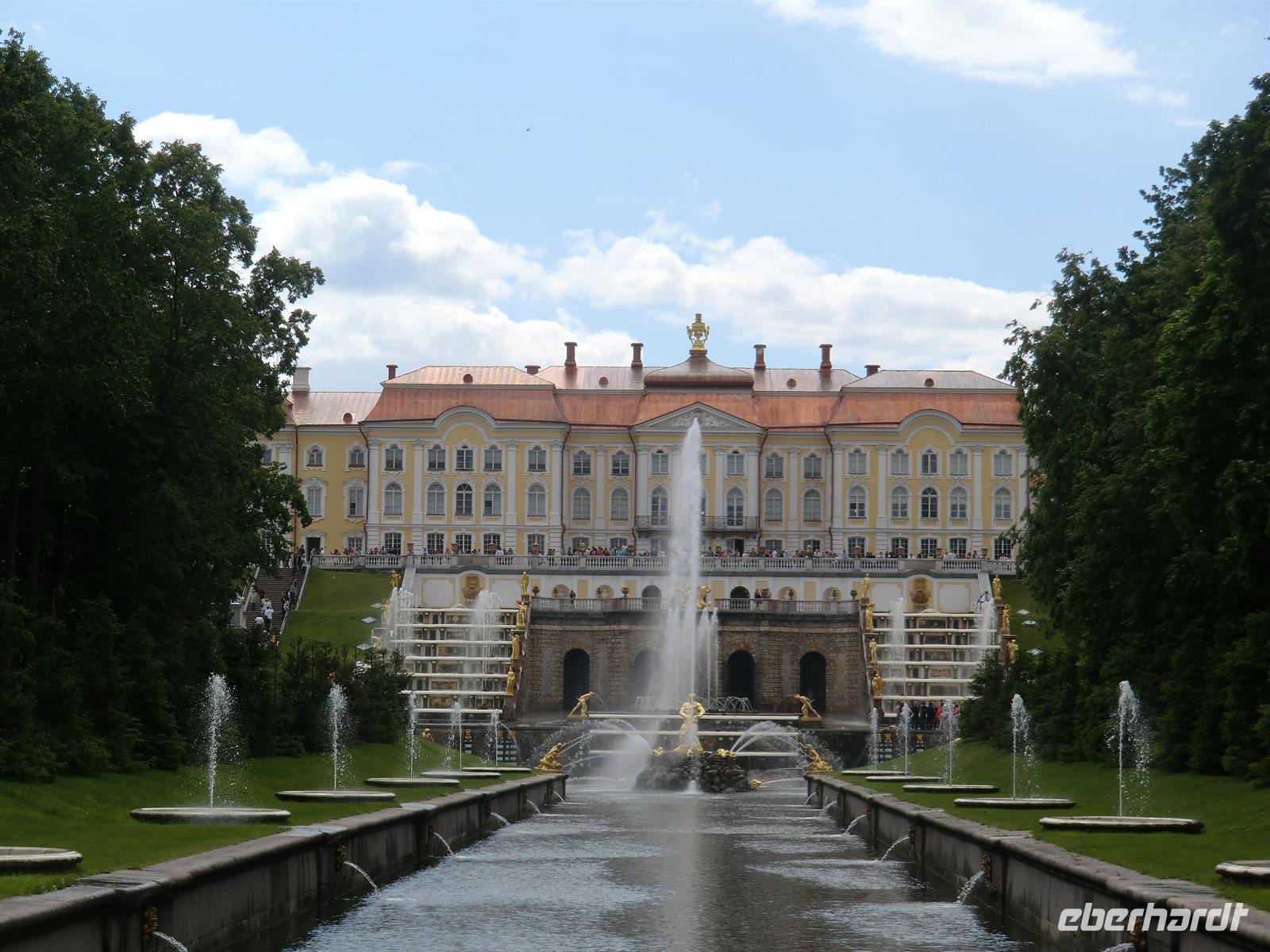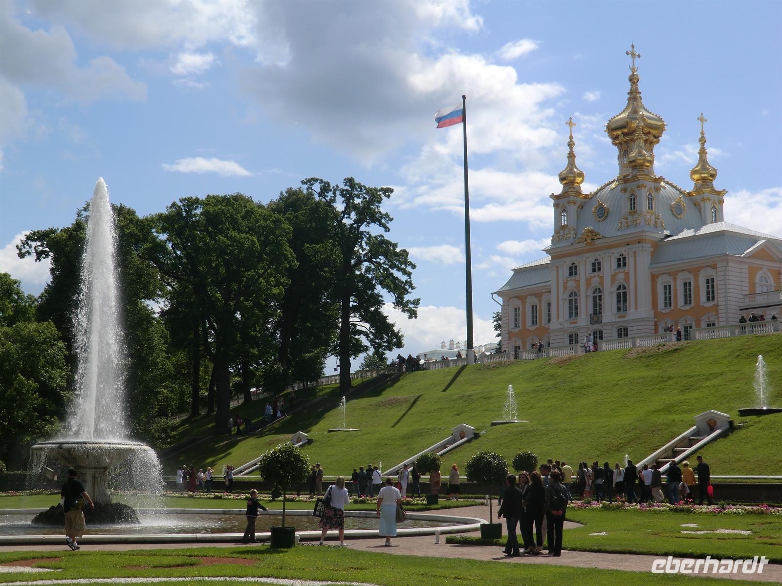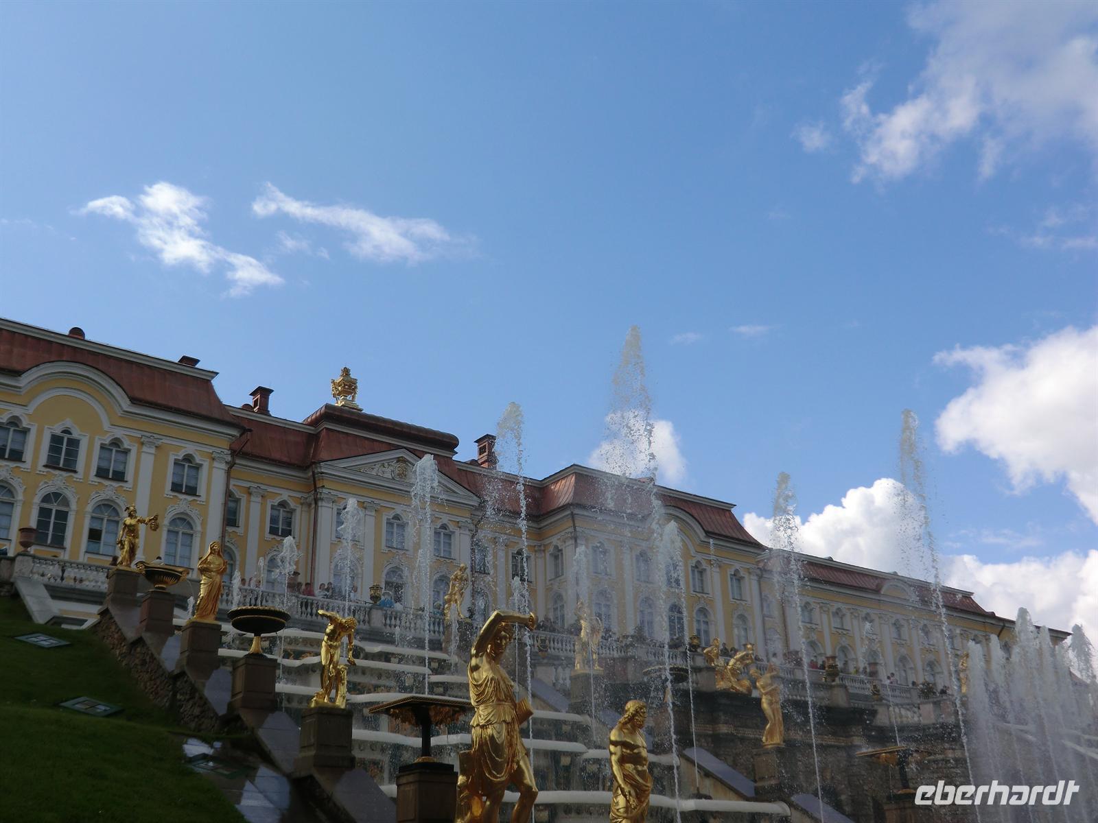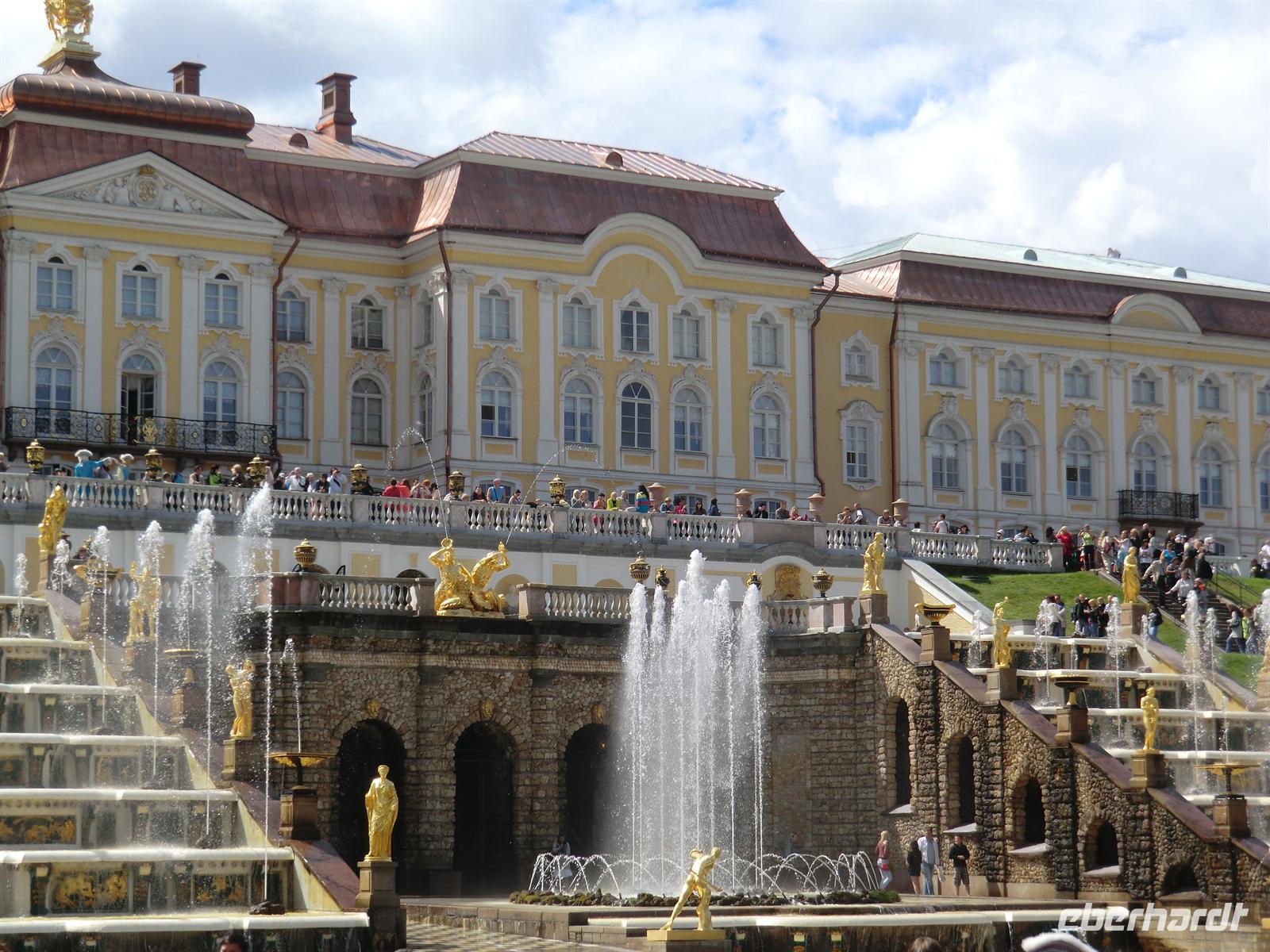 Nach einer erneuten hellen Nacht fuhren wir 9:30 Uhr bei herrlichem Sonnenschein vom Hotel in Richtung Peterhof. Unsere Fahrt führte entlang des Bolschoi Prospekt, des Handelshafens und Umleitungskanals, der früheren künstlich angelegten Stadtgrenze an den Rand der Stadt. Auf diesem Weg sahen wir außerdem das erste Kulturpalais der Stadt, das im Jahr 1927 erbaut und nach dem russischen Schriftsteller Maxim Gorki benannt wurde. Nachdem man die Innenstadt hinter sich gelassen hat, folgen großräumige Außenbezirke mit zahlreichen Wohnblocks. Angesichts eines durchschnittlichen Monatsgehalts in Höhe von 25.000 Rubel wohnen tausende Menschen in den günstigeren Wohnungen der Vorstädte. Ein Teil dieses Außenbezirks wird von Chinesen gepachtet und trägt den Namen „Baltische Perle“ oder umgangssprachlich auch „Chinatown“. Man kann angesiedelte Bauunternehmen erkennen, die sich direkt am grünen Gürtel von St. Petersburg niedergelassen haben. Entlang der „Roten Straße“ erreichten wir bald das Konstantinpalais, in welchem Russlands Regierung Galatreffen und Gremien abhält. Auch der Peterhof dient dem Präsidenten Medwedjew, sowie Putin und Co. als Lokalität offizieller Empfänge und Zusammentreffen. Das gesamte Städtchen Peterhof steht heute unter dem Schutz der UNESCO und wir kamen wenig später in den Genuss, uns von dem wertvollen kulturellen Reichtum zu überzeugen. Bei einer ausgiebigen Führung durch das Palais und die mit zahlreichen Fontainen geschmückte Parkanlage konnten wir den goldenen Prunk und die architektonischen Raffinesse genießen.