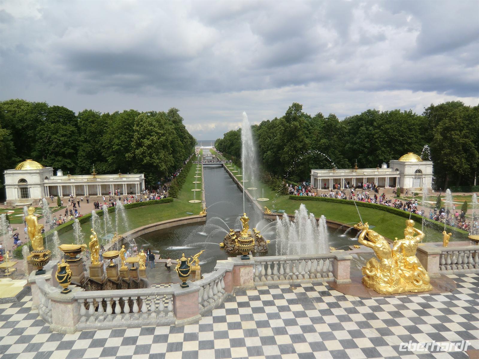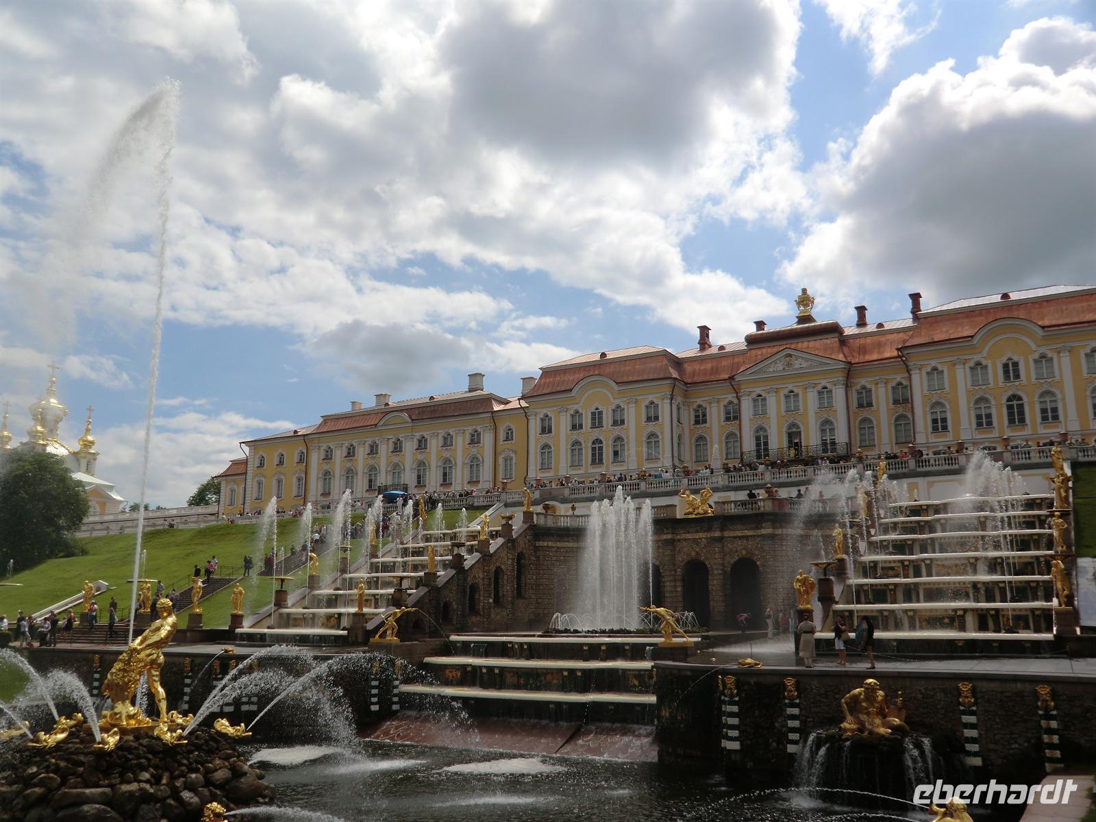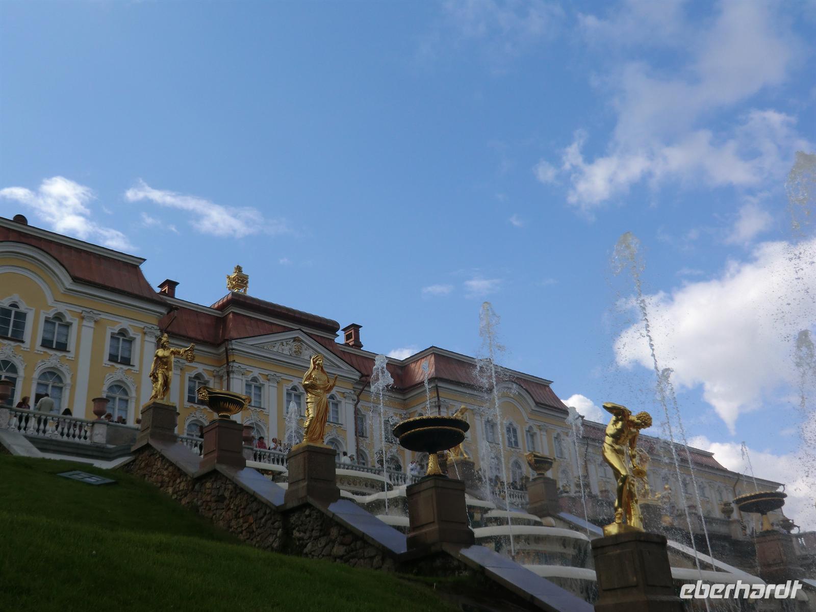 Nach einer erneuten hellen Nacht fuhren wir 9:30 Uhr bei herrlichem Sonnenschein vom Hotel in Richtung Peterhof. Unsere Fahrt führte entlang des Bolschoi Prospekt, des Handelshafens und Umleitungskanals, der früheren künstlich angelegten Stadtgrenze an den Rand der Stadt. Auf diesem Weg sahen wir außerdem das erste Kulturpalais der Stadt, das im Jahr 1927 erbaut und nach dem russischen Schriftsteller Maxim Gorki benannt wurde. Nachdem man die Innenstadt hinter sich gelassen hat, folgen großräumige Außenbezirke mit zahlreichen Wohnblocks. Angesichts eines durchschnittlichen Monatsgehalts in Höhe von 25.000 Rubel wohnen tausende Menschen in den günstigeren Wohnungen der Vorstädte. Ein Teil dieses Außenbezirks wird von Chinesen gepachtet und trägt den Namen „Baltische Perle“ oder umgangssprachlich auch „Chinatown“. Man kann angesiedelte Bauunternehmen erkennen, die sich direkt am grünen Gürtel von St. Petersburg niedergelassen haben. Entlang der „Roten Straße“ erreichten wir bald das Konstantinpalais, in welchem Russlands Regierung Galatreffen und Gremien abhält. Auch der Peterhof dient dem Präsidenten Medwedjew, sowie Putin und Co. als Lokalität offizieller Empfänge und Zusammentreffen. Das gesamte Städtchen Peterhof steht heute unter dem Schutz der UNESCO und wir kamen wenig später in den Genuss, uns von dem wertvollen kulturellen Reichtum zu überzeugen. Bei einer ausgiebigen Führung durch das Palais und die mit zahlreichen Fontainen geschmückte Parkanlage konnten wir den goldenen Prunk und die architektonischen Raffinesse genießen.