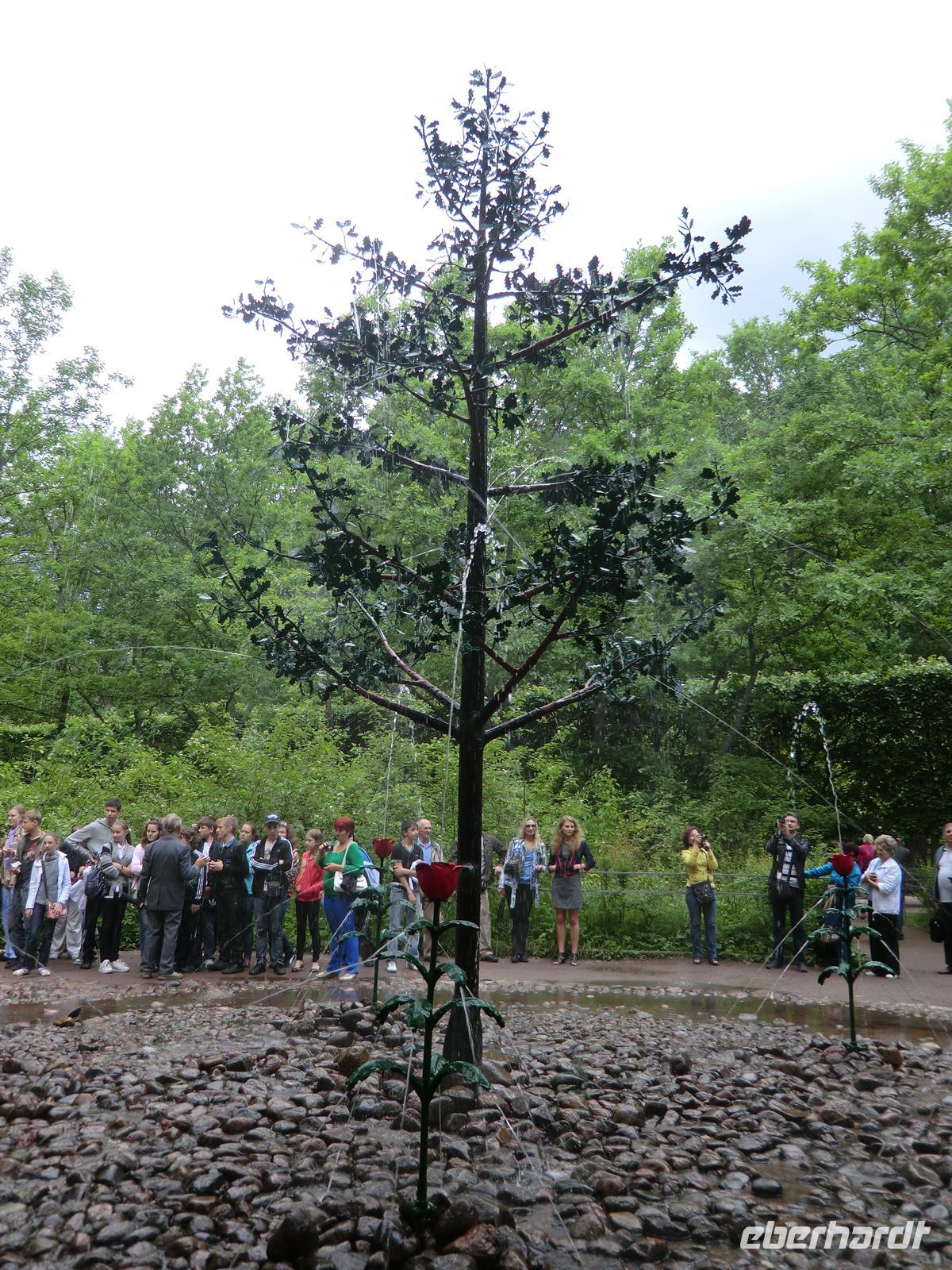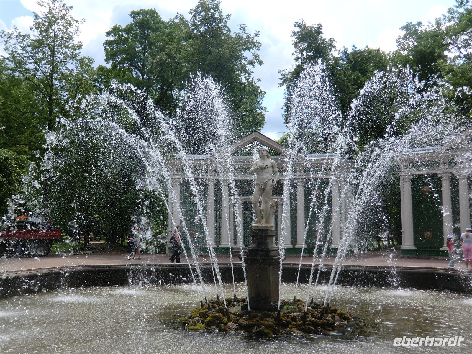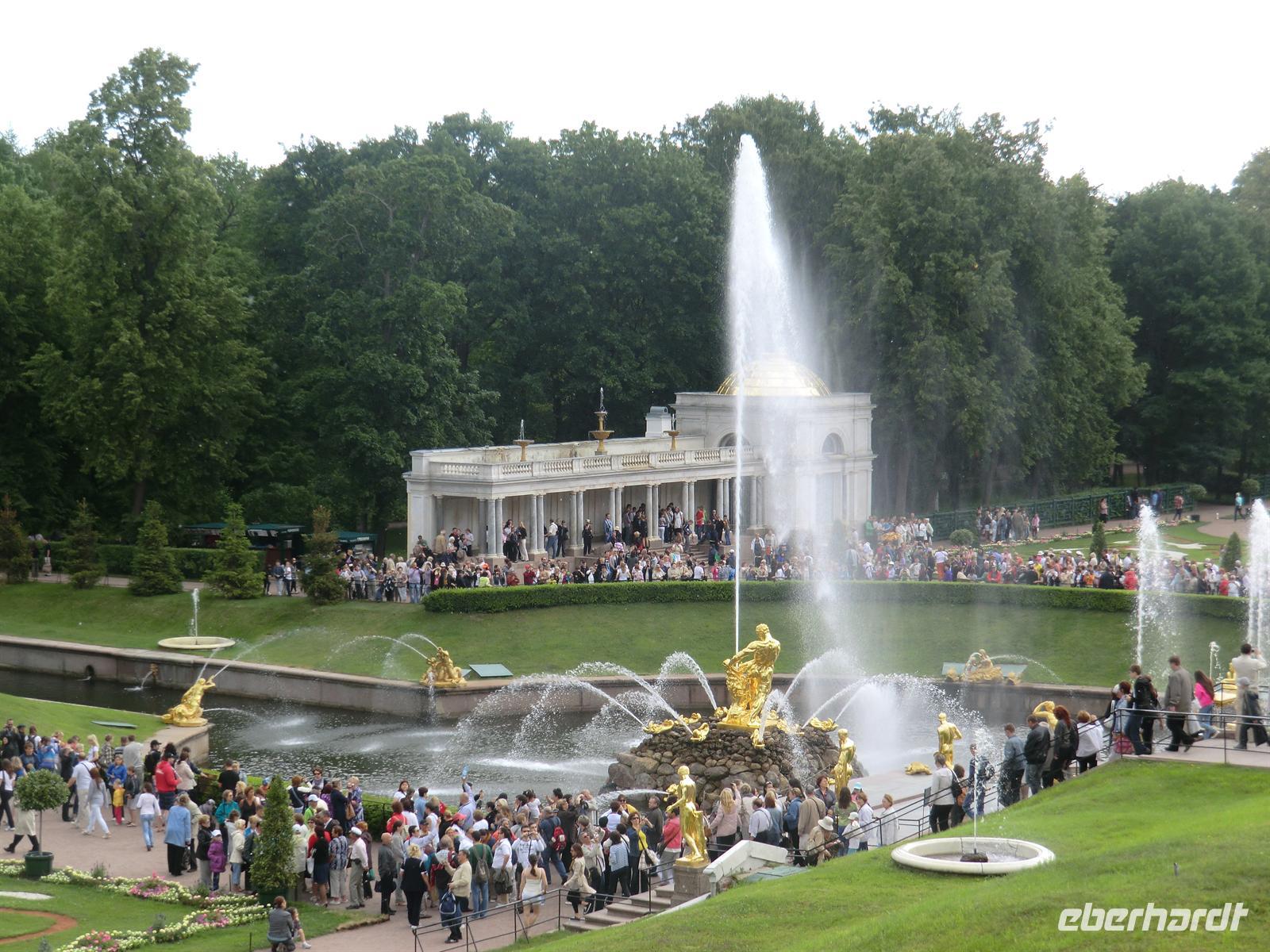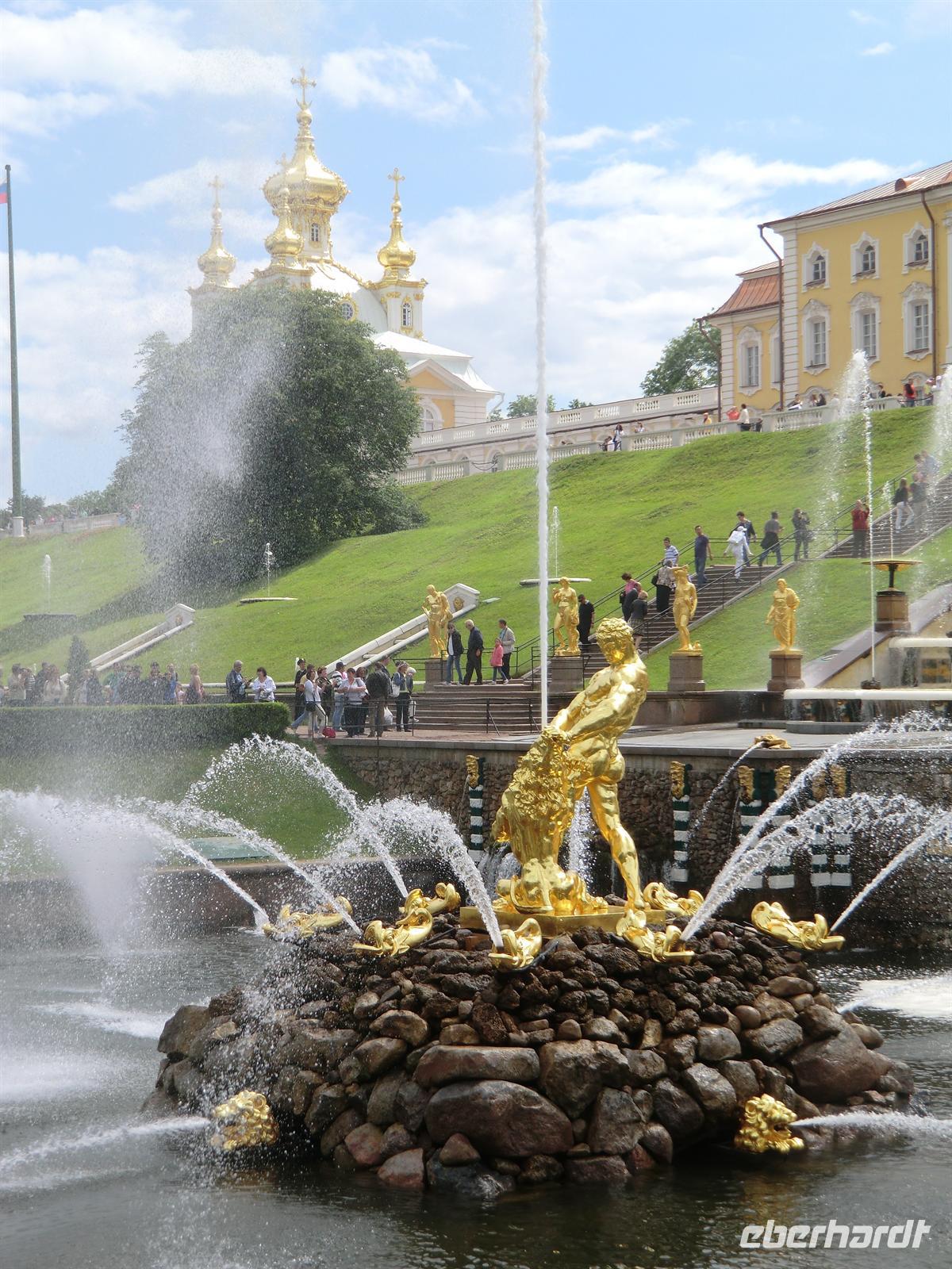 Nach einer erneuten hellen Nacht fuhren wir 9:30 Uhr bei herrlichem Sonnenschein vom Hotel in Richtung Peterhof. Unsere Fahrt führte entlang des Bolschoi Prospekt, des Handelshafens und Umleitungskanals, der früheren künstlich angelegten Stadtgrenze an den Rand der Stadt. Auf diesem Weg sahen wir außerdem das erste Kulturpalais der Stadt, das im Jahr 1927 erbaut und nach dem russischen Schriftsteller Maxim Gorki benannt wurde. Nachdem man die Innenstadt hinter sich gelassen hat, folgen großräumige Außenbezirke mit zahlreichen Wohnblocks. Angesichts eines durchschnittlichen Monatsgehalts in Höhe von 25.000 Rubel wohnen tausende Menschen in den günstigeren Wohnungen der Vorstädte. Ein Teil dieses Außenbezirks wird von Chinesen gepachtet und trägt den Namen „Baltische Perle“ oder umgangssprachlich auch „Chinatown“. Man kann angesiedelte Bauunternehmen erkennen, die sich direkt am grünen Gürtel von St. Petersburg niedergelassen haben. Entlang der „Roten Straße“ erreichten wir bald das Konstantinpalais, in welchem Russlands Regierung Galatreffen und Gremien abhält. Auch der Peterhof dient dem Präsidenten Medwedjew, sowie Putin und Co. als Lokalität offizieller Empfänge und Zusammentreffen. Das gesamte Städtchen Peterhof steht heute unter dem Schutz der UNESCO und wir kamen wenig später in den Genuss, uns von dem wertvollen kulturellen Reichtum zu überzeugen. Bei einer ausgiebigen Führung durch das Palais und die mit zahlreichen Fontainen geschmückte Parkanlage konnten wir den goldenen Prunk und die architektonischen Raffinesse genießen.