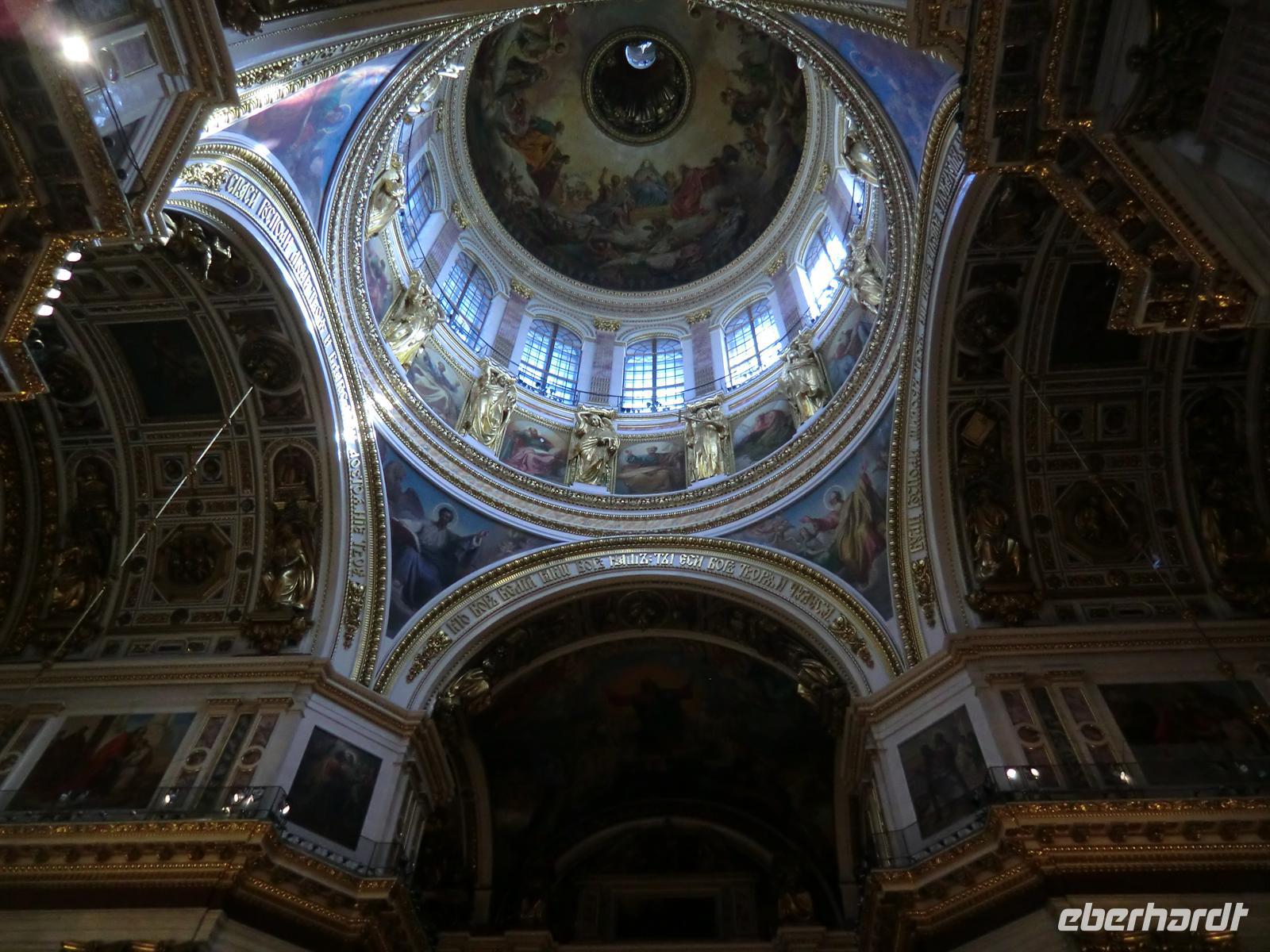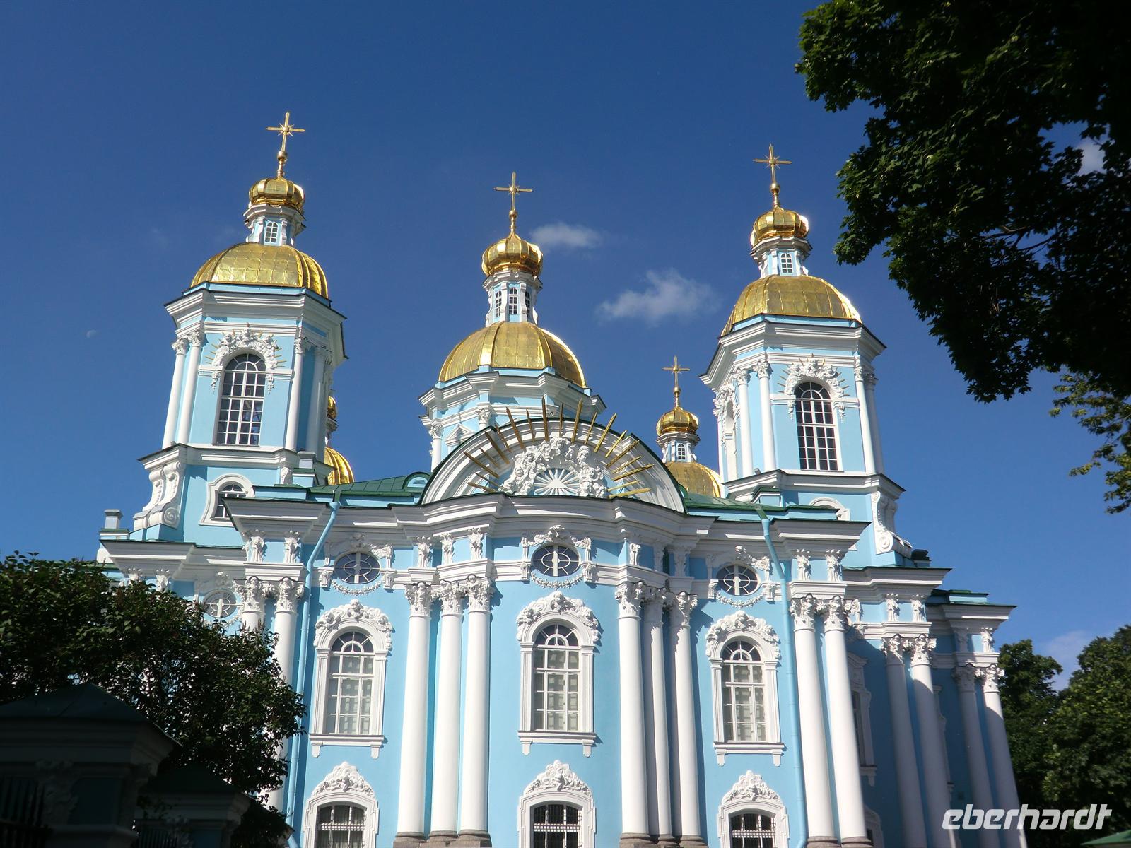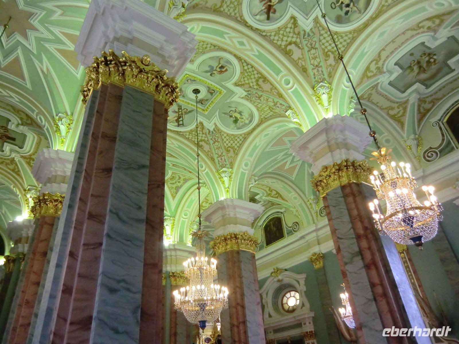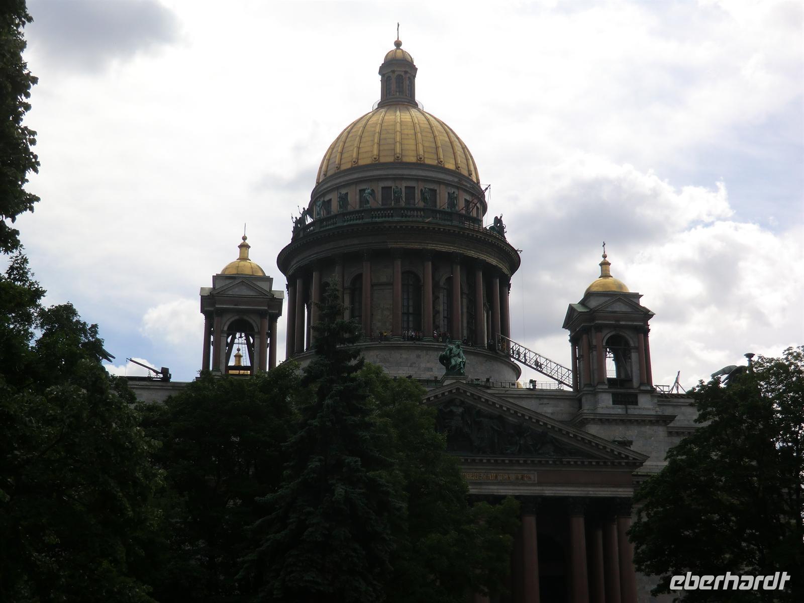 Am heutigen Tag begrüßte uns ein malerisch blauer Himmel, der einen wunderbaren Tag vermuten ließ. Nach dem Frühstück holte und Igor 10Uhr am Hotel ab, um mit uns eine Auswahl religiöser Schmuckstücke zu besuchen. Zunächst fuhren wir entlang der „Kussbrücke“, des Theaterplatzes und des ältesten Konservatoriums Russlands in Richtung Innenstadt und machten nach einer kurzen Fahrt Halt an der St. Nikolai Kirche. Dort hatten wir das Glück, einer russisch orthodoxen Messe beizuwohnen, die durch Weihrauch und Chorgesang untermalt wurde. Ein nächster Höhepunkt war die Besichtigung der Isaakskathedrale, deren vergoldete Kuppel einen wahren Blickfang darstellt. Bei einem Blick in die Spitze der Kuppel, die durch die Darstellung des Heiligen Geistes gekrönt ist, wurden uns im Inneren der Kathedrale die Ausmaße des Innenraumes umso mehr bewusst. Im Anschluss an diesen eindrucksvollen Besuch suchten einige Gäste das Hauptpostamt der Stadt auf. Briefkästen und Postämter sind in St. Petersburg Mangelware und so waren wir sehr erleichtert als die fleißig geschriebenen Kärtchen in den Schlitz des hellblauen Kastens vor dem Haupteingang der Post auf den Weg nach Deutschland geschickt werden konnten.