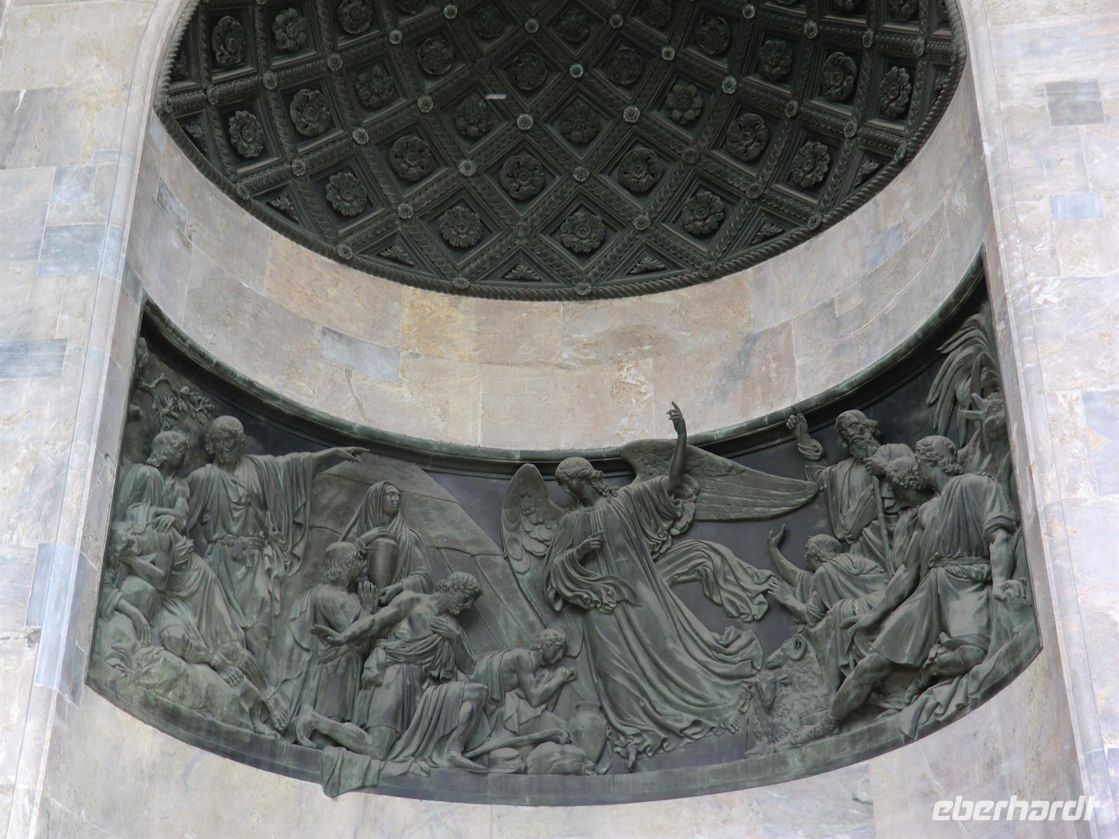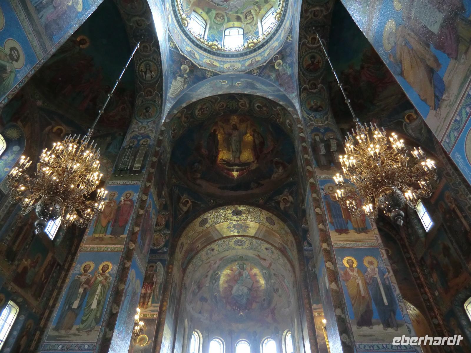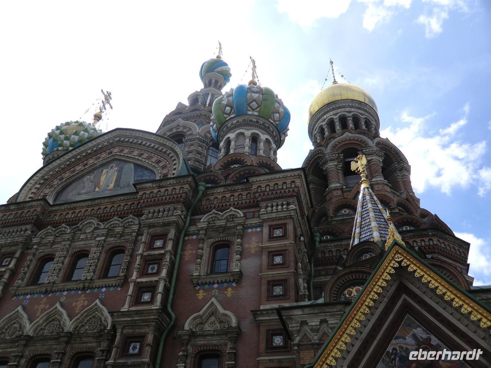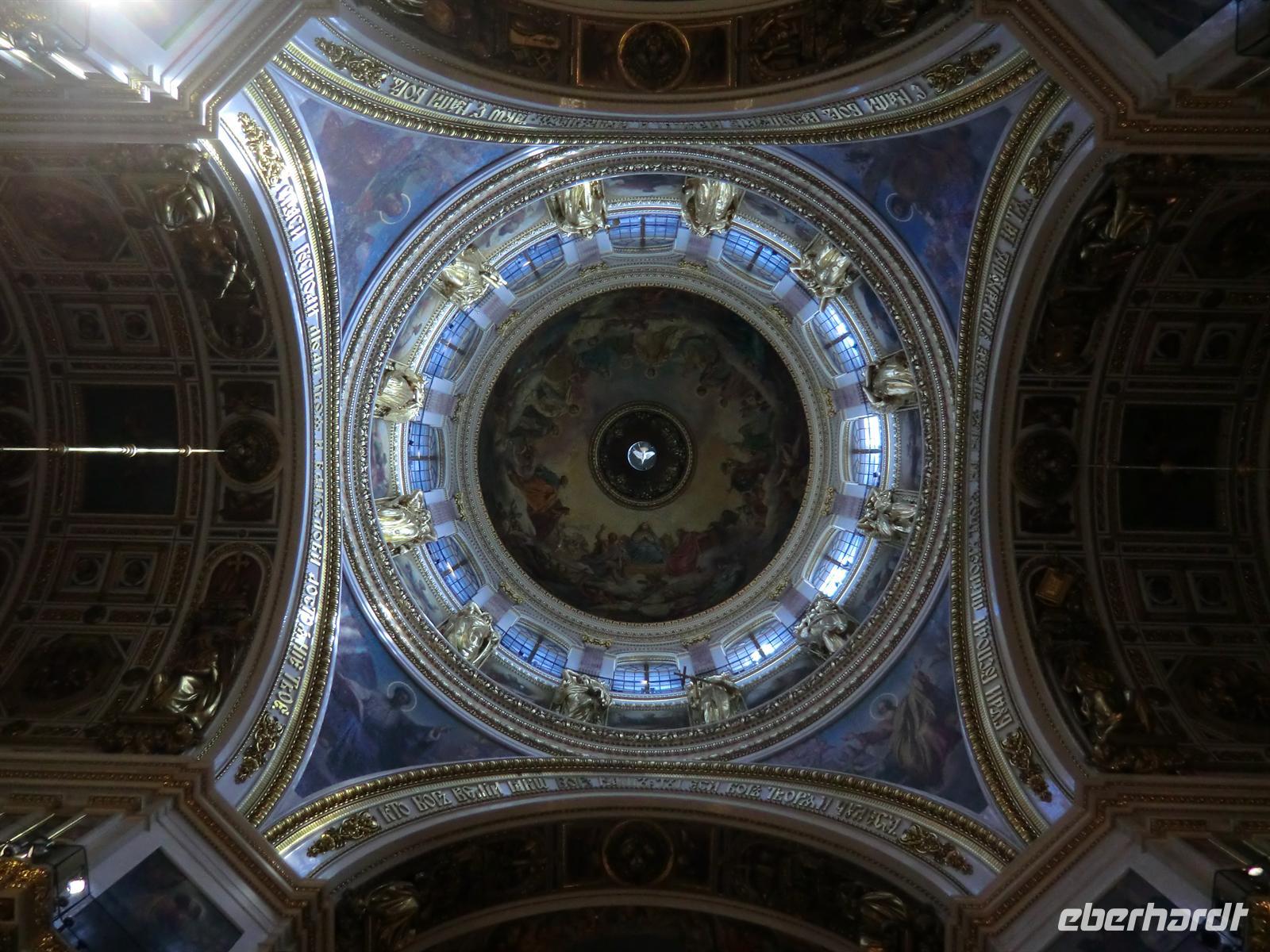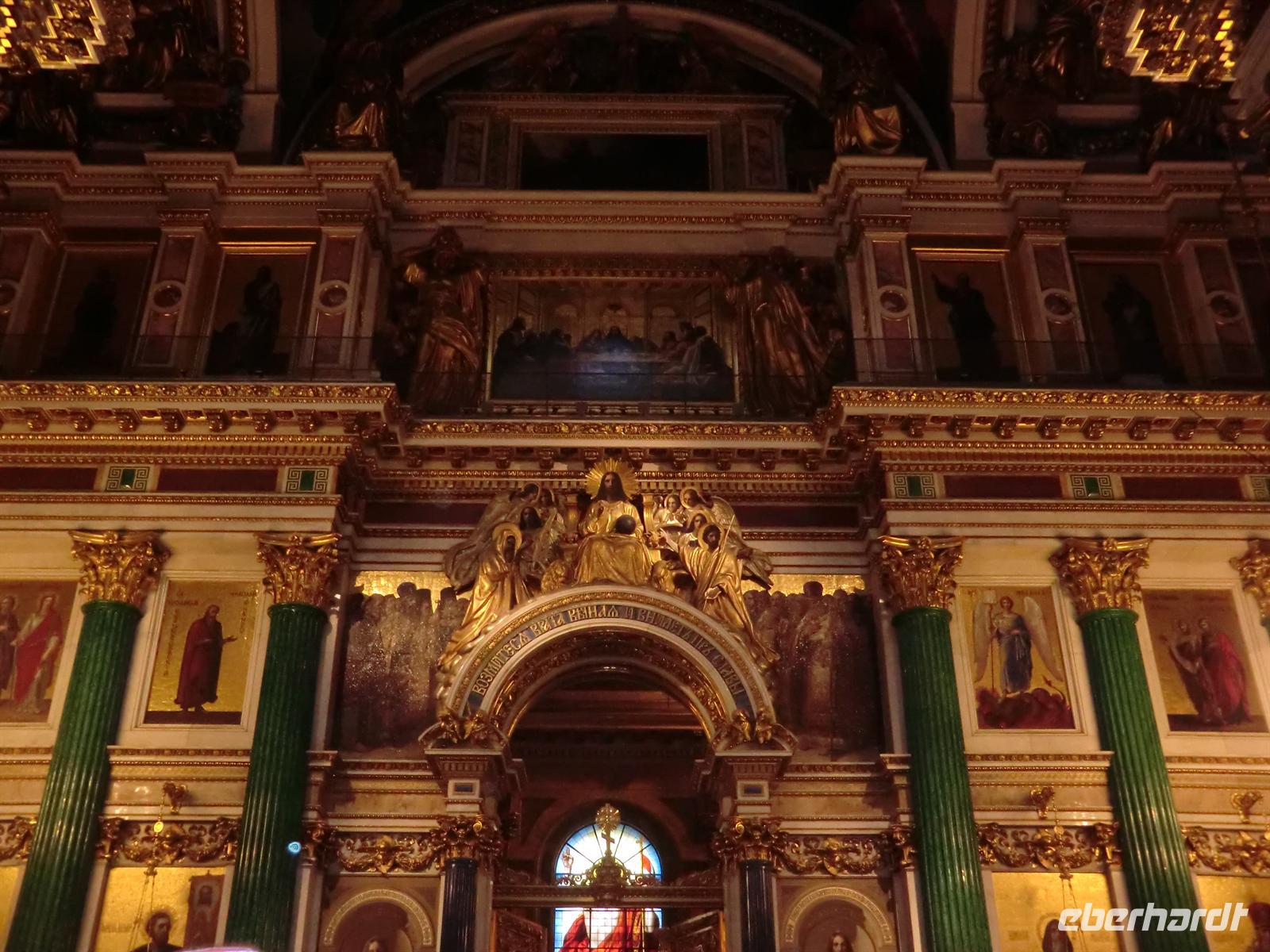 Am heutigen Tag begrüßte uns ein malerisch blauer Himmel, der einen wunderbaren Tag vermuten ließ. Nach dem Frühstück holte und Igor 10Uhr am Hotel ab, um mit uns eine Auswahl religiöser Schmuckstücke zu besuchen. Zunächst fuhren wir entlang der „Kussbrücke“, des Theaterplatzes und des ältesten Konservatoriums Russlands in Richtung Innenstadt und machten nach einer kurzen Fahrt Halt an der St. Nikolai Kirche. Dort hatten wir das Glück, einer russisch orthodoxen Messe beizuwohnen, die durch Weihrauch und Chorgesang untermalt wurde. Ein nächster Höhepunkt war die Besichtigung der Isaakskathedrale, deren vergoldete Kuppel einen wahren Blickfang darstellt. Bei einem Blick in die Spitze der Kuppel, die durch die Darstellung des Heiligen Geistes gekrönt ist, wurden uns im Inneren der Kathedrale die Ausmaße des Innenraumes umso mehr bewusst. Im Anschluss an diesen eindrucksvollen Besuch suchten einige Gäste das Hauptpostamt der Stadt auf. Briefkästen und Postämter sind in St. Petersburg Mangelware und so waren wir sehr erleichtert als die fleißig geschriebenen Kärtchen in den Schlitz des hellblauen Kastens vor dem Haupteingang der Post auf den Weg nach Deutschland geschickt werden konnten.