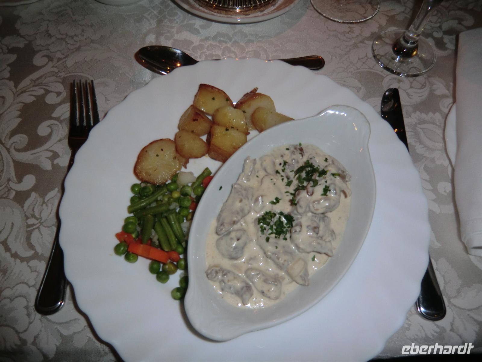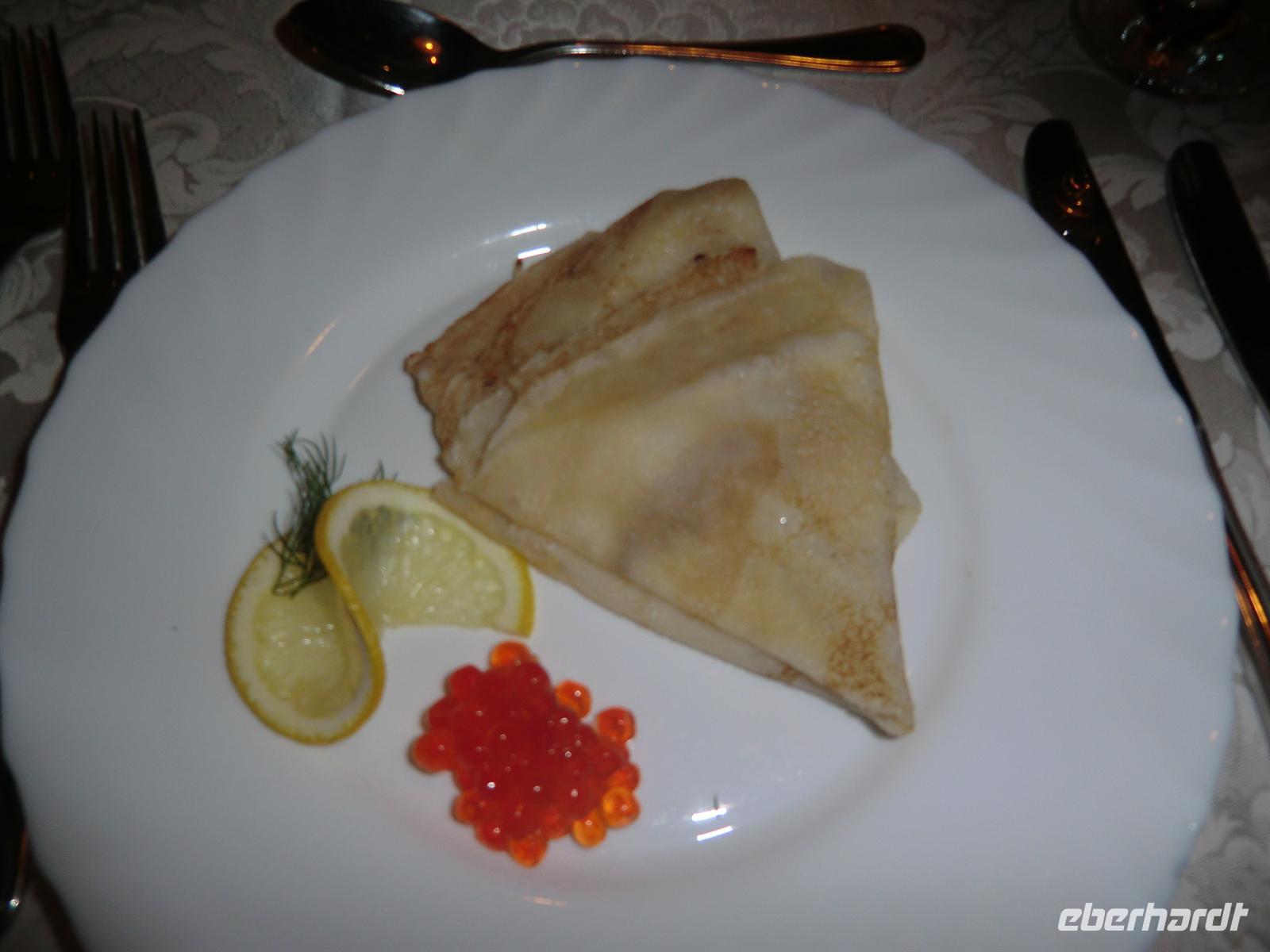 Der Rest des Tages stand im Zeichen des Kunstgenusses, denn zur Mittagszeit betrachteten wir die prunkvollen Hallen der legendären Eremitage. Igor führte uns fachmännisch durch die zahlreichen Säle und präsentierte uns eine Auswahl an Schmuckstücken. Nach einer kleinen Kaffeepause folgte der zweite Teil der Führung bis wir uns 16:30 nach der Abholung durch Sergej am Schlossplatz wieder in Richtung Hotel bewegten. Nachdem wir die erschöpften Beine ein Weilchen auf unseren Zimmern hochlegen konnten, trafen wir uns 18:30 Uhr zum gemeinsamen Abendessen im Hotelrestaurant. Erneut konnten wir leckere russische Köstlichkeiten vom Buffet genießen.