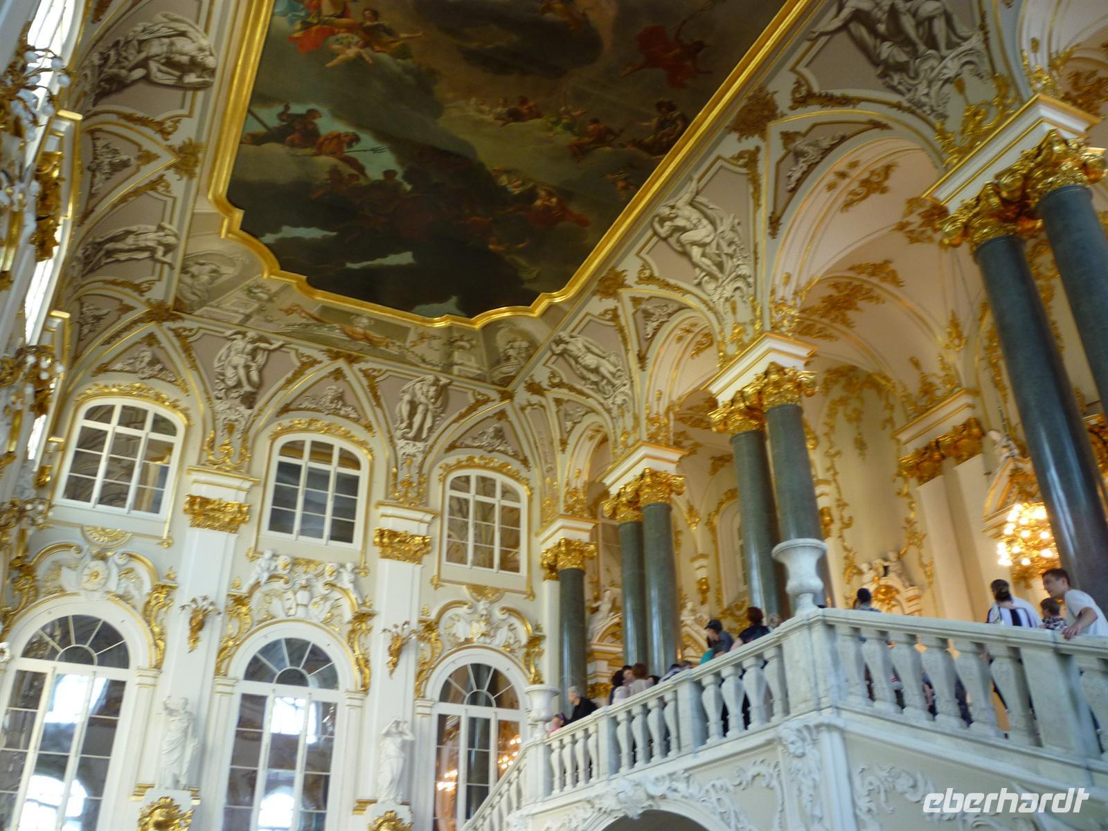 Gestärkt durch das reichhaltige Frühstück machten wir uns auf den Weg Richtung Eremitage. Die Eremitage war seit Katharina der Großen der Winterpalast eines jeden Zaren und jeder Zarin. Der Winterpalast, die Kleine und Alte und Neue Eremitage sowie das Generalstabsgebäude bilden dieses großartige Museum. „Es würde ungefähr 9 Jahre dauern, auch nur einen kurzen Blick auf jedes der 2,7 Millionen Werke, von denen nur etwa 65000 Ausstellungsstücke in den unendlichen Gängen des Museums mit seinen 1000 Räumen ausgestellt werden“ - aus dem Buch:“1000 Plätze die Du vor Deinem Tod gesehen haben musst“