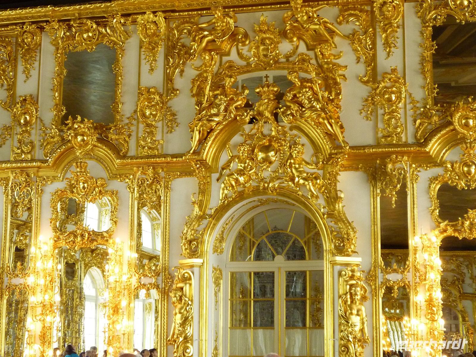 Sie ist die größte Kirche in Sankt Petersburg. Ihre Kuppel mit 100 Kilogramm Gold glänzte in der Sonne. Ein wunderschönes Fotomotiv erwartete uns. Desweiteren besichtigten wir die Auferstehungskirche, auch „Blutkirche“ genannt. Die Geschichte der Kirche ist sehr wechselhaft. Als Denkmal und als ein Gotteshaus konzipiert, diente sie nie sakralen Zwecken. Sie wurde als Museum, Konzerthalle und später als Theater genutzt. Nach umfangreichen Renovierungsarbeiten wurde sie als Museum wieder eröffnet. Die Vielzahl der farbigen Kuppeln beeindruckte uns sehr. Das schöne Wetter sorgte ebenfalls für sehr schöne Fotomotive. Anschließend ging es mit der Metro durch Sankt-Petersburger-Unterwelt. Am Bauernmarkt, dessen Markthalle immer frisches Gemüse, Obst und russische Produkt anbietet, endete unsere Fahrt. Hier hatte man die Möglichkeit, russische Produkte zu kosten sowie als Souvenir mitzunehmen. Am Nachmittag erwartete uns der nächste Höhepunkt. Wir besichtigten mit Natalia den Katharinen-Palast mit dem legendären Bernsteinzimmer. Er wurde fasst vollständig im 2. Weltkrieg zerstört. Viele Spekulationen gibt es über das Verschwinden des Bernsteinzimmers.