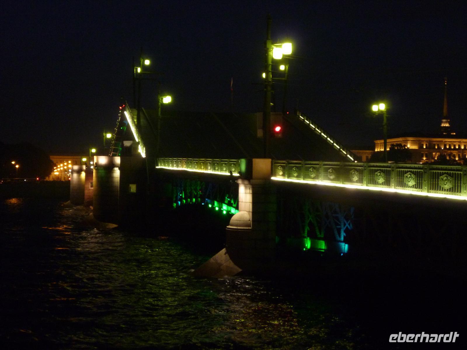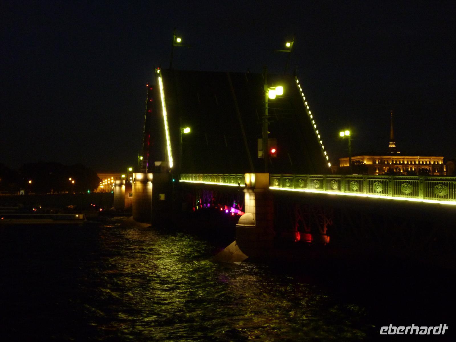 Am Abend trafen wir uns zur Lichterfahrt durch die Stadt und bestaunten die hochgezogenen Brücken bei Nacht. Es war ein schöner Ausklang des Tages, bei Beleuchtung die vielen Brücken in St. Petersburg zu sehen.