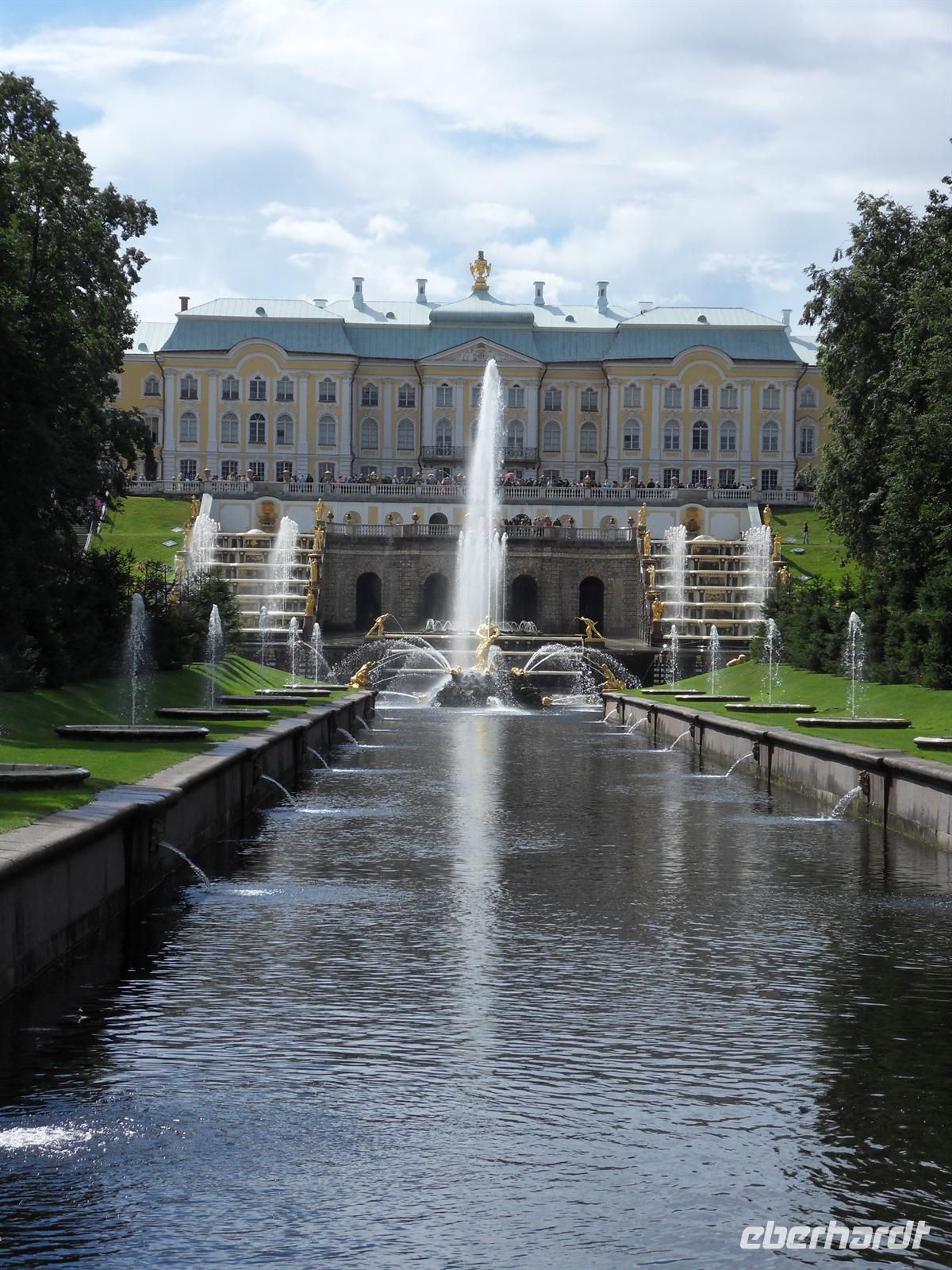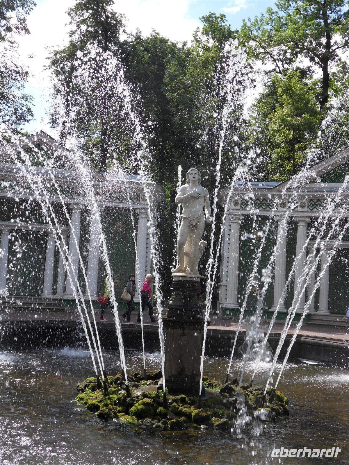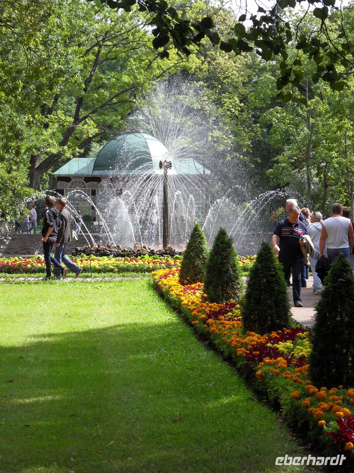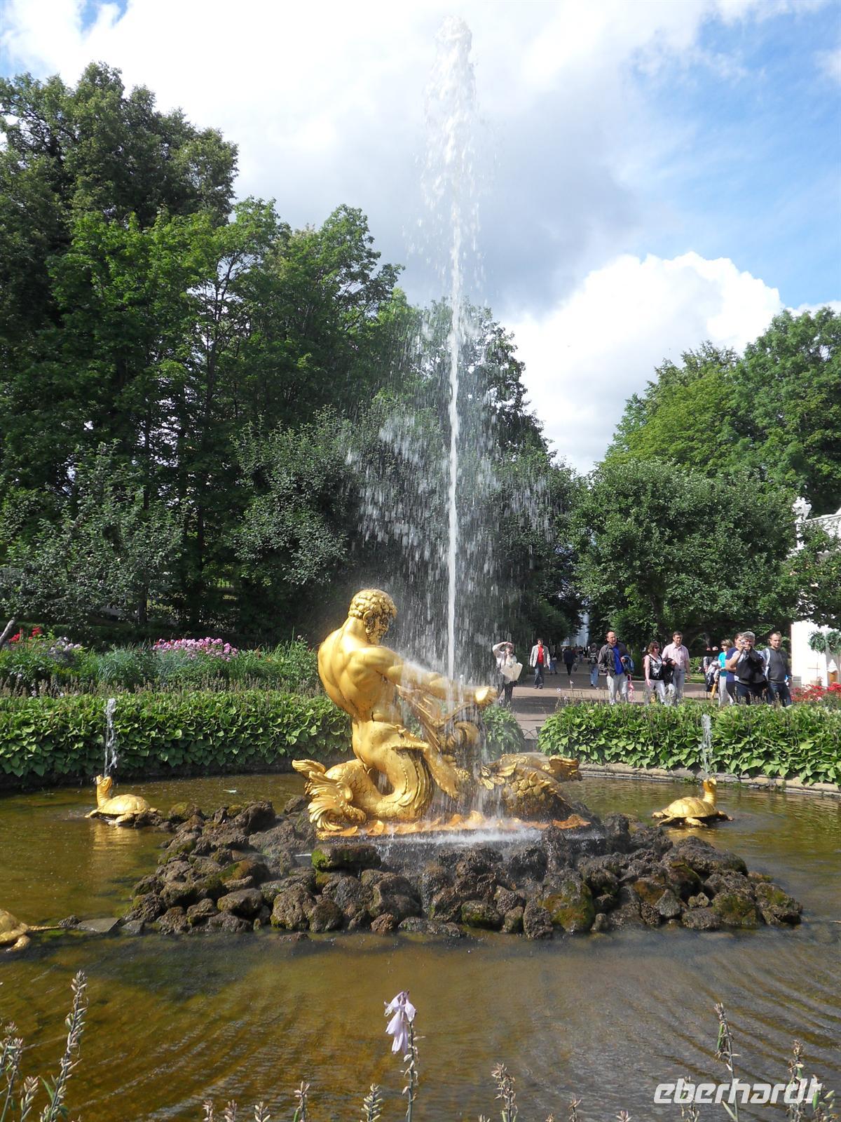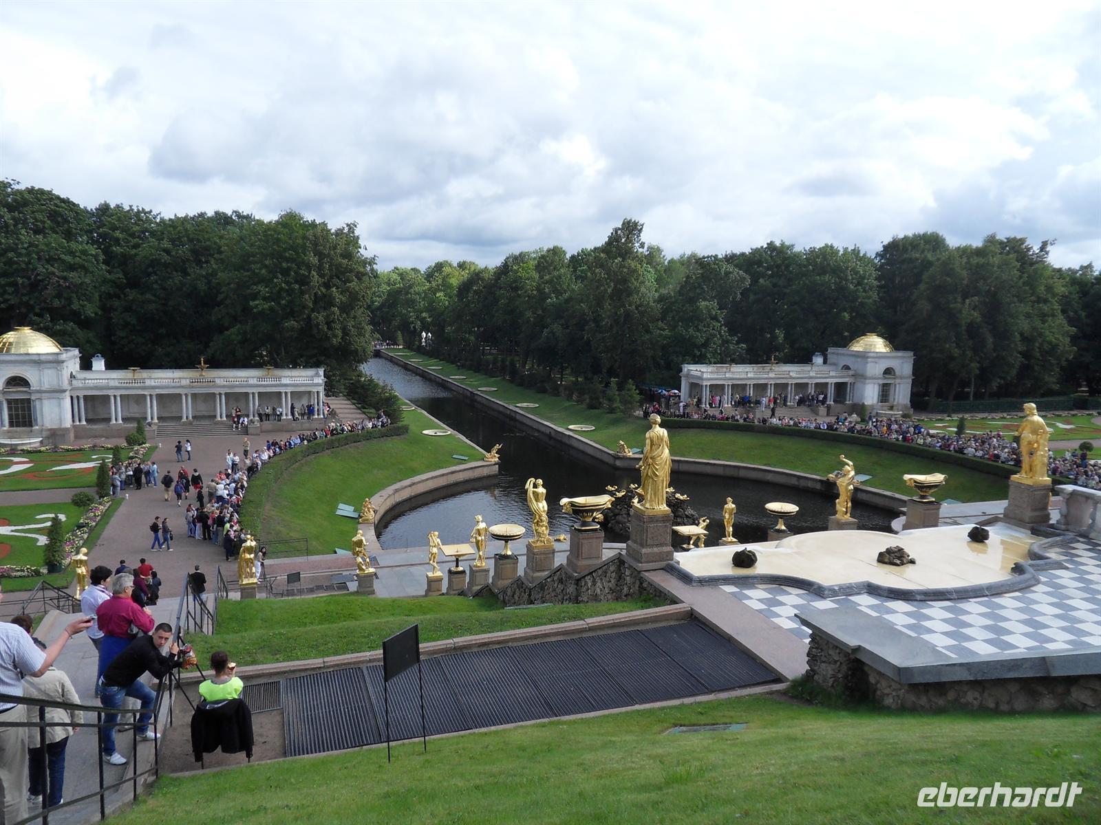Danach spazierten wir durch die riesige Parkanlage mit ihren zahlreichen Wasserspielen und Fontänen. Zunächst gingen wir an der Großen Kaskade vorbei hinunter zum Finnischen Meerbusen und dem Schloss „Monplaisir“. Von hier aus konnten wir die goldene Kuppel der Isaak-Kathedrale am Horizont erkennen. Danach ging es weiter vorbei an wunderschön gepflegten Blumen, Hecken und Gartenanlagen zur Sonnenfontäne, den Vogelhaus und der Pyramidenfontäne. Unterwegs trafen wir auf ein paar Wasserspiele, die uns zum Teil etwas nass machten, je nachdem, ob man auf den falschen Stein getreten war. An der Schachbrettkaskade beendeten wir den gemeinsamen Rundgang, so dass wir uns an den Souvenirständen umschauen oder auf einen Kaffee in die Orangerie gehen konnten. Wer sich durch die basarähnlichen Stände voll mit Andenken kämpfen konnte, erreichte dann auch wieder unseren Bus, mit dem wir zurück nach St.Petersburg fuhren. Einige unserer Gäste fuhren aber auch mit dem Boot zurück nach St.Petersburg, was ca. 30 Minuten dauerte. Den Abend ließen wir dann nach einem Zwischenstopp im Hotel mit einer Lichterfahrt durch St. Petersburg ausklingen.