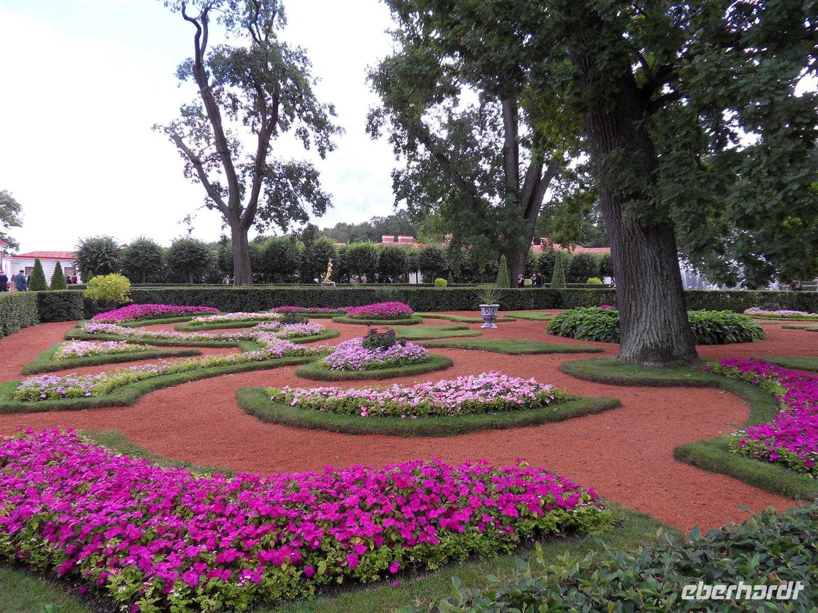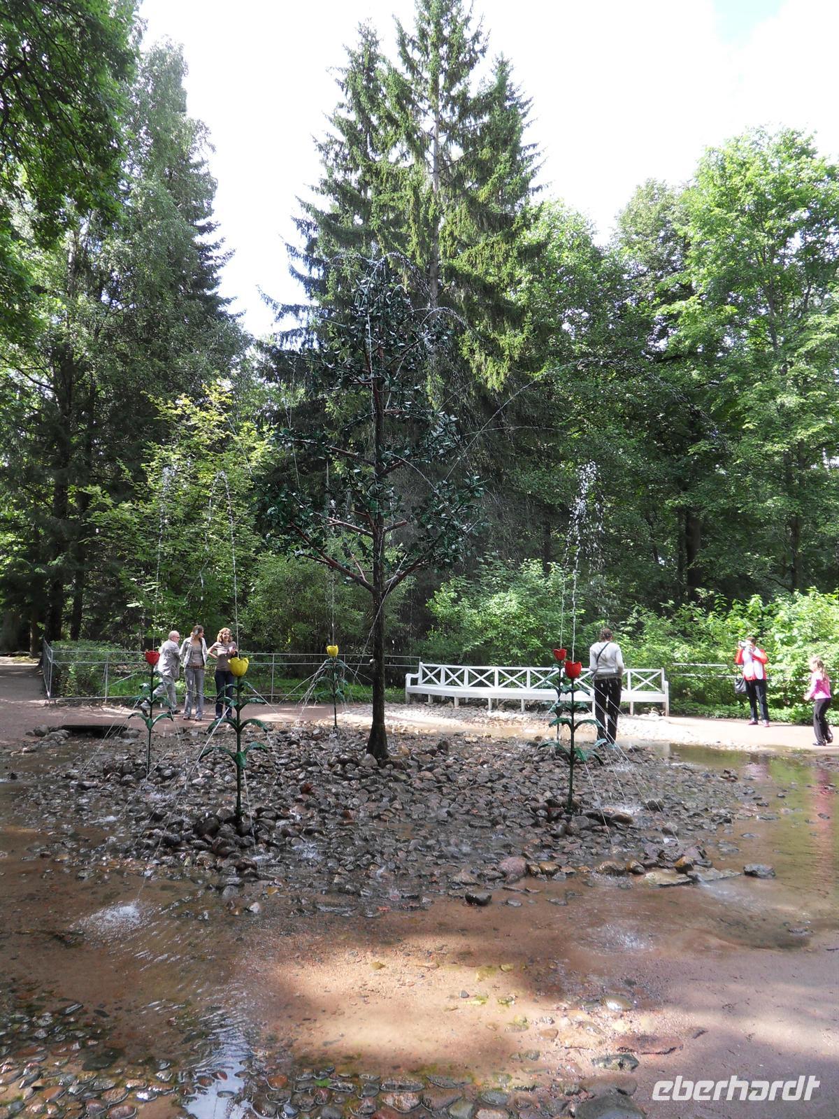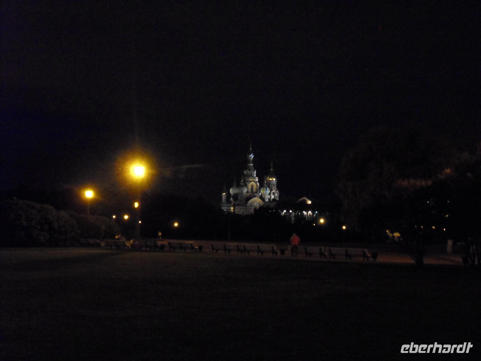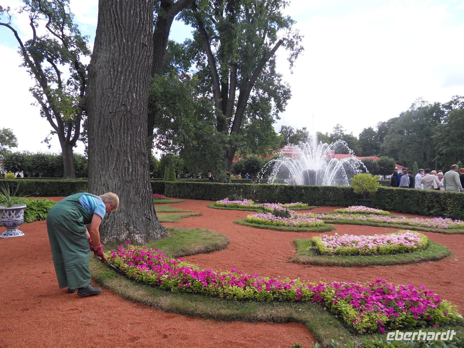 Danach spazierten wir durch die riesige Parkanlage mit ihren zahlreichen Wasserspielen und Fontänen. Zunächst gingen wir an der Großen Kaskade vorbei hinunter zum Finnischen Meerbusen und dem Schloss „Monplaisir“. Von hier aus konnten wir die goldene Kuppel der Isaak-Kathedrale am Horizont erkennen. Danach ging es weiter vorbei an wunderschön gepflegten Blumen, Hecken und Gartenanlagen zur Sonnenfontäne, den Vogelhaus und der Pyramidenfontäne. Unterwegs trafen wir auf ein paar Wasserspiele, die uns zum Teil etwas nass machten, je nachdem, ob man auf den falschen Stein getreten war. An der Schachbrettkaskade beendeten wir den gemeinsamen Rundgang, so dass wir uns an den Souvenirständen umschauen oder auf einen Kaffee in die Orangerie gehen konnten. Wer sich durch die basarähnlichen Stände voll mit Andenken kämpfen konnte, erreichte dann auch wieder unseren Bus, mit dem wir zurück nach St.Petersburg fuhren. Einige unserer Gäste fuhren aber auch mit dem Boot zurück nach St.Petersburg, was ca. 30 Minuten dauerte. Den Abend ließen wir dann nach einem Zwischenstopp im Hotel mit einer Lichterfahrt durch St. Petersburg ausklingen.