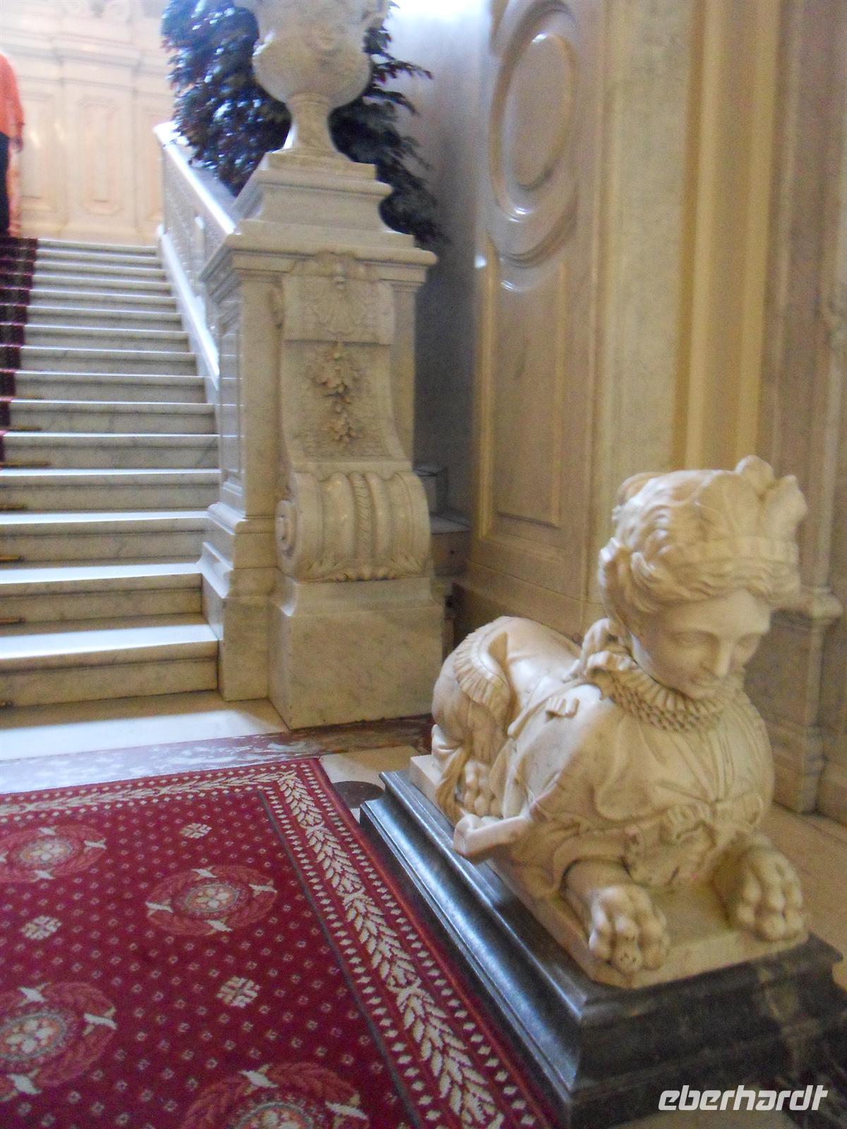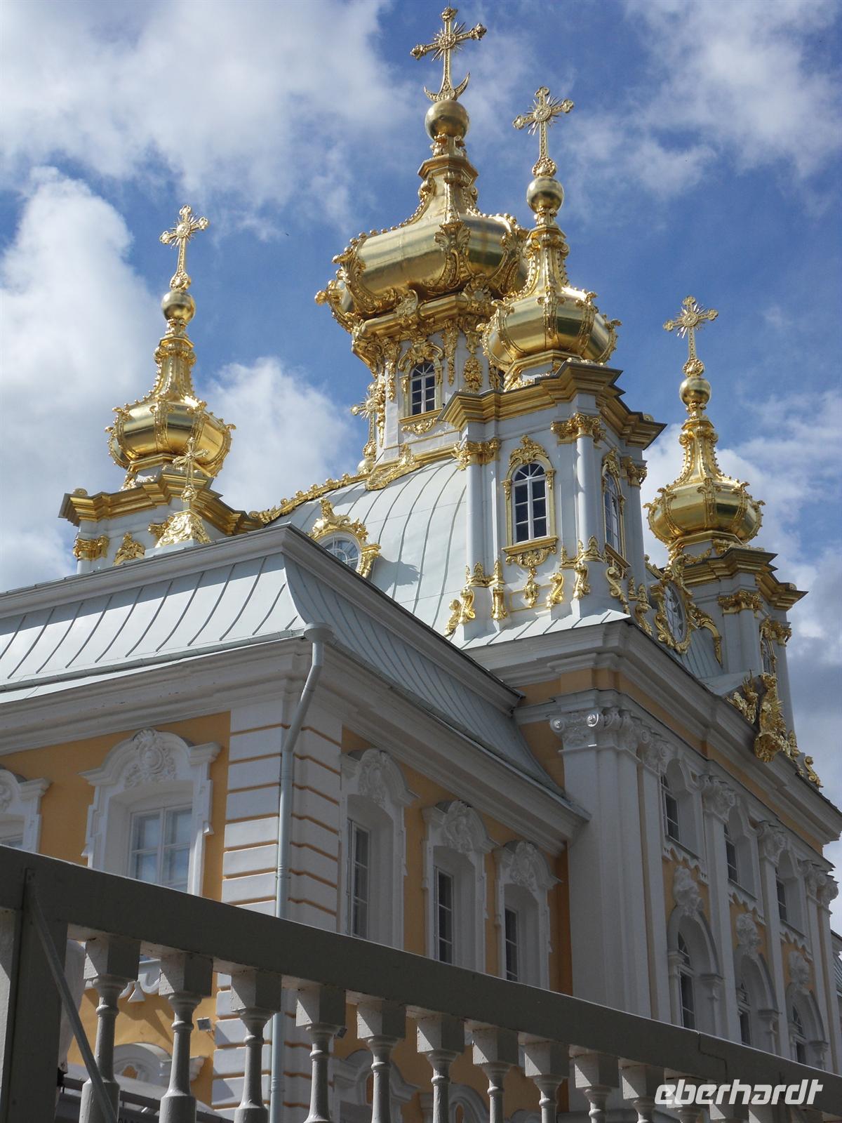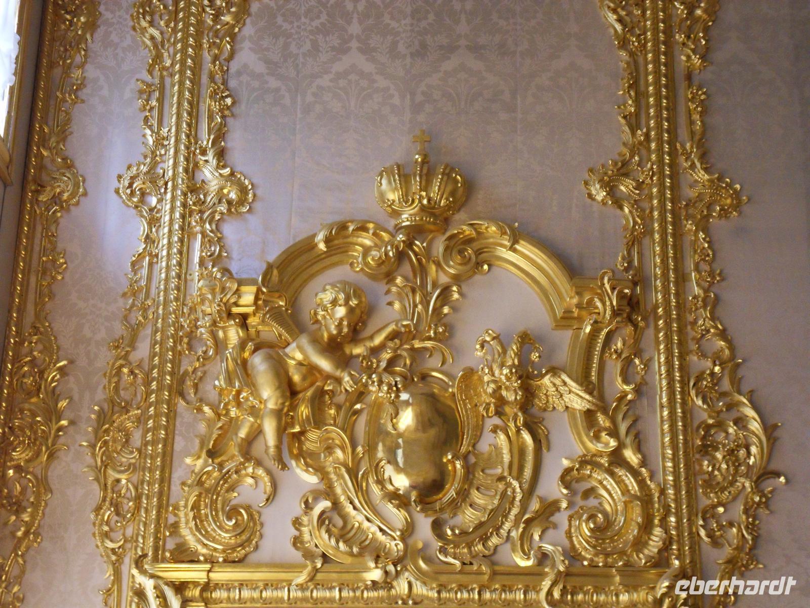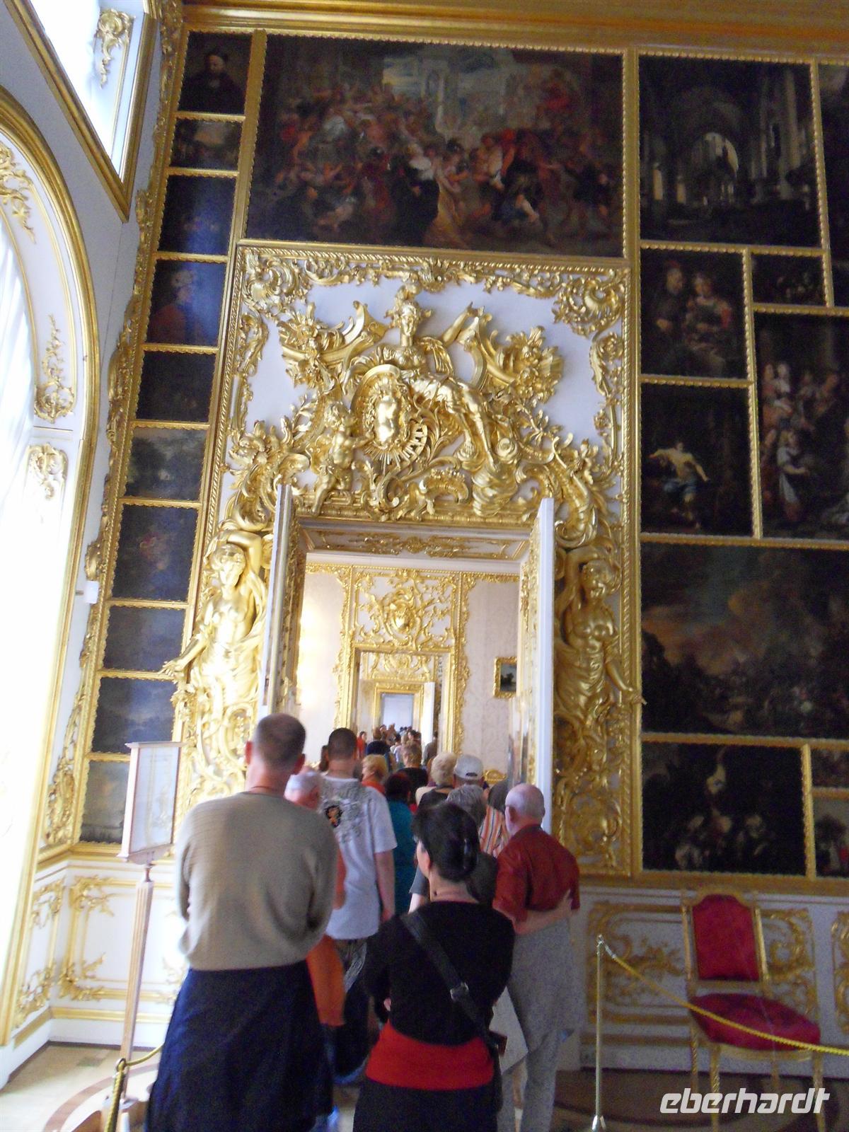Heute geht es nach Peterhof. Auf dem Weg dorthin erklärt uns Natalia einiges über den revolutionären Zaren, der die französische Sprache förderte und die Kartoffel einführte. Heute hat Peterhof 100.000 Einwohner, was wir uns aber auf Grund der idyllischen Lage kaum vorstellen können. Wir beginnen mit der Besichtigung des großen Palastes, doch leider haben heute viele Gruppen das Gleiche vor, weswegen wir auf den Einlass warten müssen. Doch das Warten lohnte sich in jedem Fall! Nachdem wir unsere Straßenschuhe mit Überziehern versehen hatten, damit wir die kostbaren Böden nicht beschädigen, bestaunten wir den prächtig ausgestatteten Palast mit seinen großen Sälen, gemäldeverzierten Decken, Porzellan, Vasen, Spiegeln und anderen goldverzierten Räumen.