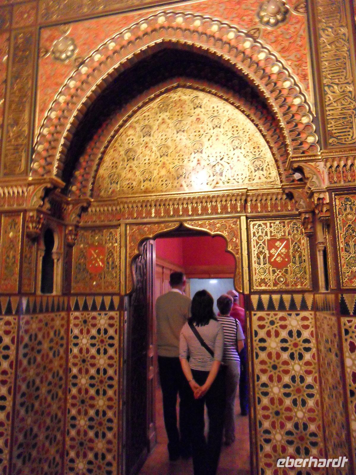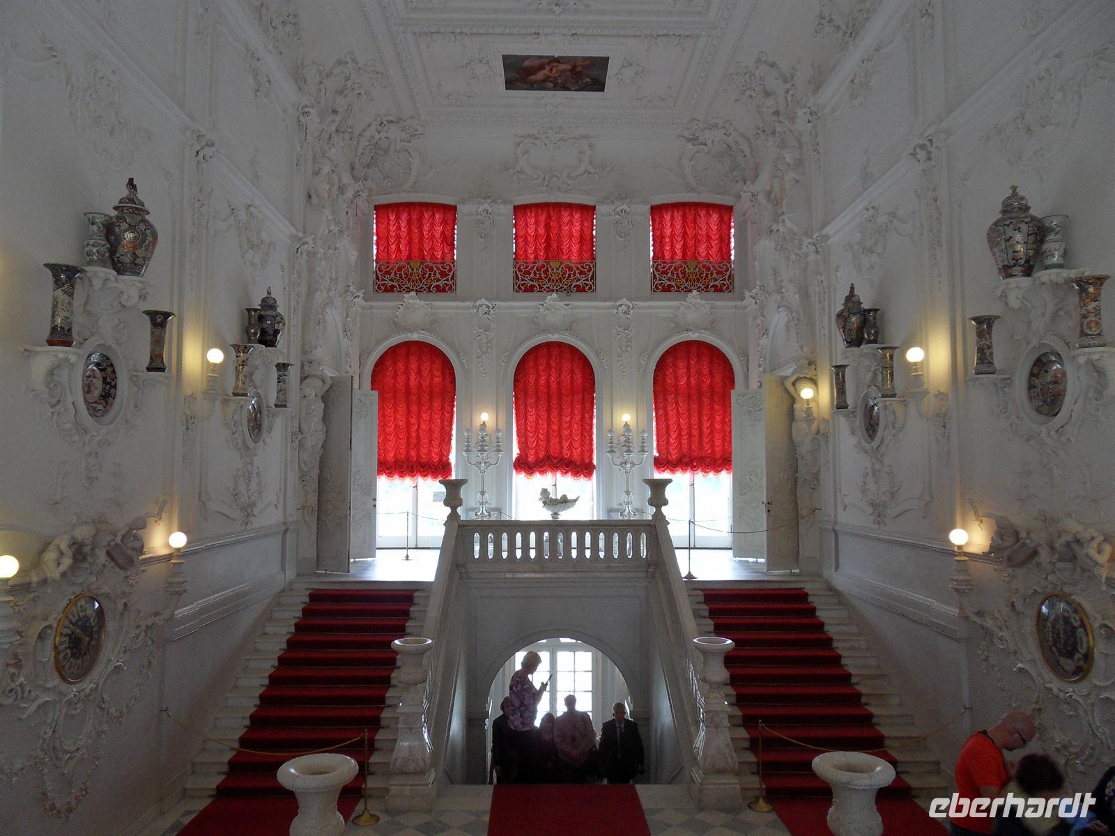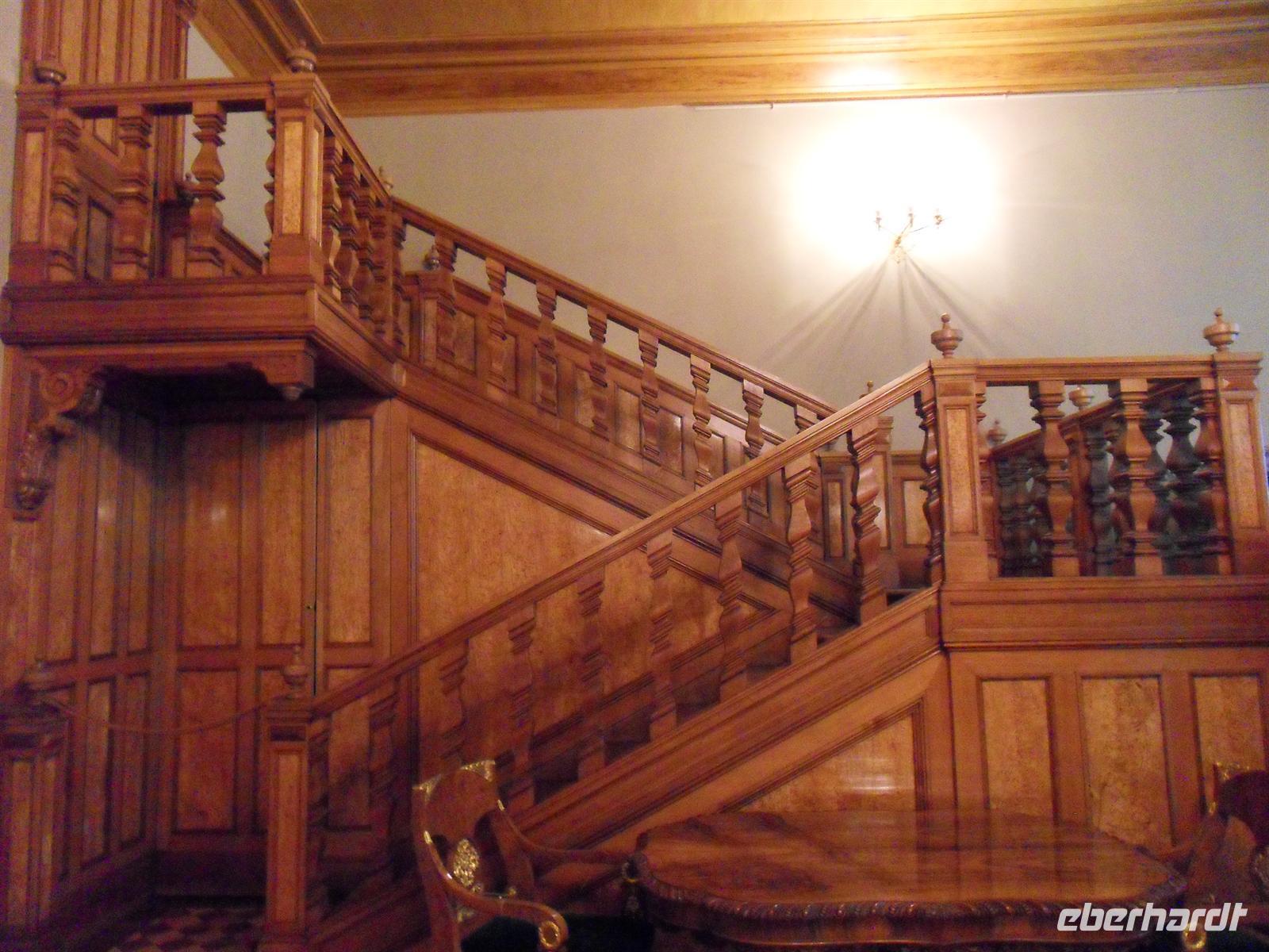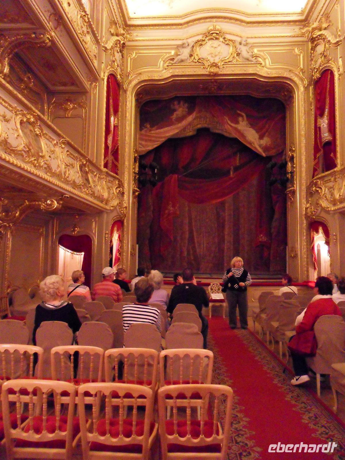 Heute geht es nach Peterhof. Auf dem Weg dorthin erklärt uns Natalia einiges über den revolutionären Zaren, der die französische Sprache förderte und die Kartoffel einführte. Heute hat Peterhof 100.000 Einwohner, was wir uns aber auf Grund der idyllischen Lage kaum vorstellen können. Wir beginnen mit der Besichtigung des großen Palastes, doch leider haben heute viele Gruppen das Gleiche vor, weswegen wir auf den Einlass warten müssen. Doch das Warten lohnte sich in jedem Fall! Nachdem wir unsere Straßenschuhe mit Überziehern versehen hatten, damit wir die kostbaren Böden nicht beschädigen, bestaunten wir den prächtig ausgestatteten Palast mit seinen großen Sälen, gemäldeverzierten Decken, Porzellan, Vasen, Spiegeln und anderen goldverzierten Räumen.