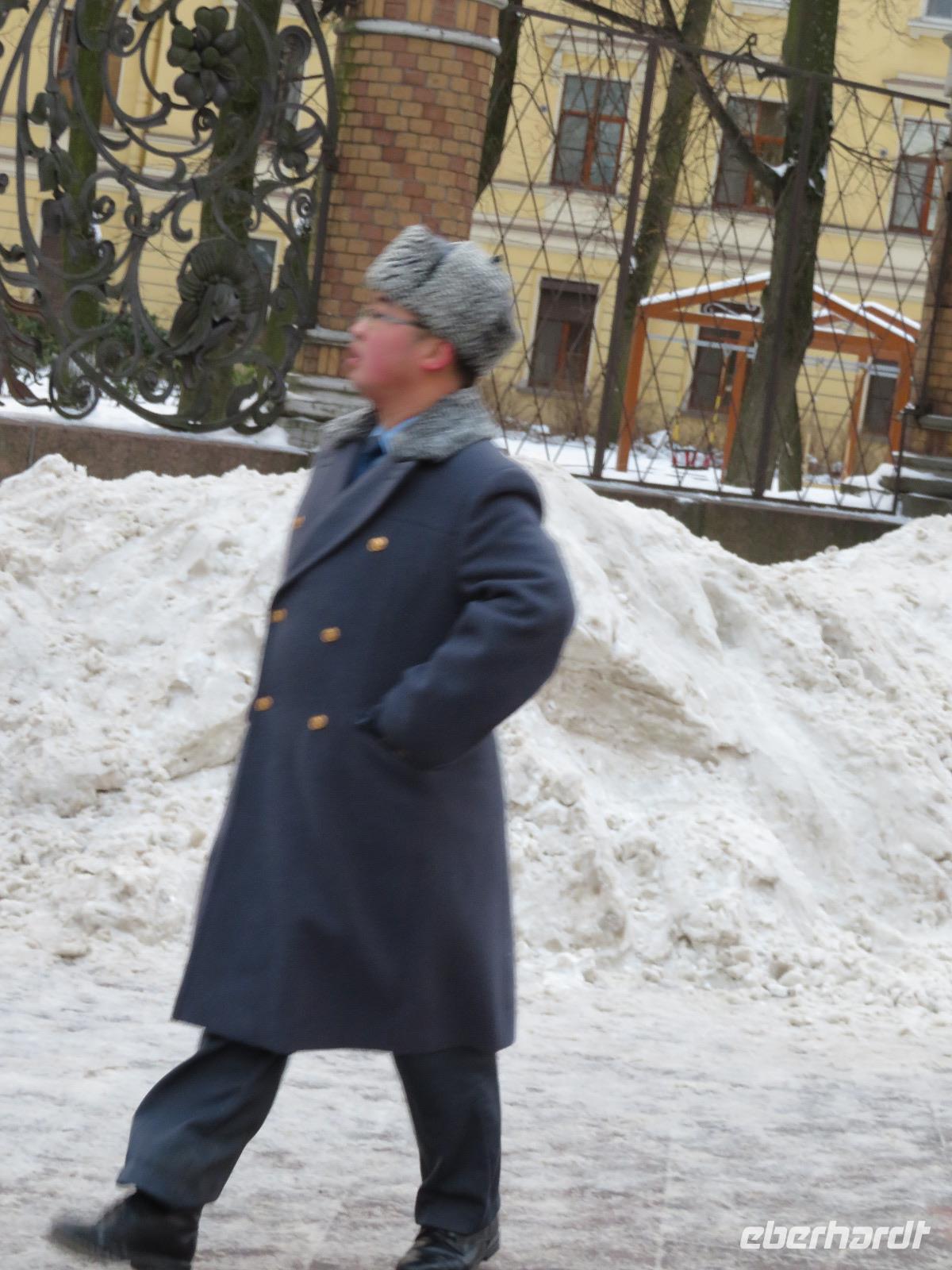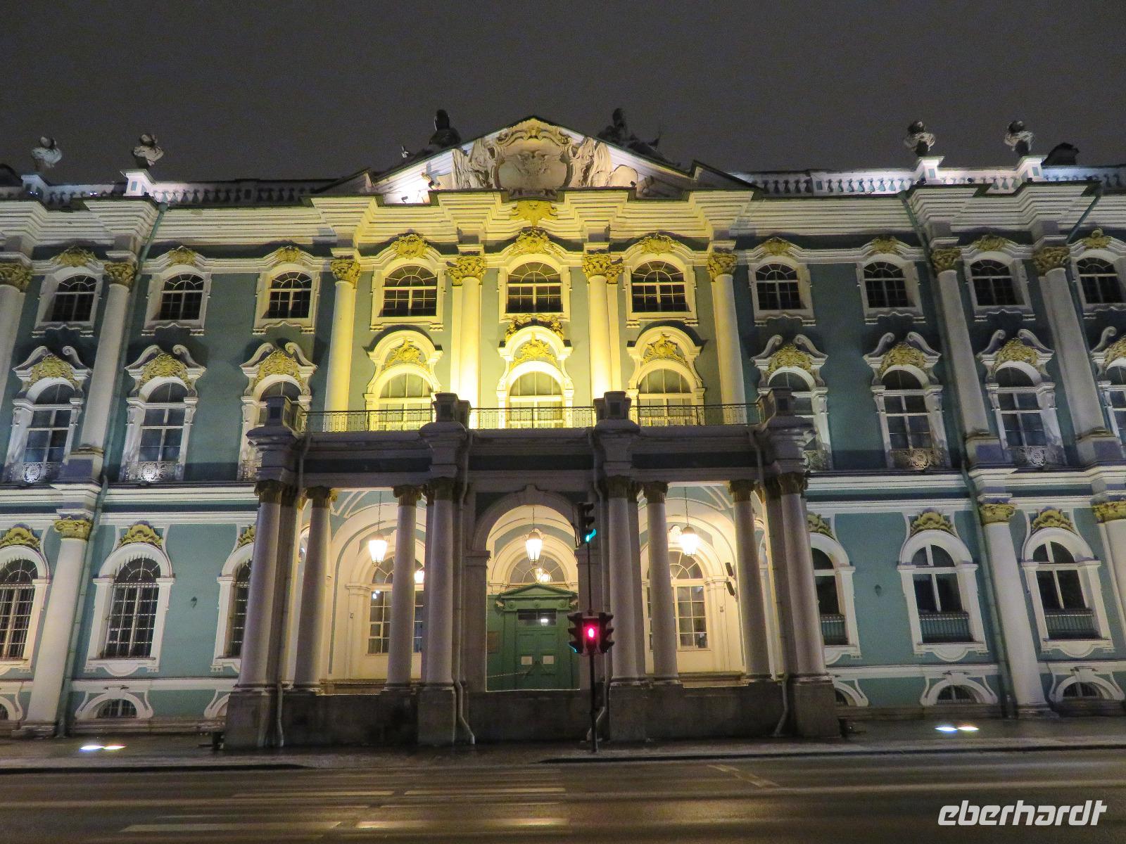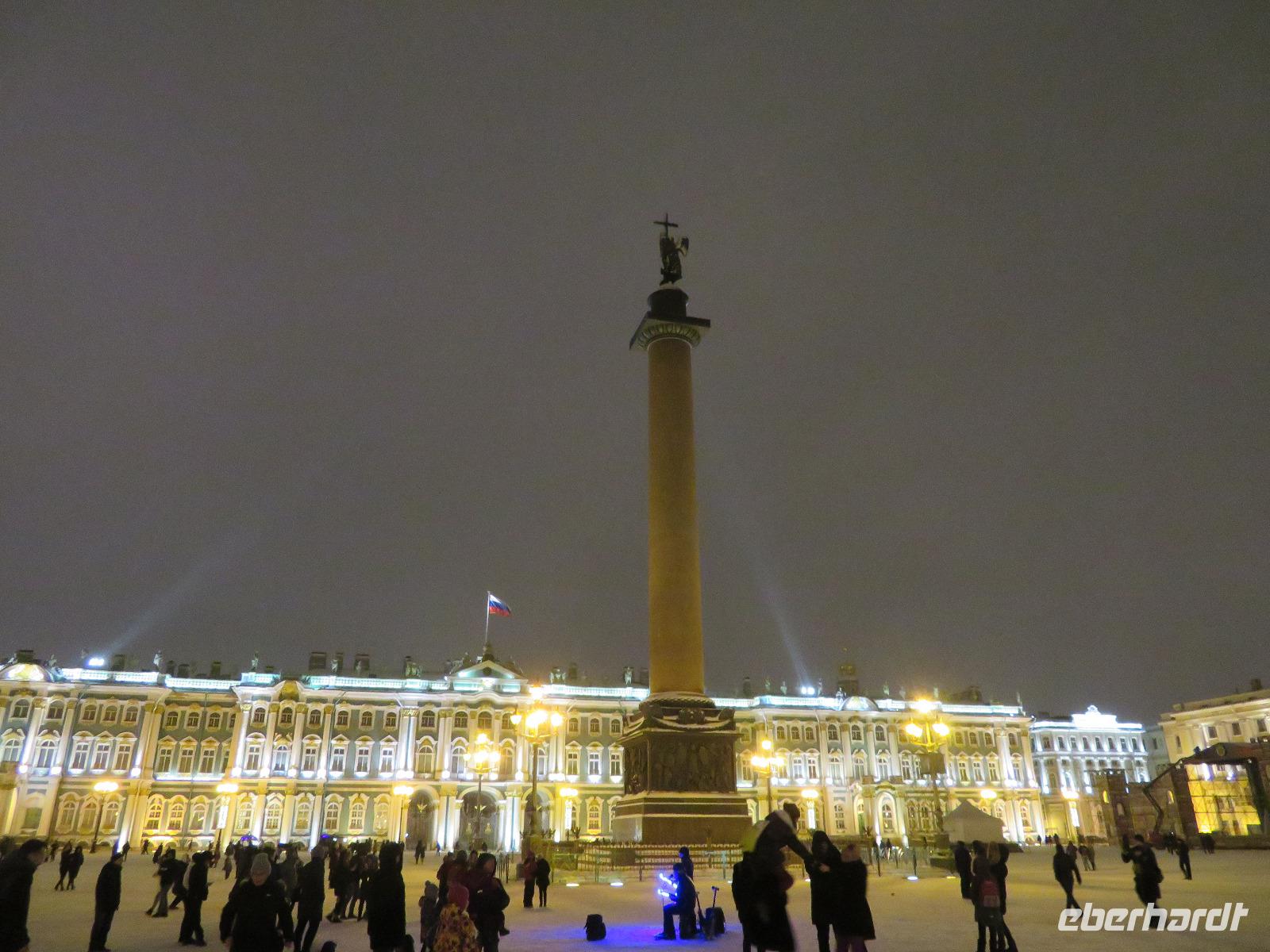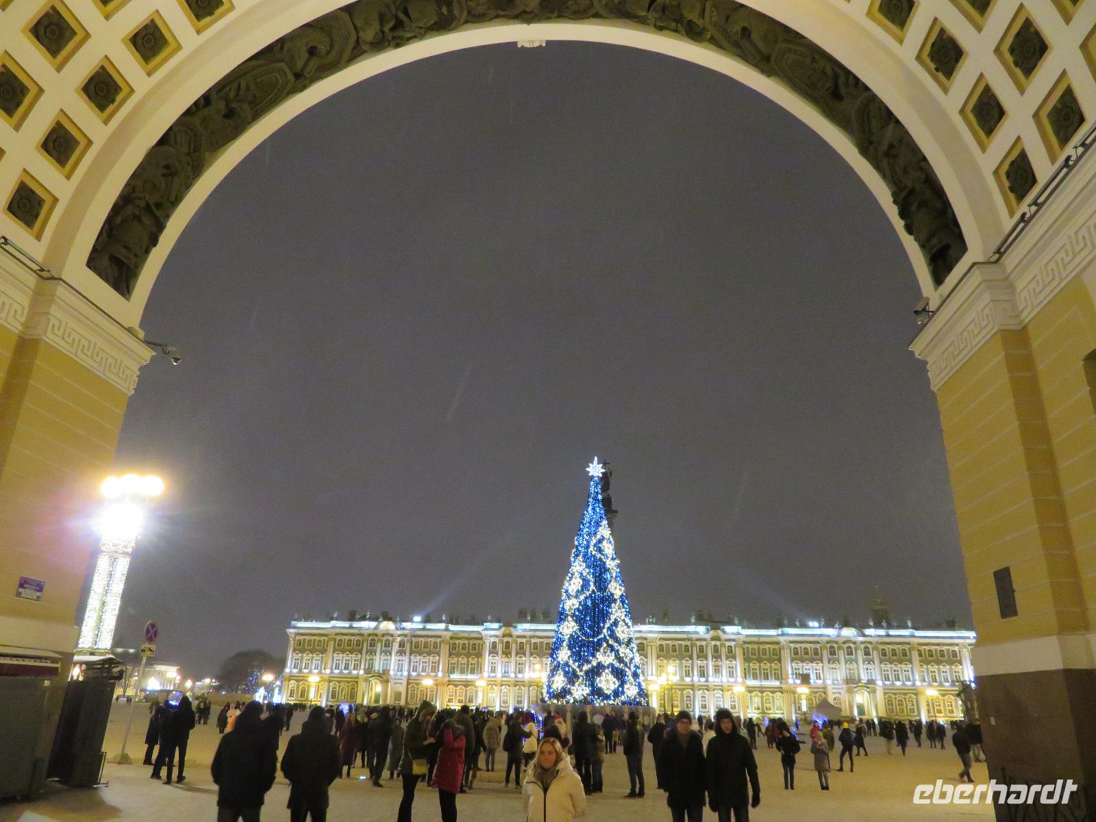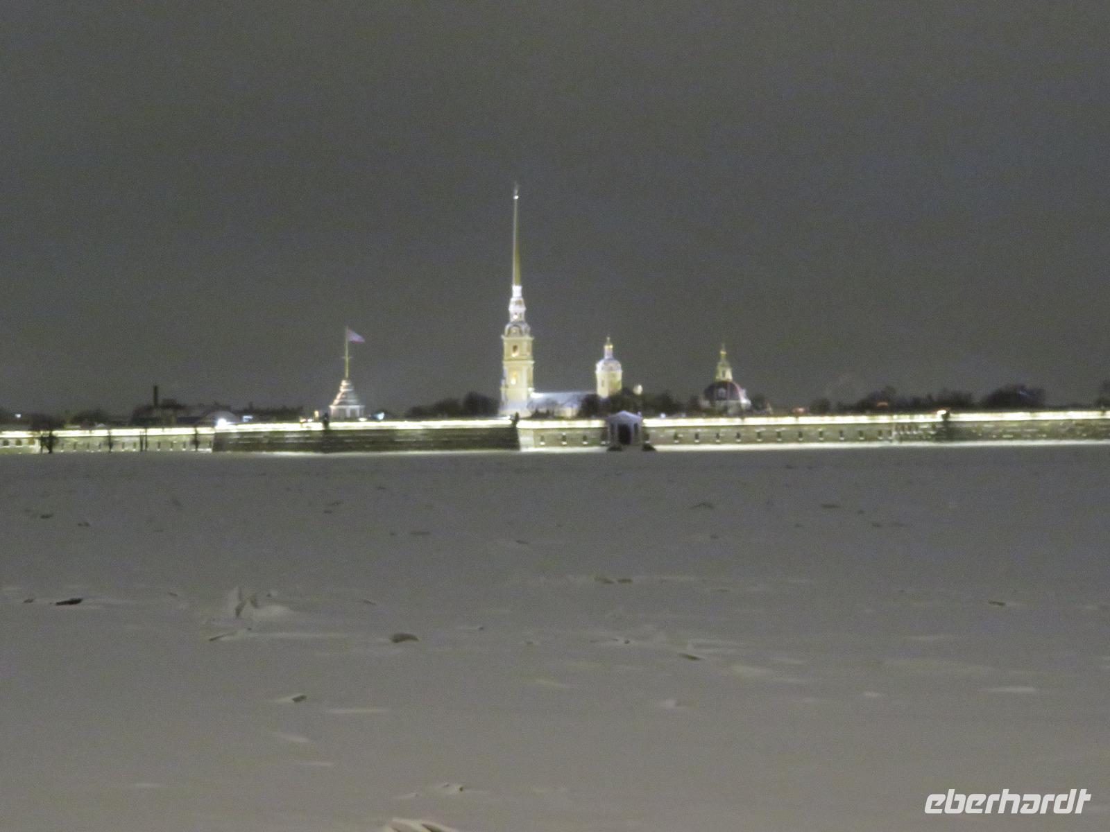 Nach dem Abendessen trafen wir uns zu einem ersten Luft-Schnuppern bei leichten Minusgraden und frischer Ostsee-Luft. Die Aurora am anderen Ufer war zu erkennen, bald die beleuchtete Peter-Pauls-Festung und dann die Strelka. Am Winterpalais bogen wir ab und erreichten den leicht weiß überzogenen Schlossplatz. Von hier ging es durch das legendäre Tor des Generalstabsgebäudes zum Newski-Prospekt und diesen in individueller Geschwindigkeit zurück zum Hotel. Über einige recht vereiste Fußwege erreichten wir gegen 23 Uhr das Hotel.