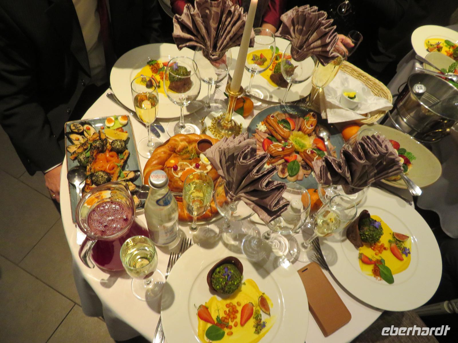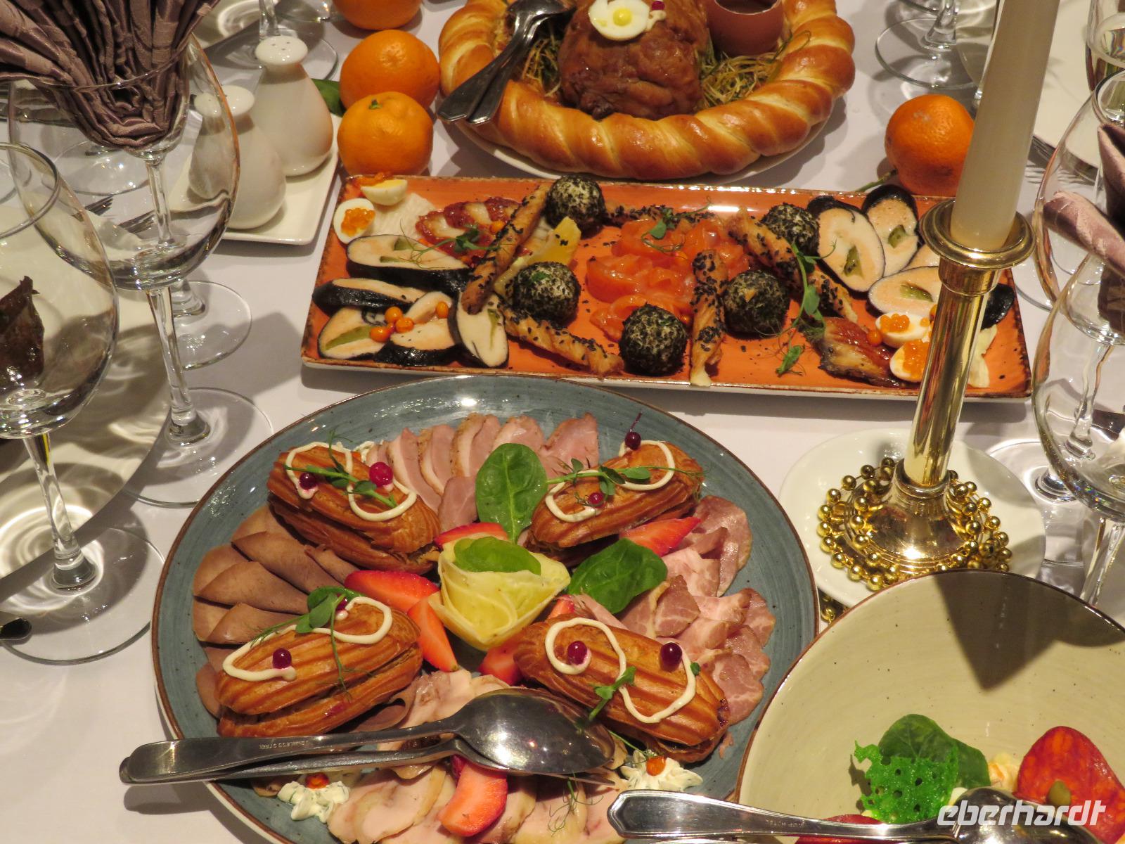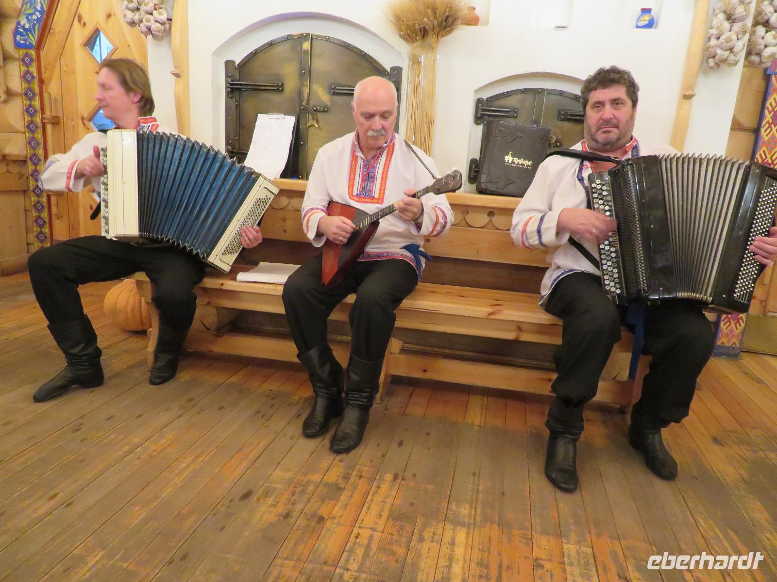 Zur Nachmittagszeit im Cafe' „Sadko" Probieren von gefüllten Piroggen - süß und herzhaft - es sollte bis nach zweiundzwanzig Uhr reichen. Um diese Zeit erreichten wir nach kurzer Busfahrt das legendäre Restaurant „Troika" - durchaus ein wenig Ambiente eines kleinen Pariser Cabarets. Einige Italiener, Finnen, wir als deutsche Gruppe und überwiegend, nicht ganz arme, Russen machten das vielleicht einhundertköpfige Publikum aus. Üppige Vorspeisen vom Feinsten (Lachs, Aal, Pastete aus Küken-Leber, Schinken, Rinderbraten, Ochsenzunge, Entenbrust, mit Teig, Pistazien und Waldpilzen gefülltes gebackenes Huhn, Gänseleber auf Apfelkompott), später dann Cocktail mit gebackenen Garnelen, nach Mitternacht Schweinslendchen in Dijon-Senf machten die Hauptpunkte des Menüs aus. Dazwischen Tanzeinlagen, Gesang, Moderation - na, das war ein wenig schwierig. An der Kontingentierung der Getränke - oder auch am Verbrauch?? - müssen wir noch ein wenig feilen ... Jedenfalls stießen wir sowohl zum Jahreswechsel nach Petersburger Zeit - nach Putin-Rede und russischer Nationalhymne - und um Zwei Uhr zum deutschen Jahreswechsel an. Das gemeinsame Verlassen der Veranstaltung ist dann immer ein Kompromiss; wir hatten uns - wohl für alle akzeptabel - auf 2:15 Uhr („nach dem deutschen Jahreswechsel") geeinigt.
