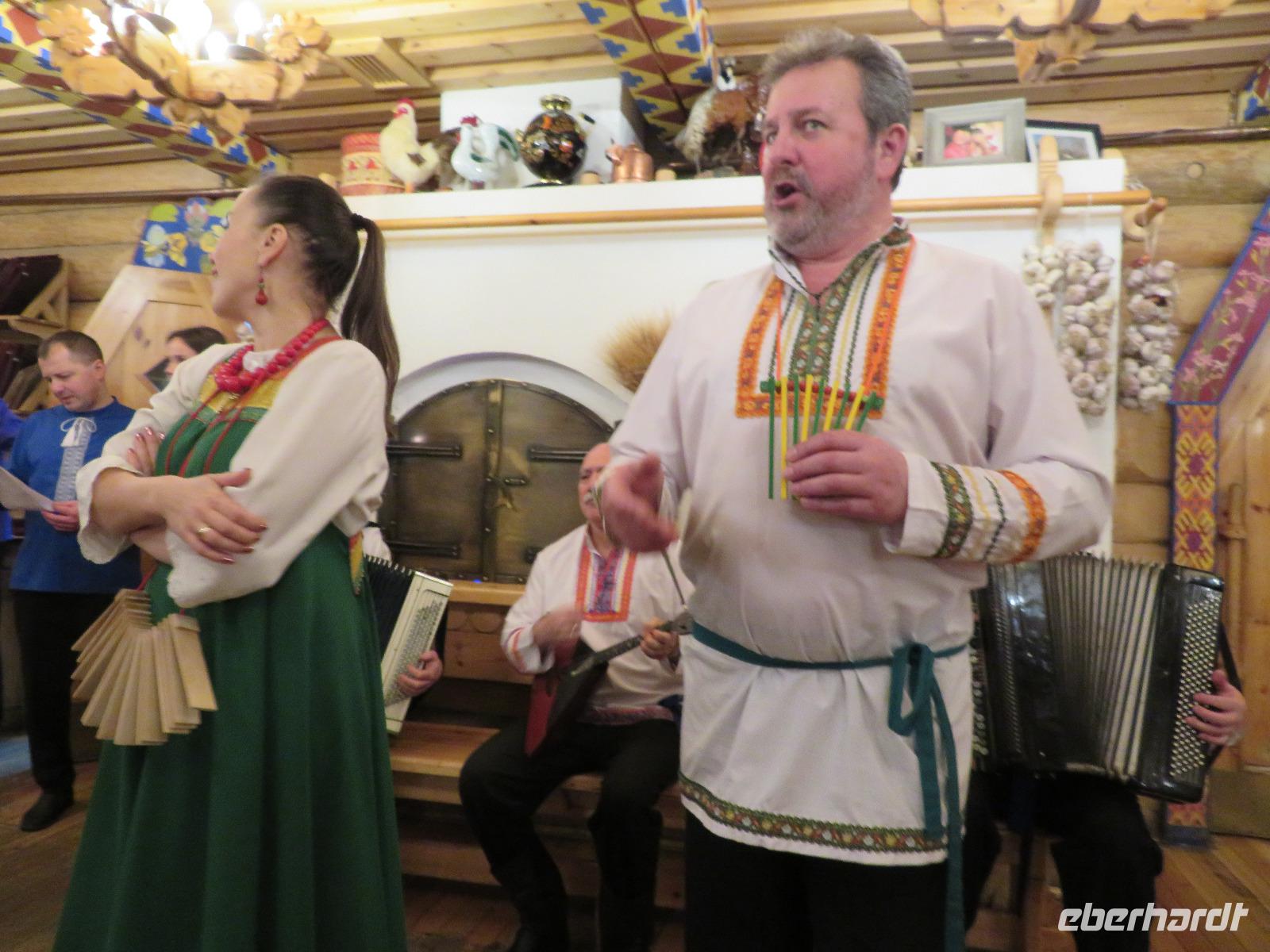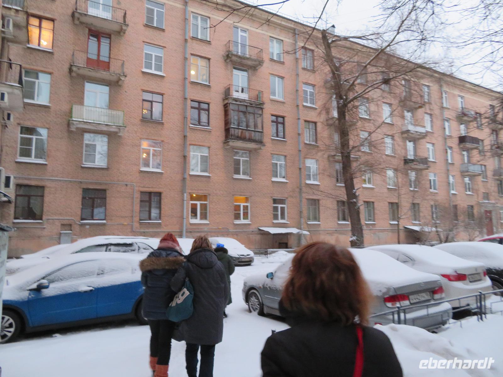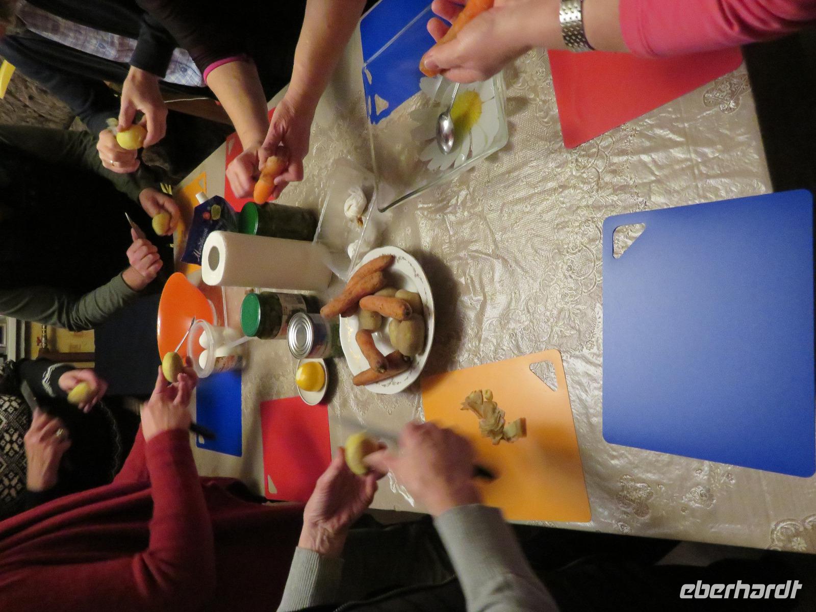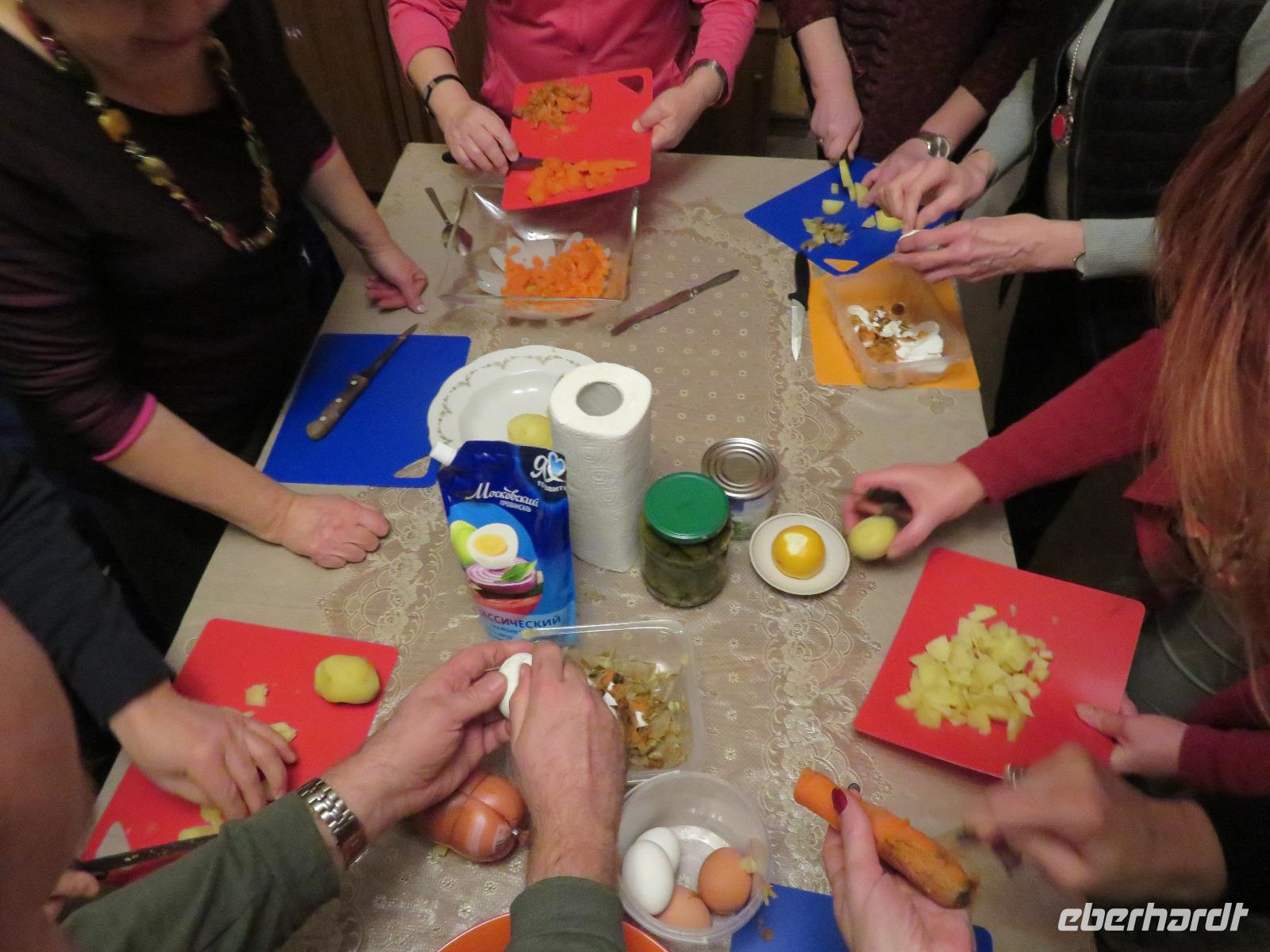 Am Nachmittag trennte sich die Gruppe in zwei Zehner-Teilgruppen, um in den Wohnungen von zwei Elenas nach russischer Sitte den Festtagssalat „Olivier" selbst zu produzieren. So lernten sich auch die Reisegäste ohne sonstige Vorstellrunde gut kennen. Der Salat wurde in die Speisenfolge von reichlich Sakuski, Borschtsch und Pelmeni eingebettet, mit Wodka und Sekt „verwässert" und mit Kuchen und Caj abgedeckt. Ein herzlicher und authentischer Jahresbeginn, der allen sicher lange im Gedächtnis bleiben wird.