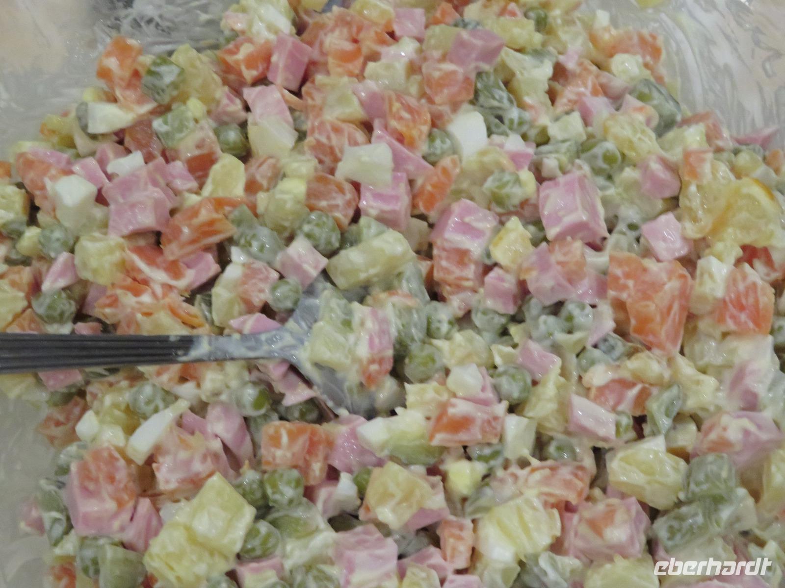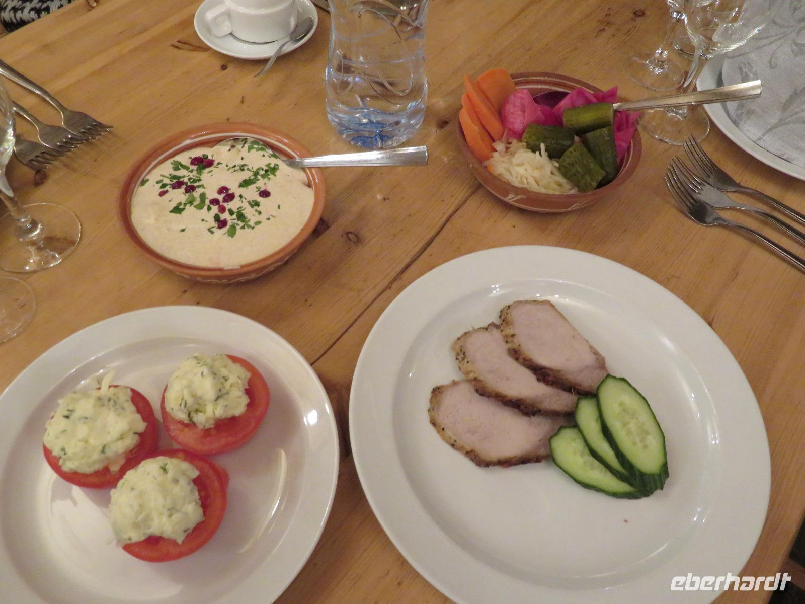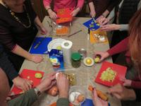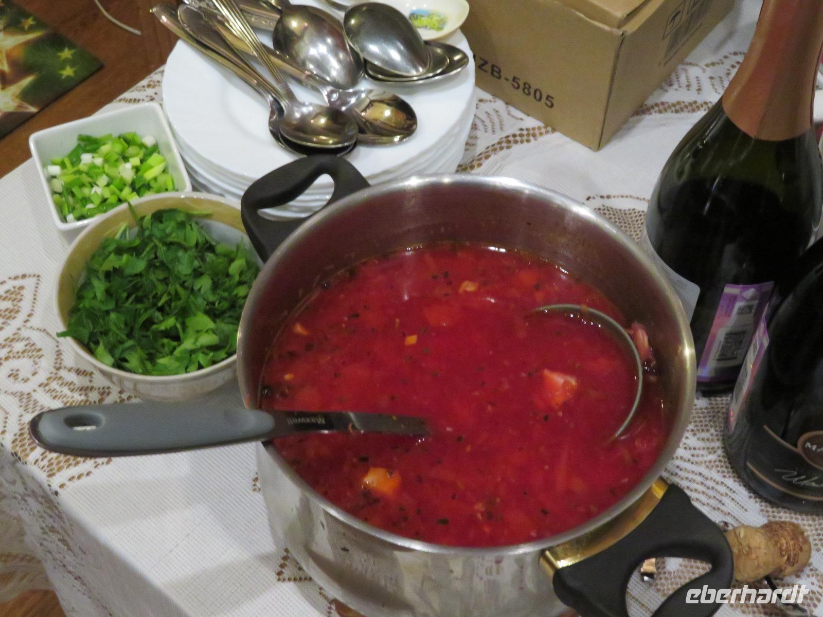 Am Nachmittag trennte sich die Gruppe in zwei Zehner-Teilgruppen, um in den Wohnungen von zwei Elenas nach russischer Sitte den Festtagssalat „Olivier" selbst zu produzieren. So lernten sich auch die Reisegäste ohne sonstige Vorstellrunde gut kennen. Der Salat wurde in die Speisenfolge von reichlich Sakuski, Borschtsch und Pelmeni eingebettet, mit Wodka und Sekt „verwässert" und mit Kuchen und Caj abgedeckt. Ein herzlicher und authentischer Jahresbeginn, der allen sicher lange im Gedächtnis bleiben wird.