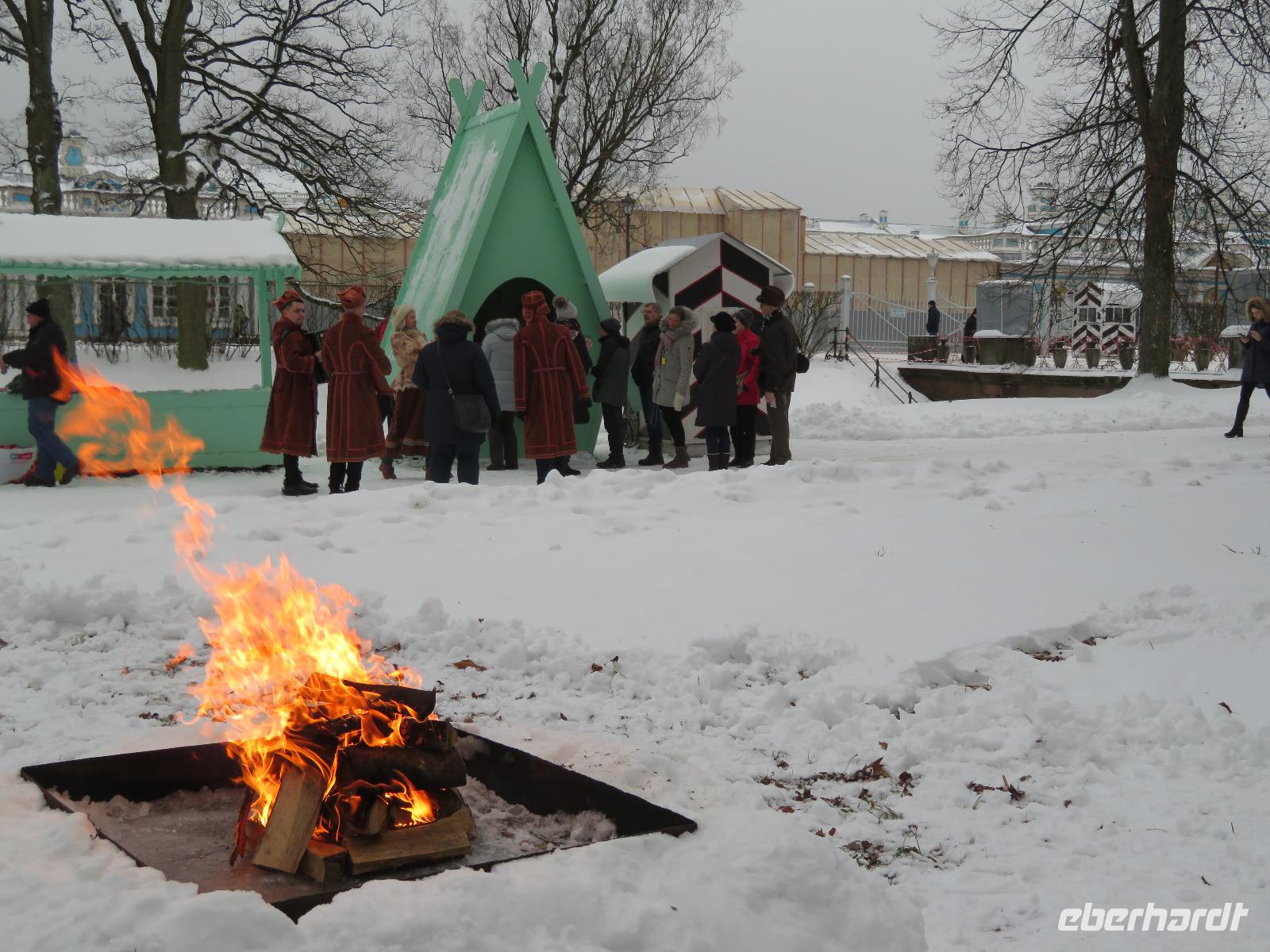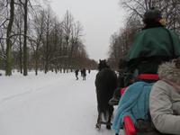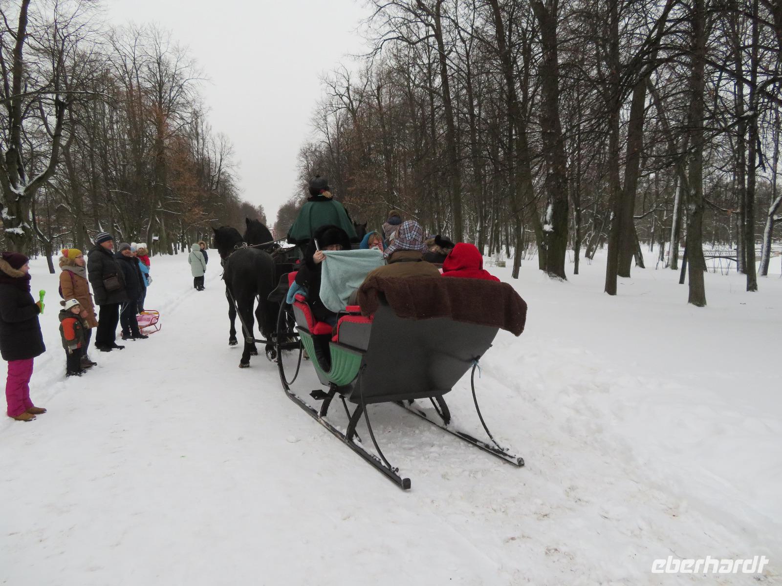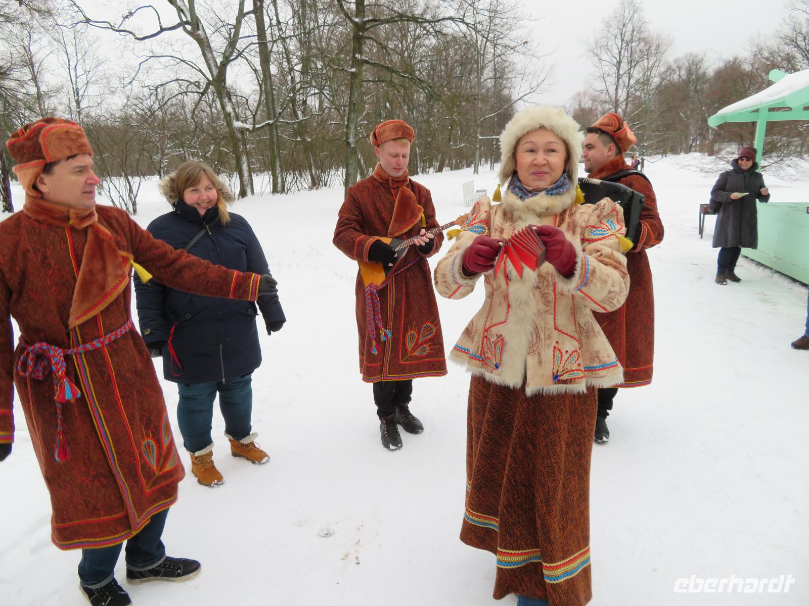 Fast um Zehn Uhr ist es, als das nächtliche Grau über Petersburg verschwindet - Zeit zur Abfahrt nach Puschkin. Recht schnell sind wir im Schloss, das Kaiserin Elisabeth errichten ließ, wo einst Jekatarina I. ihre Sommerresidenz hatte. Das Schloss, zwischen 1941 und 1944 in der Frontzone des 2. Weltkrieges, wird seit Jahrzehnten wieder aufgebaut und birgt das legendäre Bernsteinzimmer in seiner Zweitfassung. Im Park vom naheliegenden Alexanderschloss empfing uns ein Folkloreensemble und lud zu viel Aktivität ein. Zwischen Schlittenfahrt und Tanzen verspeisten wir Blinys mit Lachskaviar, Smetana und Marmelade. Bei Schnee hatten wir gar die Genehmigung zum kleinen Lagerfeuer - in einer Feuerschale - bekommen. Die wenigen Kilometer nach Pawlowsk waren dann mit dem Bus schnell überwunden. Das klassizistische Schloss, um 1800 errichtet, diente dem Kurzzeit-Zaren Paul I. als Sommerresidenz und beheimatet heute als Museum zahlreiche Ausstellungsstücke aus mannigfaltigen einstigen Adelsschlössern. Zum Tages- und Reiseabschluss ging es dann ins traditionelle Touristenrestaurant „Podvorie": Vorspeisen, überbackene Pilze, Borschtsch, Krautwickel und Blinys mit Eis sind traditionell hier das Menü, begleitet von russischem Wein und Wodka sowie Folklore-Gesang. So ging ein inhaltsreicher und authentisch-russischer Tag zu Ende. Mancher saß am Abend dann noch in der Hotelbar und plauderte über Russland und neue Reisevorhaben.