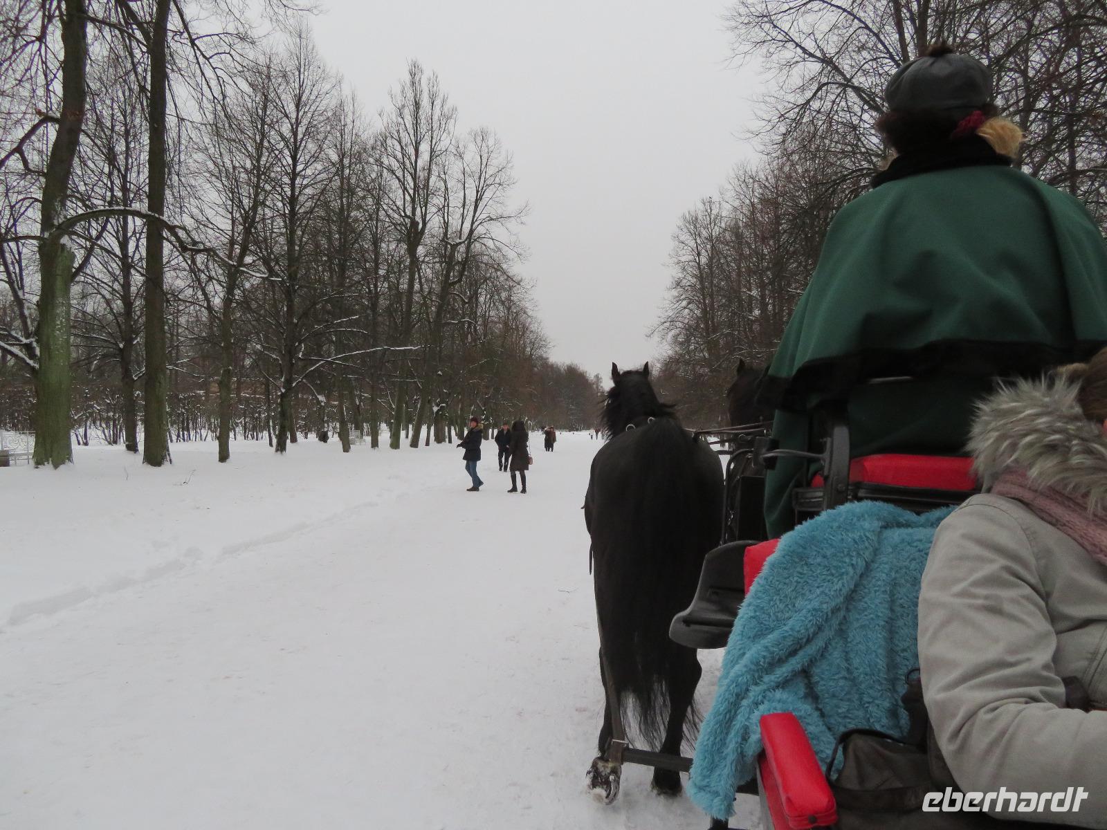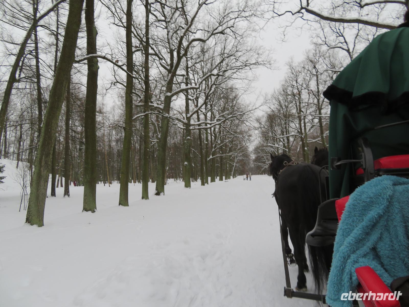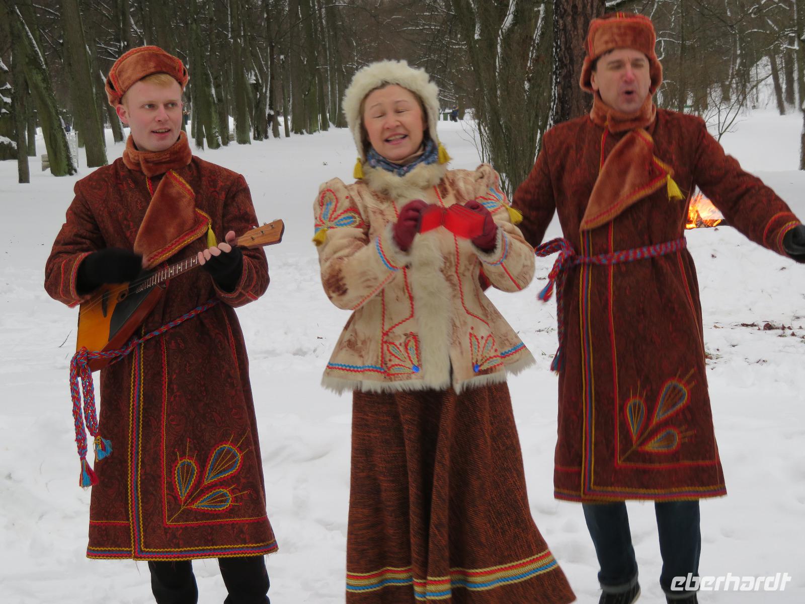 Fast um Zehn Uhr ist es, als das nächtliche Grau über Petersburg verschwindet - Zeit zur Abfahrt nach Puschkin. Recht schnell sind wir im Schloss, das Kaiserin Elisabeth errichten ließ, wo einst Jekatarina I. ihre Sommerresidenz hatte. Das Schloss, zwischen 1941 und 1944 in der Frontzone des 2. Weltkrieges, wird seit Jahrzehnten wieder aufgebaut und birgt das legendäre Bernsteinzimmer in seiner Zweitfassung. Im Park vom naheliegenden Alexanderschloss empfing uns ein Folkloreensemble und lud zu viel Aktivität ein. Zwischen Schlittenfahrt und Tanzen verspeisten wir Blinys mit Lachskaviar, Smetana und Marmelade. Bei Schnee hatten wir gar die Genehmigung zum kleinen Lagerfeuer - in einer Feuerschale - bekommen. Die wenigen Kilometer nach Pawlowsk waren dann mit dem Bus schnell überwunden. Das klassizistische Schloss, um 1800 errichtet, diente dem Kurzzeit-Zaren Paul I. als Sommerresidenz und beheimatet heute als Museum zahlreiche Ausstellungsstücke aus mannigfaltigen einstigen Adelsschlössern. Zum Tages- und Reiseabschluss ging es dann ins traditionelle Touristenrestaurant „Podvorie": Vorspeisen, überbackene Pilze, Borschtsch, Krautwickel und Blinys mit Eis sind traditionell hier das Menü, begleitet von russischem Wein und Wodka sowie Folklore-Gesang. So ging ein inhaltsreicher und authentisch-russischer Tag zu Ende. Mancher saß am Abend dann noch in der Hotelbar und plauderte über Russland und neue Reisevorhaben.