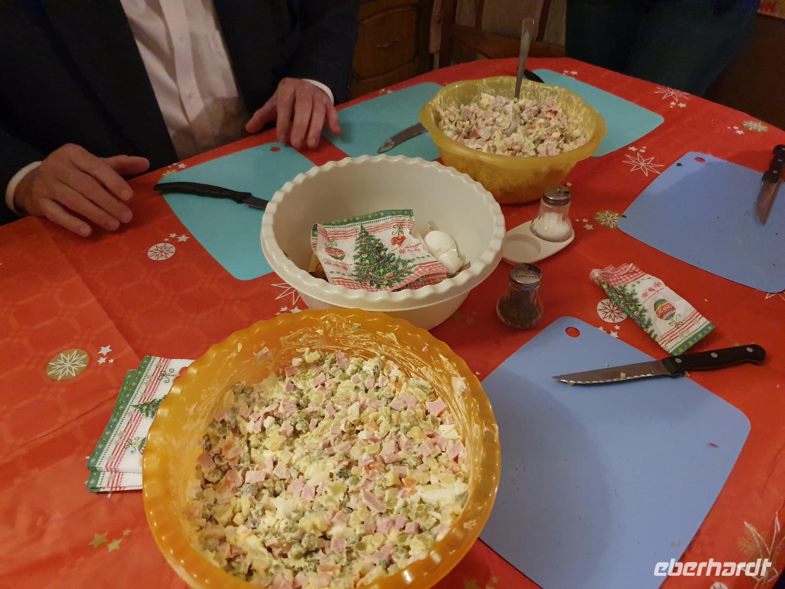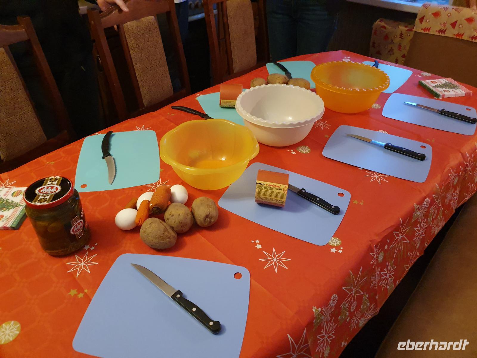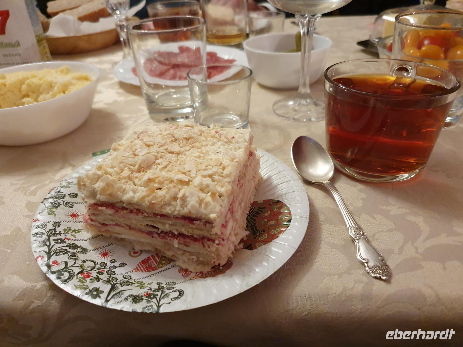 Anschließend stand ein ganz besonderes Highlight unserer Reise auf dem Programm und wir wurden in zwei Gruppen aufgeteilt. Eine Gruppe fuhr mit Katia nach Puschkin - die zweite Gruppe fuhr mit der Reiseleiterin Natalia entlang der Newa raus aus dem Stadtzentrum. Hier warteten Familien auf uns, die uns eingeladen hatten den Neujahrstag mit ihnen zu verbringen. Grundsätzlich hat das Neujahrsfest in Russland einen höheren Stellenwert als Weihnachten. Die Geschenke werden am 31.12. überreicht und die russischen Neujahrsferien dauern bis zum 09.01.2019 an - diese Tage verbringt man mit der Familie und Bekannten. Lena und ihr Mann Alexander leben gemeinsam mit ihrem 14-jährigen Sohn Vlad, der Großmutter und dem Kater Persey in einer relativ großen Wohnung am Ufer der Newa. Alexander arbeitet als Ökologe für die Stadt St. Petersburg und Lena ist für einen Reiseveranstalter tätig. Nachdem sich bei kleinen Häppchen und einem Wilkommenstoast alle miteinander bekannt gemacht haben, stand ein kleiner Wettkampf für uns an: Herauszufinden war, welches Team den besseren Salat Olivie zubereitete. Der Salat Olivie besteht aus gekochten Kartoffeln, Möhren, Erbsen, Eiern, eingelegten Salzgurken Wurst und Mayonnaise und gehört zum russischen Neujahr auf alle Fälle dazu. Wichtig ist, dass Kartoffeln, Möhren, Wurst und Eier zu ganz kleinem Würfel geschnitten werden. In der Jury, die den Geschmack der beiden Salate bewertete, saßen Lena, Alexander und Natalia. Nachdem das Siegerteam einen kleinen Preis erhielt, konnten jetzt auch wir die Salate probieren - anschließend gab es Bortsch. Während Lena die kleinen mit Hackfleisch gefüllten Teigtaschen Pelmenis kochte, gingen wir Gäste zurück in das Wohnzimmer. Hier begannen wir den russischen Kultfilm „Ironie des Schicksals" aus dem Jahr 1975 zu schauen: Zu Zeiten der Planwirtschaft, wird ein junger, russischer Arzt nach einer durchzechten Nacht von seinen Freunden versehentlich in den Flieger nach St. Petersburg gesetzt. Er denkt, dass er sich noch in Moskau befände und lässt sich von einem Taxi zu seiner Hausadresse fahren. Alles sieht wie immer aus und auch der Wohnungsschlüssel passt - bis eine fremde Frau in der Wohnung steht - die sich in ihrer Wohnung befindet und sich über den Unbekannten sehr wundert. Es entspinnt sich eine lustige Geschichte, in der der junge Arzt und die Frau langsam zueinander finden. Der Film dauert allerdings fast drei Stunden und an diesem Tag war es uns viel wichtiger etwas über das Leben unserer Gastgeber zu erfahren: Lena zeigte uns sogar Familienfotos aus den letzten Urlauben nach Barcelona und Riga. Währenddessen wurden immer wieder Toasts - vor allem auf den Frieden und die Freundschaft ausgesprochen. Zum Dessert gab es Torte Napoleon und einen kräftigen Schwarztee. Ein ganz besonderer Abend ging zu Ende und sehr herzlich verabschiedeten wir uns von Alexander und Lena - die jetzt natürlich auch herzlich nach Deutschland eingeladen sind.