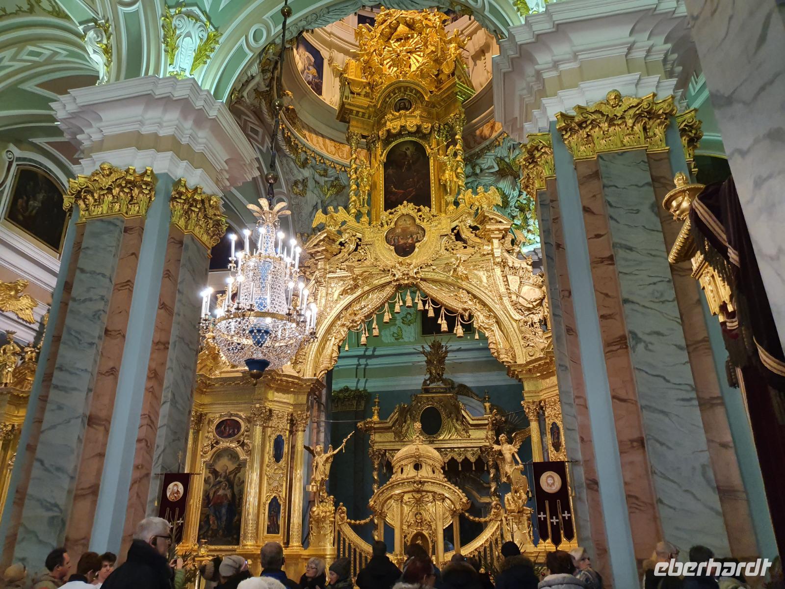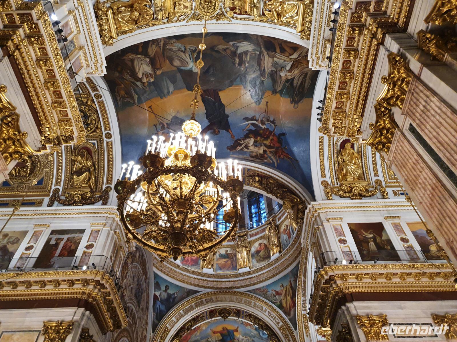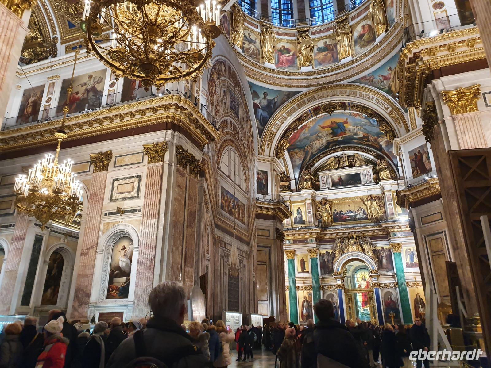 Gut gestärkt fuhren wir weiter zur Isaakskathedrale. Hier handelt es sich um einen Bau der Superlative: 12.000 Menschen finden hier Platz, die Höhe beträgt 101 Meter, das Gesamtgewicht liegt bei 300.000 Tonnen und die Kathedrale steht auf 10.762 Pfählen.