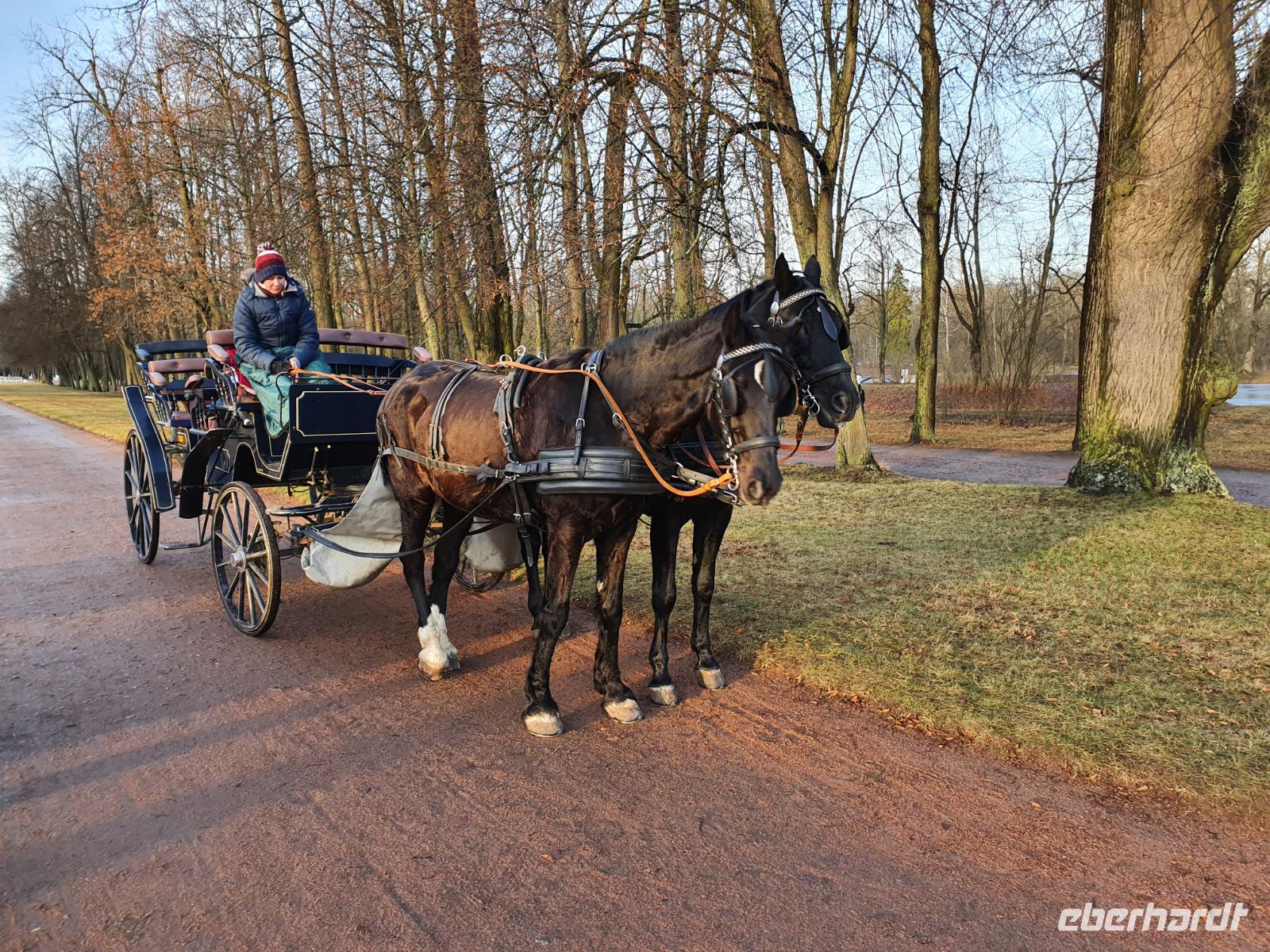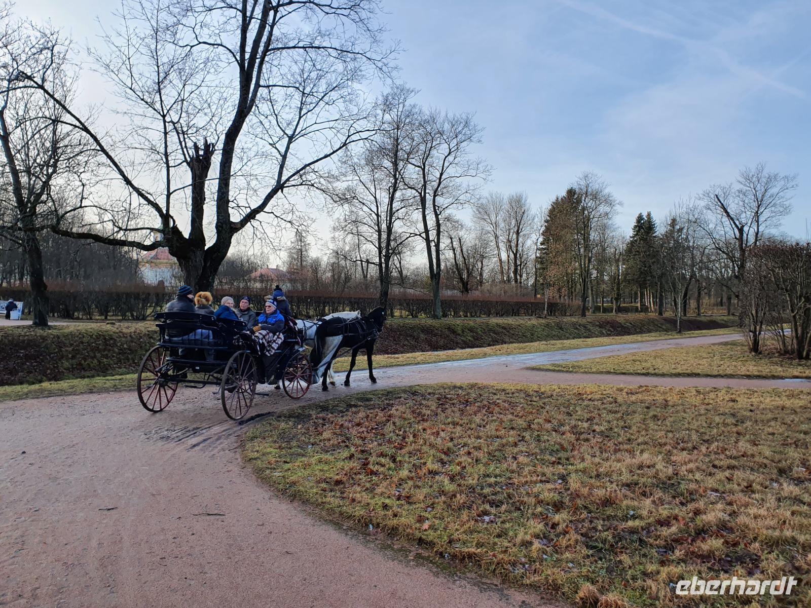 Anchließend schlenderten wir durch den angrenzenden Alexandrinsky-Park, in dem eine Folklore-Gruppe bereits auf uns wartete. Bei Blinis und Wodka, wurden wir in einige russische Tänze eingewiesen und tanzten bald gemeinsam durch den Park. Aufgrund des nicht sonderlich winterlchen Wetters, wurde aus der ausgeschriebenen Schlittenfahrt kurzerhand eine Kutschfahrt und in warme Decken eingewickelt konnten wir die schöne Fahrt durch den Park genießen.