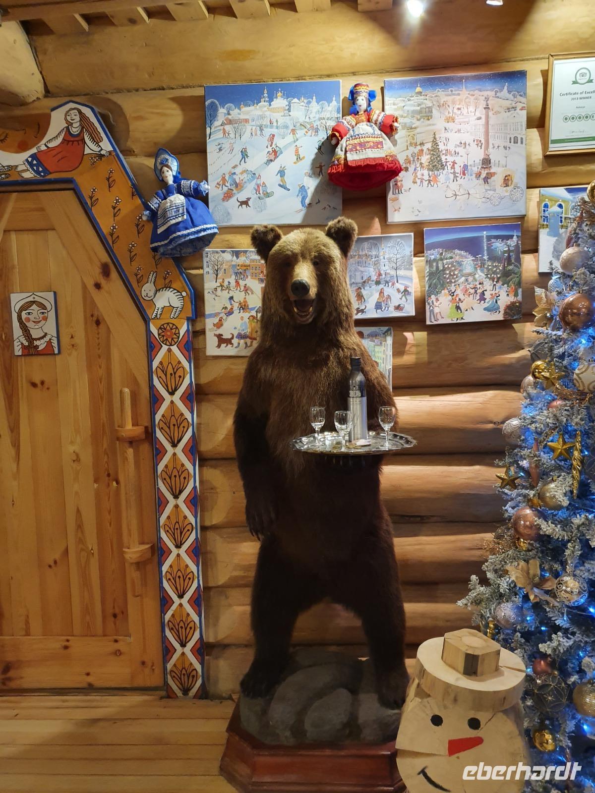 Unser Abschiedsabendessen fand in dem bekannten Restaurant „Podworje" statt. Hier wird man gleich am Eingang von einem Bär mit Wodkaflasche in Empfang genommen. Prominente, wie Nicolas Sarcozy oder Hugh Grant waren hier bereits zu Gast. Es erwartete uns ein bunter Abend mit russischen Speisen, Folklore und viel Alkohol. Es wurde ausgelassem gefeiert und es kam schon ein bisschen Wehmut auf, dass am nächsten Tag bereits die Heimreise anstand.