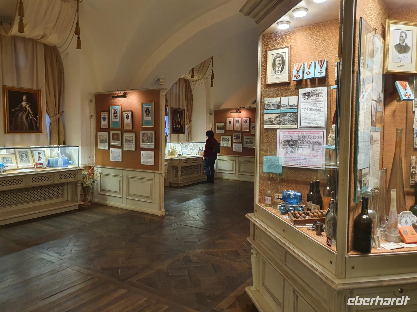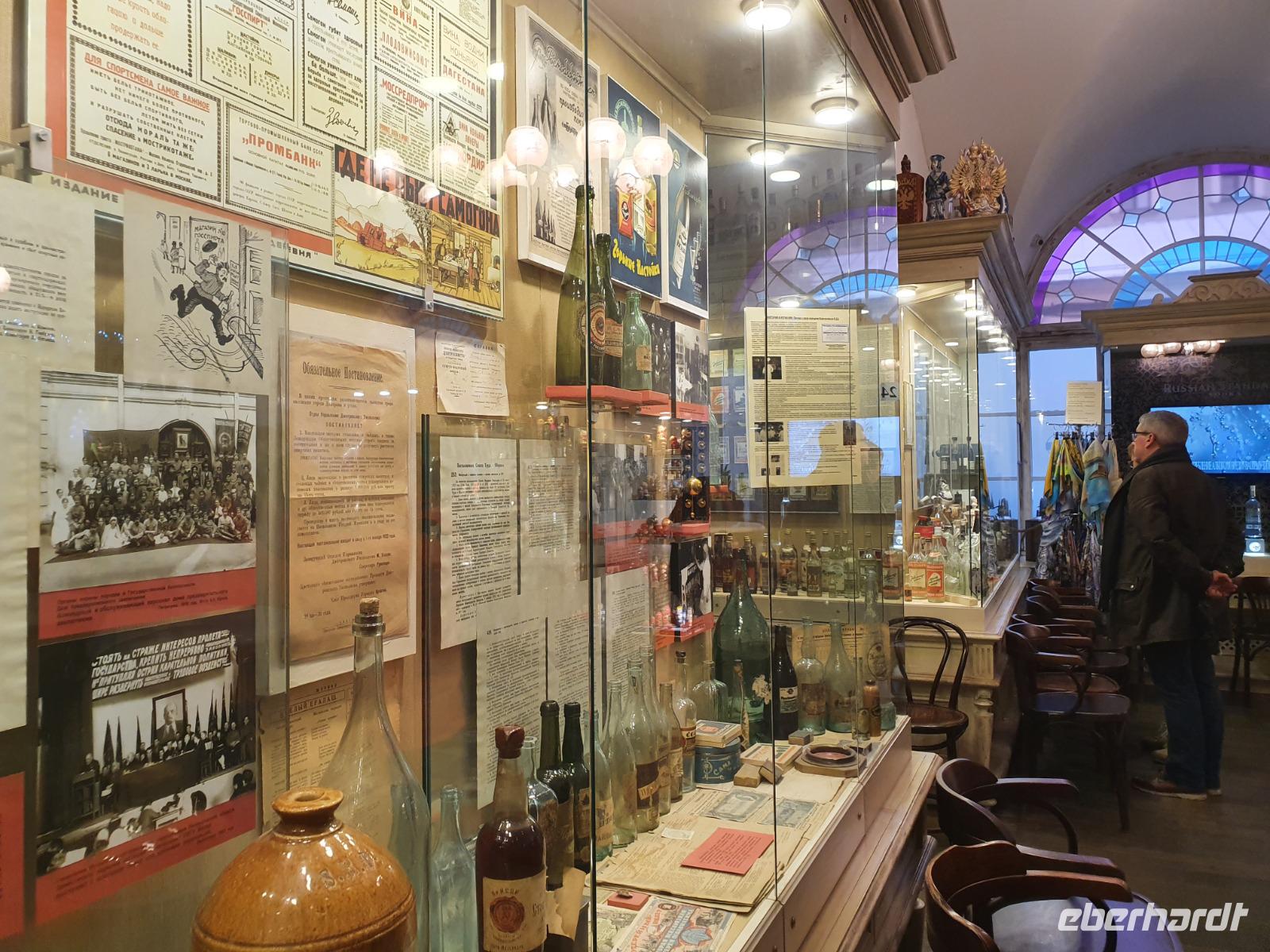 In dem Museumsraum waren zahlreiche historische Flaschen und Wodkagläser ausgestellt. Anschließend standen in dem kleinen Museumsladen drei Tische für uns bereit: Auf jedem Tisch fand sich eine andere Wodkaflasche mit dem jeweils passenden „Sakuskis" (zu deutsch Häppchen). Zu den bei den Russen beliebtesten Häppchen zum Wodka, zählt wohl aber die Salzgurke. Nach dieser kleinen Verkostung, aßen wir zu Mittag im Restaurant „Russkaja Rjumotschnaja". Hier wurden uns russische Spezialitäten, wie die Rote Beete Suppe Bortsch und die hauchdünnen Eierkuchen „Blini" mit Kaviar serviert.