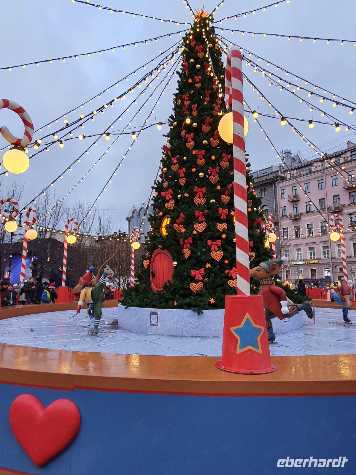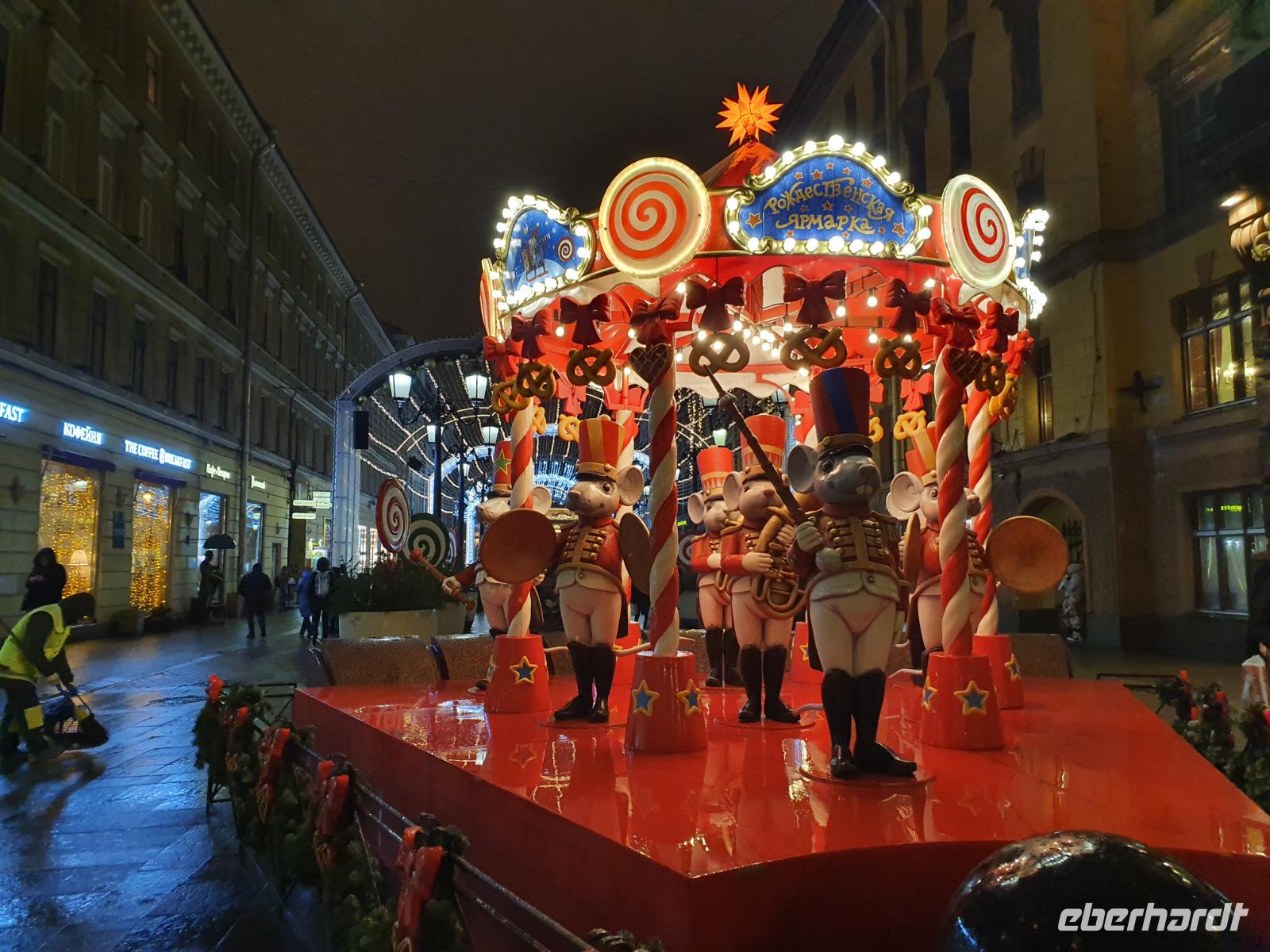 Anschließend führte uns Katia zum Newsky Prospekt - der großen Hauptstraße St. Petersburgs. Wir begannen unseren kleinen Bummel in der Kasaner Kathedrale, schlenderten durch eine der viele Einkaufsgalerien und gelangten anschließend über die kleinen Hinterhöfe auf den Platz der Kulturen. Am Newsky Prospekt gab uns Katia kurz Freizeit. Mit der Zeit werden auch Weihnachtsmärkte in Russland immer populärer und so konnten wir einen kurzen Blick auf den St. Petersburger Markt werfen.
