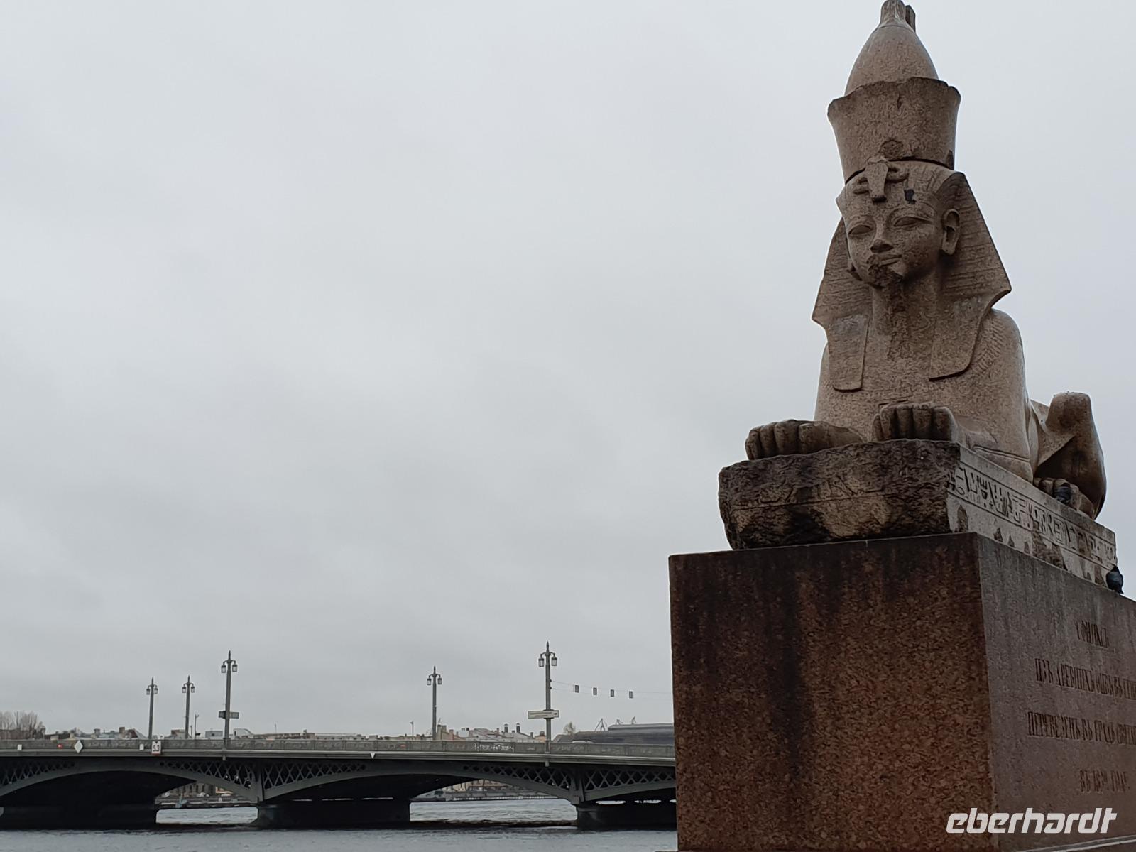 Während der Stadtrundfahrt machten wir unter anderem auch kurz Stop an dem Anleger mit Sphingen. Der Bau stammt von der Kunstakademie. Links und rechts einer breiten Granittreppe erheben sich zwei in Ägypten angekaufte Sphinxe. Sie stammen aus dem 14. Jahrhunder und tragen die Gesichtszüge von Pharao Amenophis III.