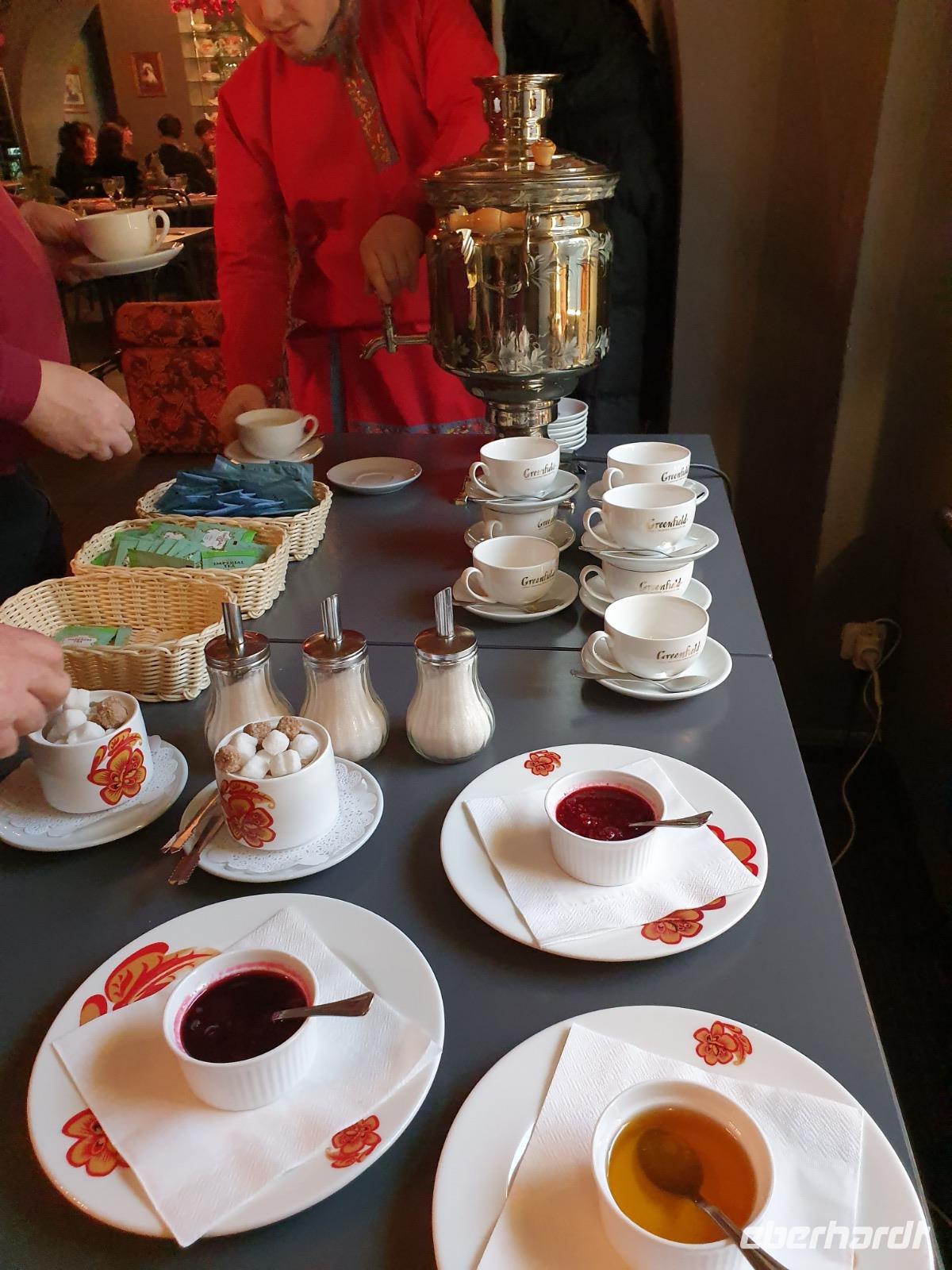 Danach fuhren wir zum Restaurant Sadko, das sich genau gegenüber dem Marinsky Theater befindet. Hier erwartete uns eine klassische russische Teestunde mit frischen Piroggen und Tee aus dem Samovar.