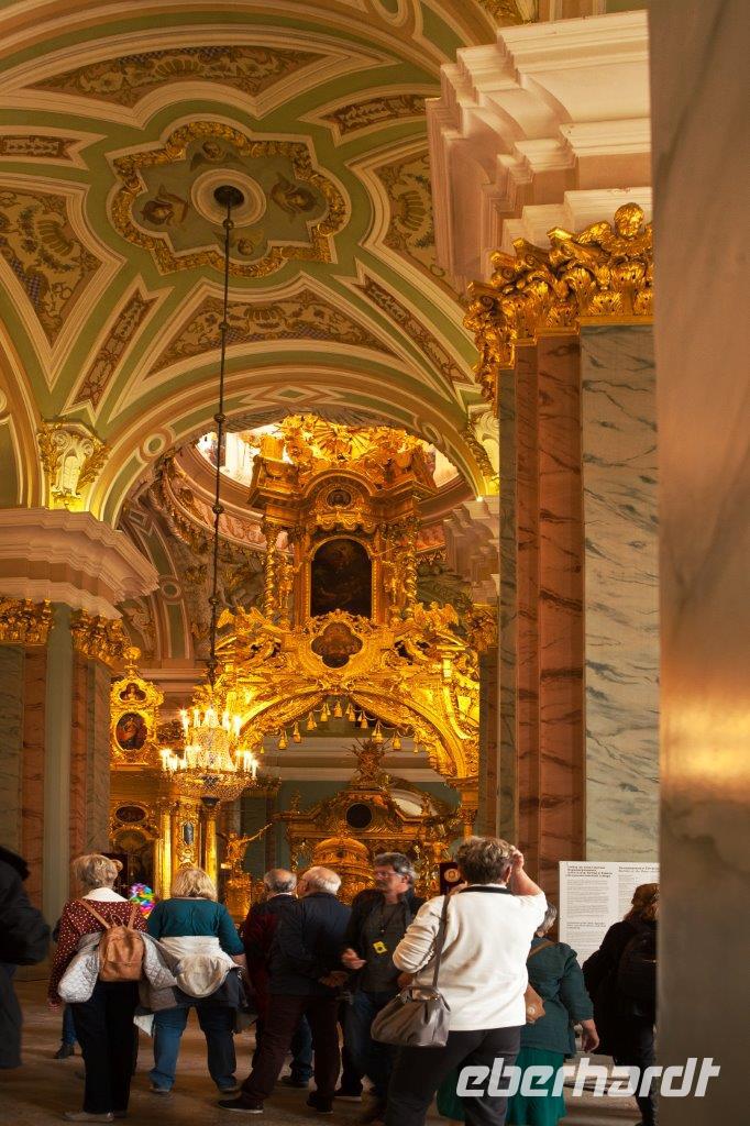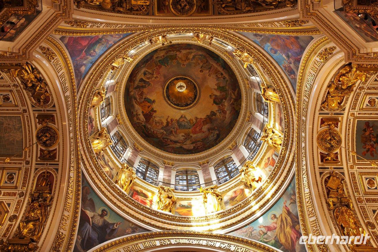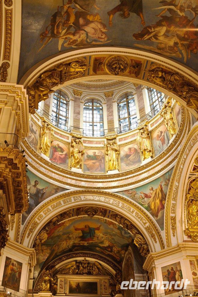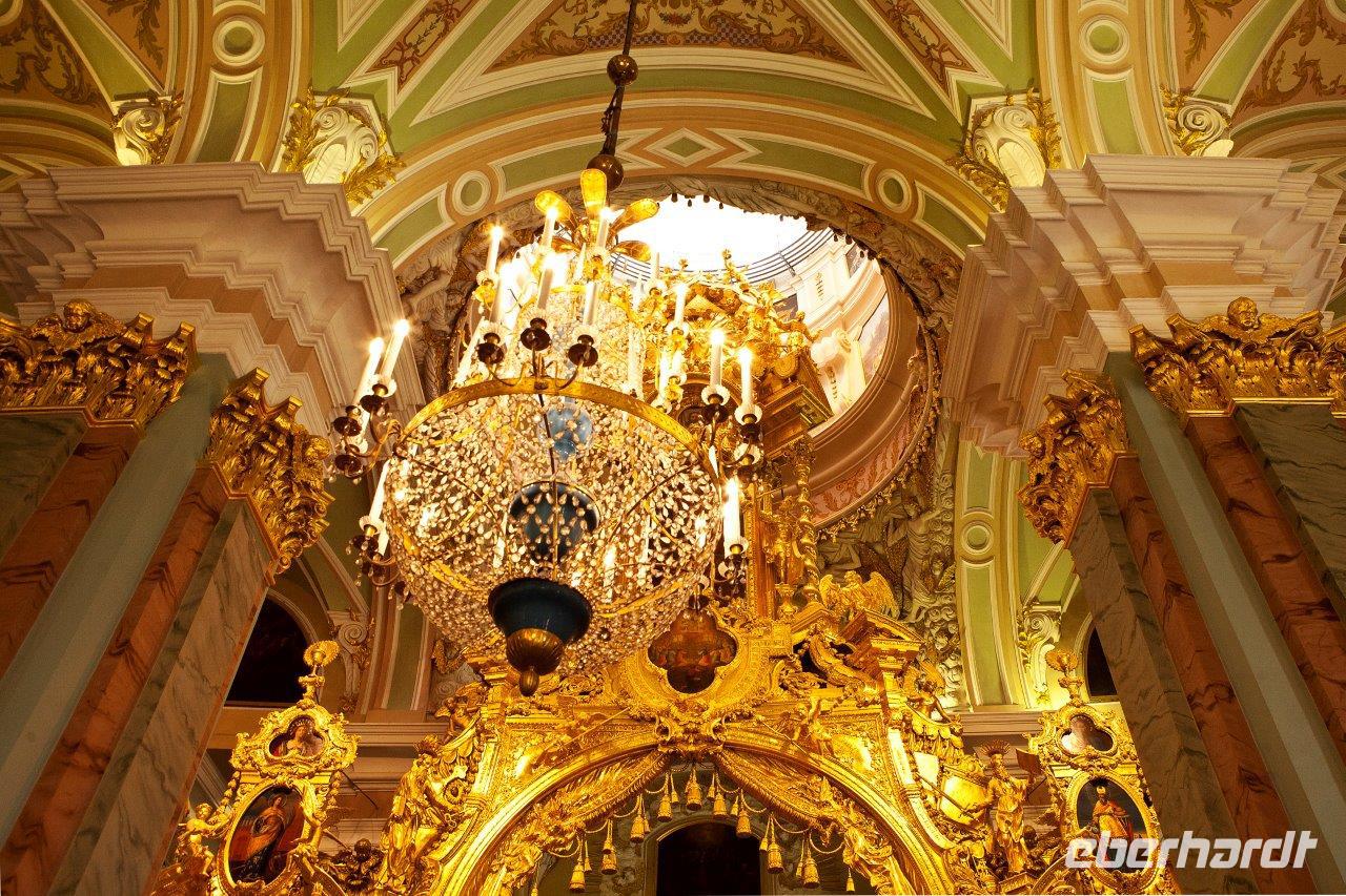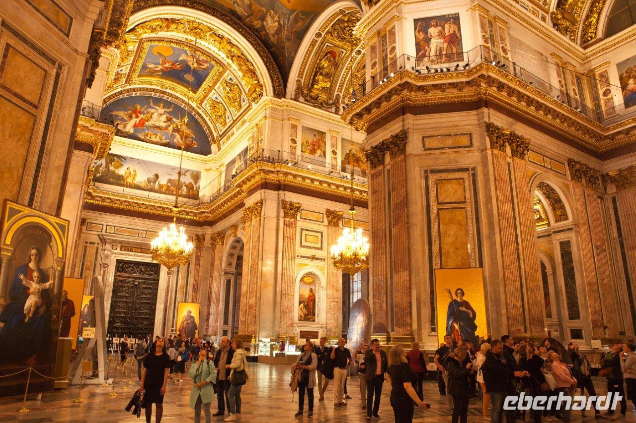 Ein weiteres bedeutendes Bauwerk von St. Petersburg ist die 1848 geweihte St.-Isaak-Kathedrale. Erbaut auf dem sumpfigen Boden der Stadt, wird sie von 24000 in den Boden gerammten Holzpfählen getragen. Die Wände des Innenraums bestechen durch eine Vielzahl von Gemälden, Edel- und Schmucksteinen, Säulen aus Malachit und Lapislazuli. Wir sind umgeben von überbordendem Prunk.