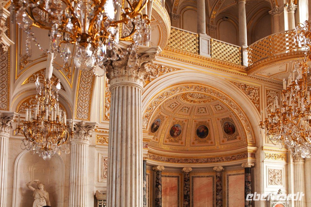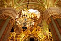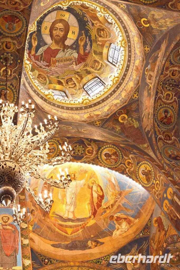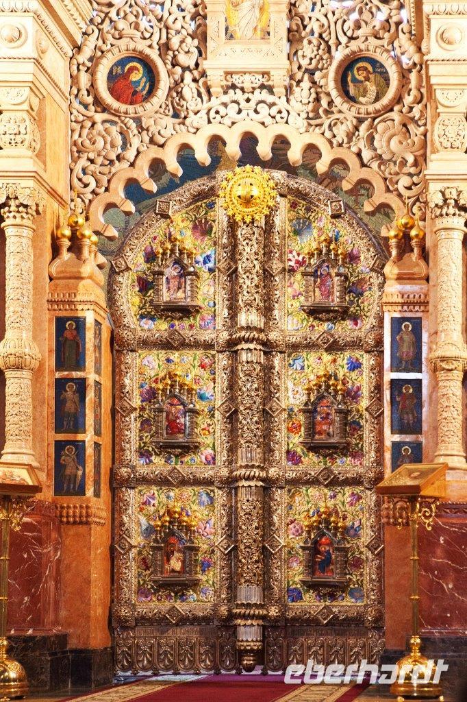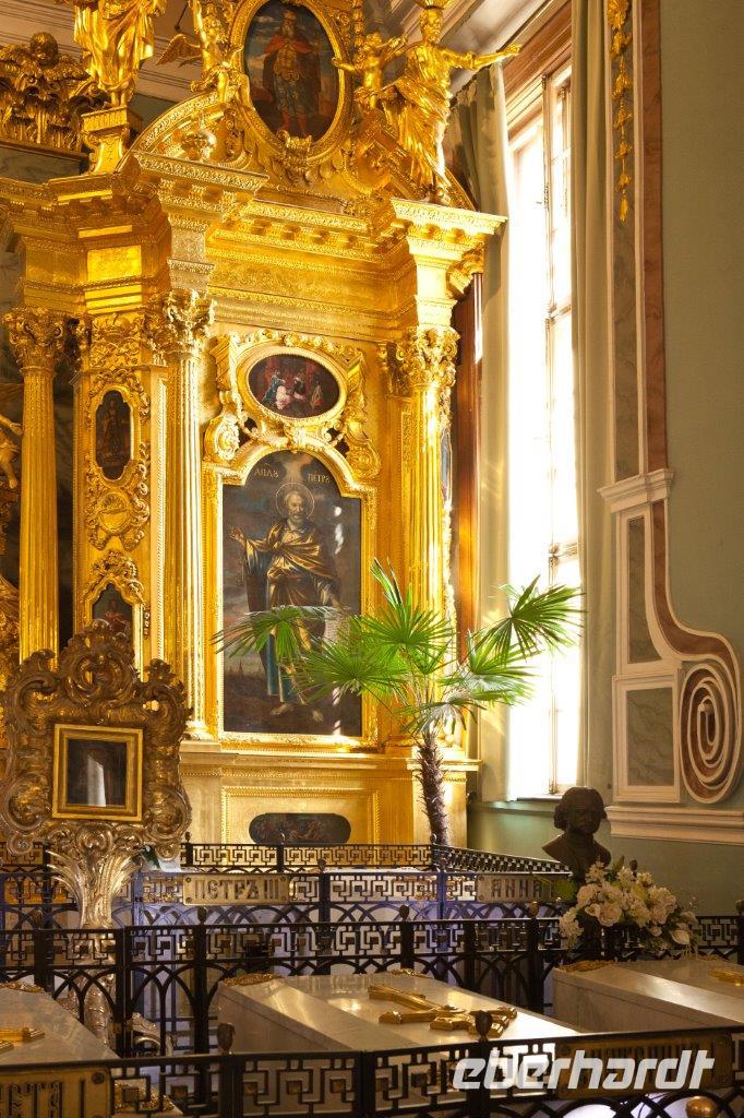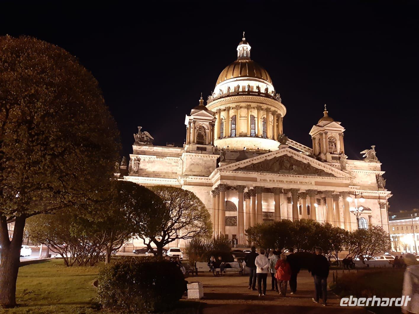 Ein weiteres bedeutendes Bauwerk von St. Petersburg ist die 1848 geweihte St.-Isaak-Kathedrale. Erbaut auf dem sumpfigen Boden der Stadt, wird sie von 24000 in den Boden gerammten Holzpfählen getragen. Die Wände des Innenraums bestechen durch eine Vielzahl von Gemälden, Edel- und Schmucksteinen, Säulen aus Malachit und Lapislazuli. Wir sind umgeben von überbordendem Prunk.