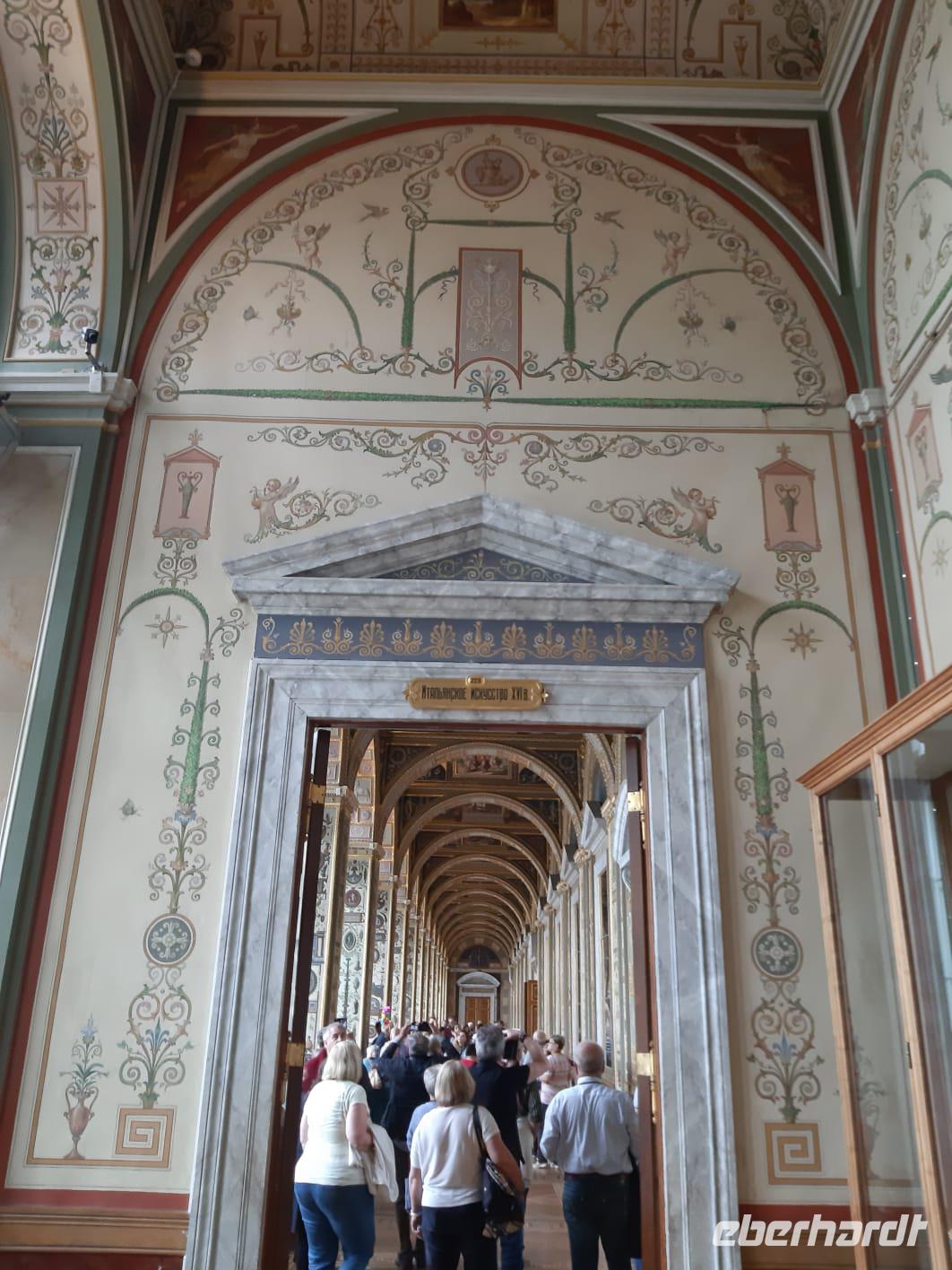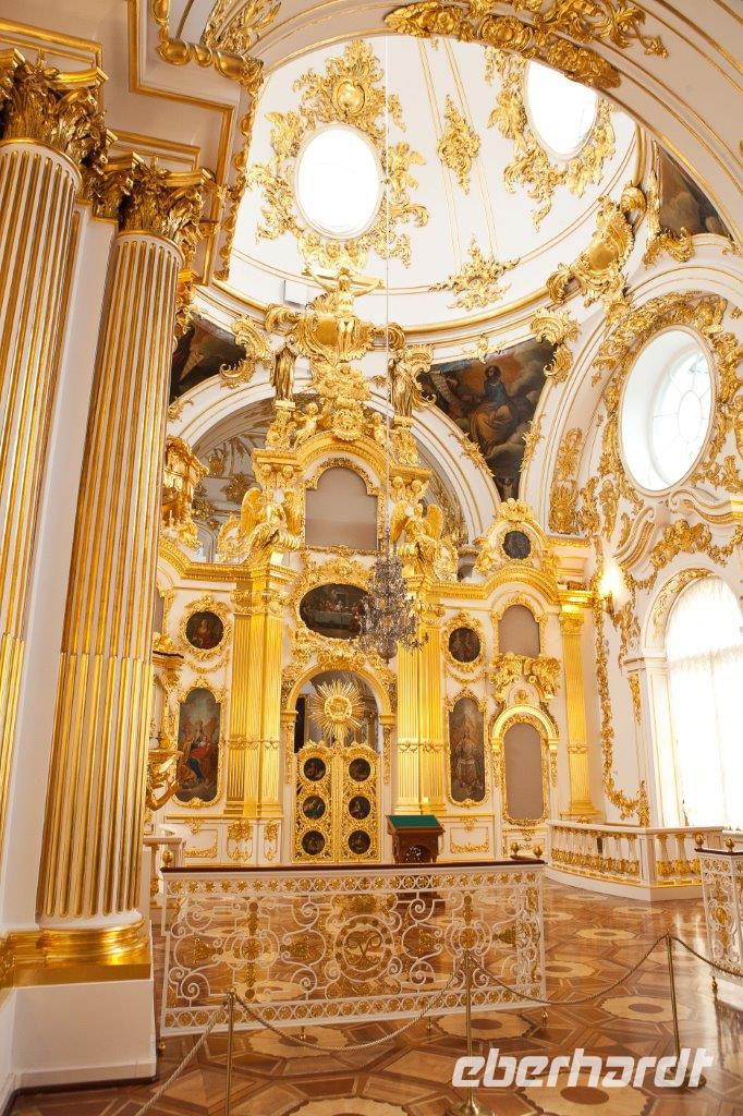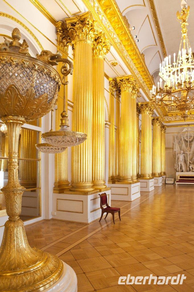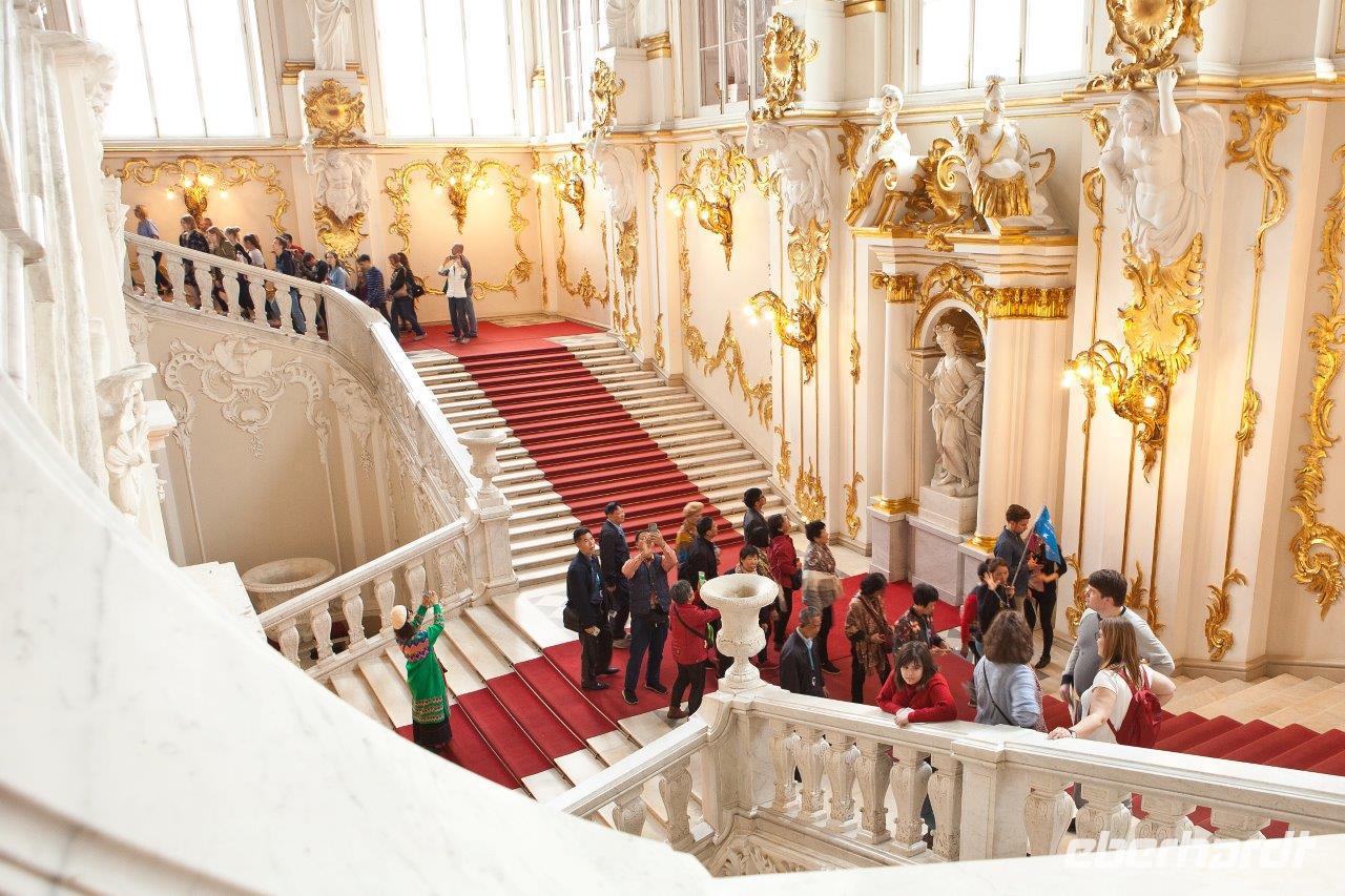 Unsere historische Erkundungsrunde beginnen wir mit dem Besuch des im schlichten Weiß ausgestatteten Innenraums des Smolnyi-Klosters. Katharina die Große ließ hier das erste Internat für adelige Mädchen in Russland einrichten. Angekommen in der weltberühmten Eremitage verteilt Jewgenij seine kleinen „Maschinchen" wie er die Audioguides nennt. Damit haben wir die hervorragende Chance, seinen Erklärungen durch die edlen Ausstellungsräume und kunstvoll bemalten Gänge im Eremitage-Museum zu folgen. Dieses offenbart uns eine einzigartige Sammlung russischen Mobiliars mit feinster Intarsienarbeit; wir bewundern Gemälde weltberühmter Meister, verweilen vor dem Bilde „Die stillende Madonna", laufen über die Jordan-Treppe zum Petersaal und anschließend zum 800 Quadratmeter großen Thronsaal. Von dort aus gelangen wir in die kleine Eremitage mit der goldenen Pfauenuhr. Zu besonderen Anlässen wird das Laufwerk in Gang gesetzt. Dabei schlägt der Pfau sein Rad, der Hahn kräht und die Eule verdreht ihren Kopf. Wir können dieses Wunderwerk der Technik nur bestaunen! Im Anschluß besichtigen wir die Auferstehungs- oder auch Blutkirche genannt, die zweifelsohne zu einer der schönsten Kirchen der Stadt gehört. Sie wurde exakt an der Stelle errichtet, an der Zar Alexander II. von Russland im Jahre 1881 im Zuge eines Angriffs ermordet wurde. Die farbenfrohe, im russischen Stil gestaltete Kirche ist ein echter Hingucker. Der Innenraum besticht durch Ikonenbilder, die vorwiegend aus Mosaiksteinchen zusammengesetzt worden sind.
