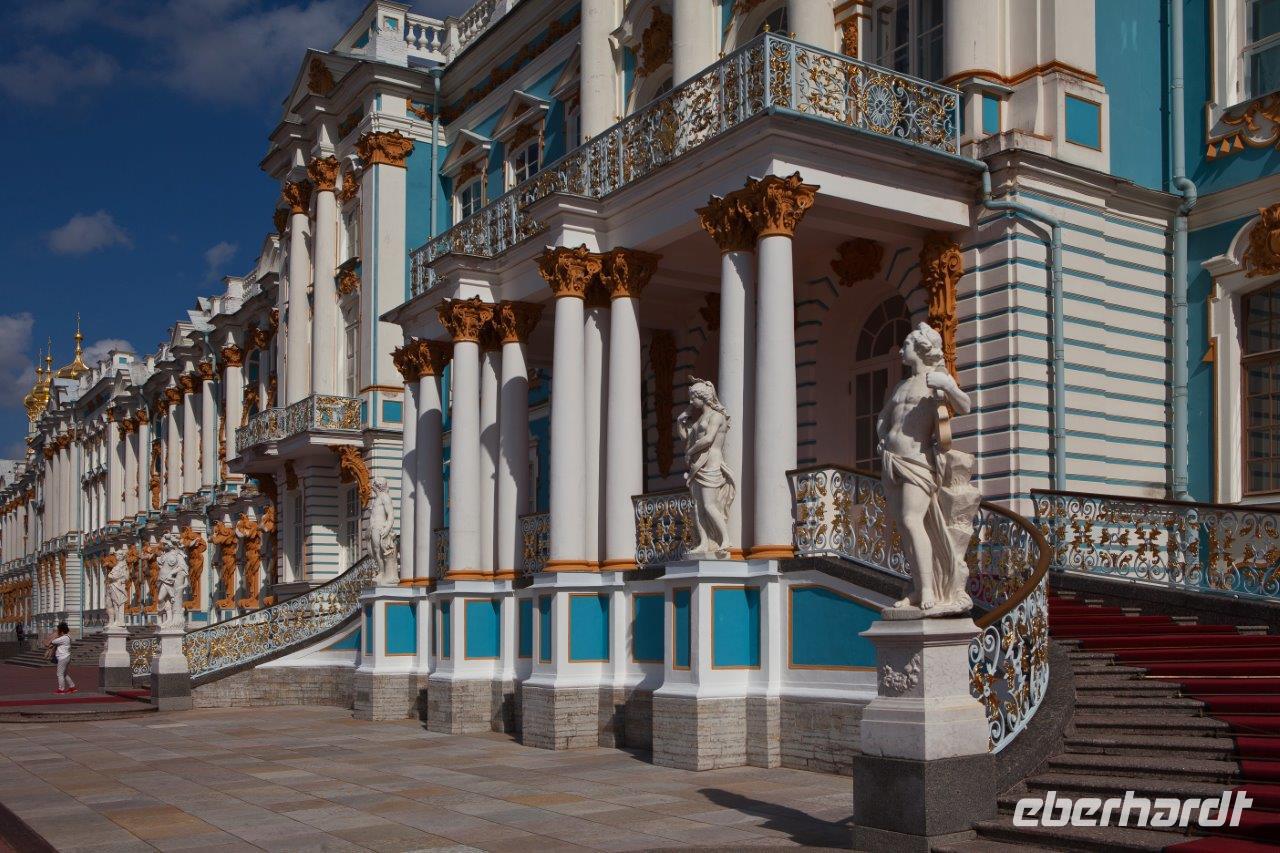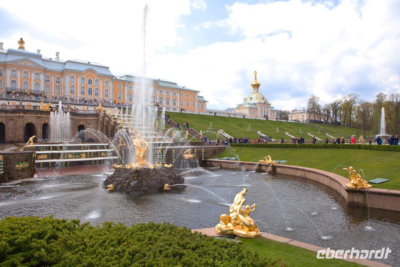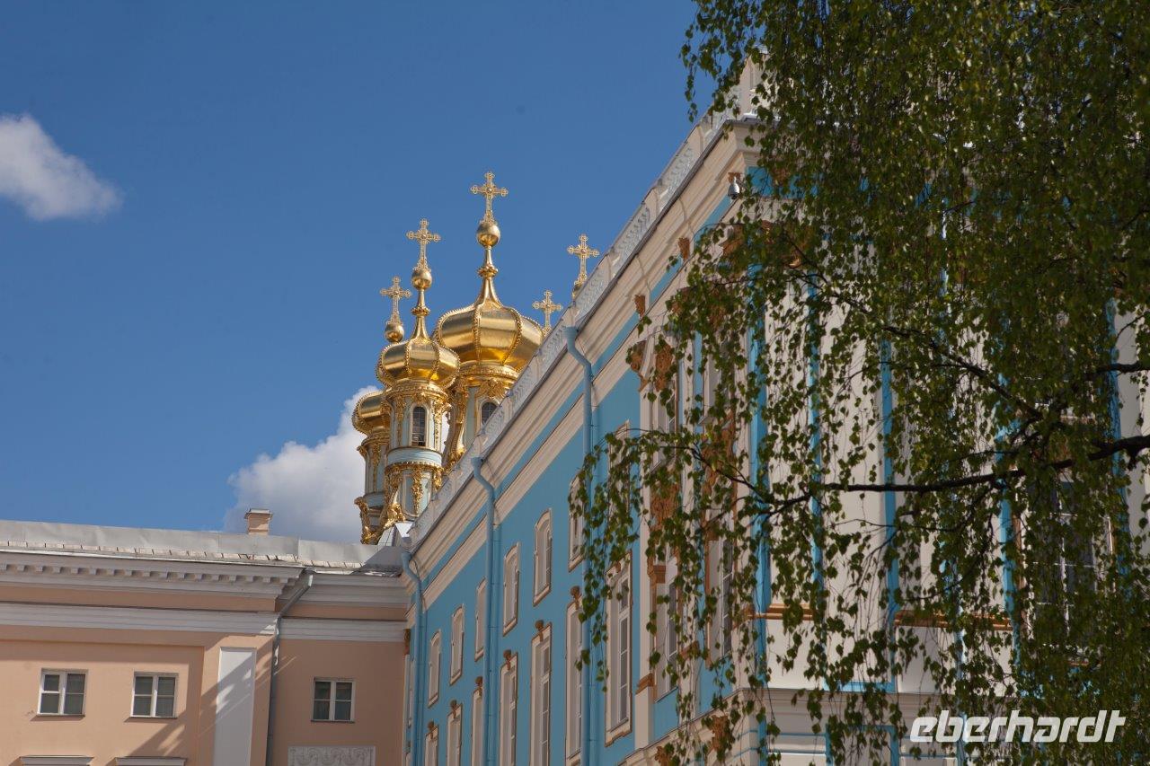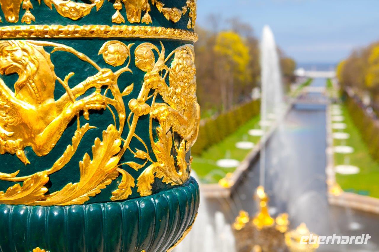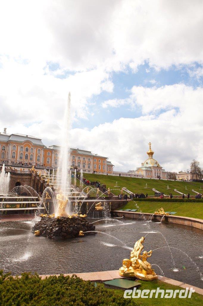 Bei frühlingshaften Temperaturen und Sonnenschein erkunden wir heute die ländliche Umgebung St. Petersburgs am finnischen Meerbusen. Hier erschuf die Zarendynastie ihre Sommerresidenzen. Peter der Große begann, angelehnt an die holländische Bauweise, mit dem Bau des Lustschlosses Monplaisir. Nach und nach dehnte sich die Parkanlage immer mehr aus. Wir bestaunen die verspielte Bauweise und die zum Lustwandeln einladende Atmosphäre, das in Goldfarben getauchte Schlossgebäude, Kaskaden, Spaßfontänen, Brunnen und Wasserspiele. Nicht minder prunkvoll und beeindruckend ist auch der Katharinenpalast, der zusammen mit den vergoldeten Kuppeln der Palastkirche eine wundervolle Einheit bildet. Eine Augenweide ist es, die Formenvielfalt der 300 Meter langen Fassade zu erfassen bis wir mit der Innenbesichtigung beginnen. Hervorzuheben sind der fulminante Thronsaal mit seinen Spiegeln und vergoldeten Kronleuchtern und natürlich das nach langer Rekonstruierungszeit wiedererstandene Bernsteinzimmer . Wir sind überwältigt von der handwerklichen Kunstfertigkeit der aus fossilem Harz gefertigten Wand - und Deckenschnitzereien.