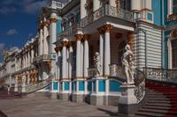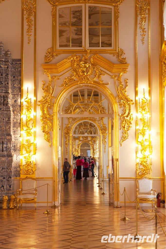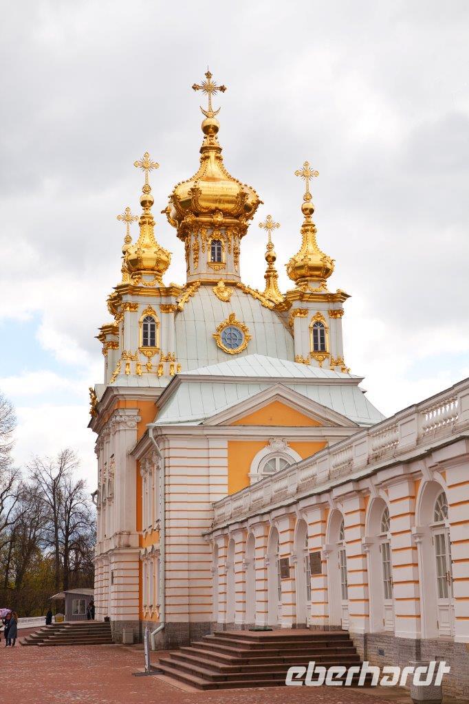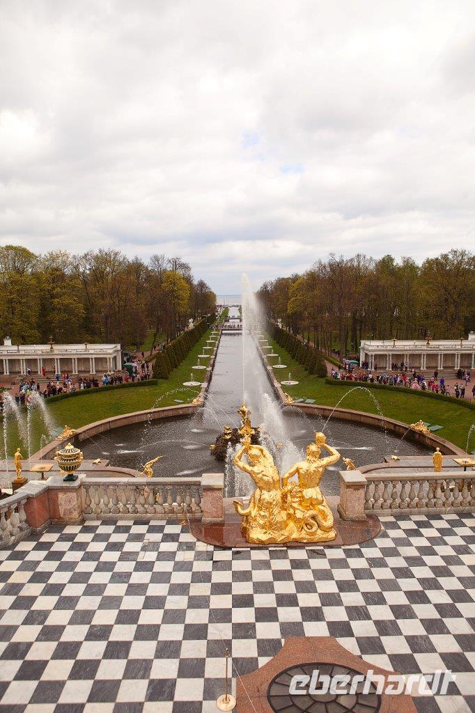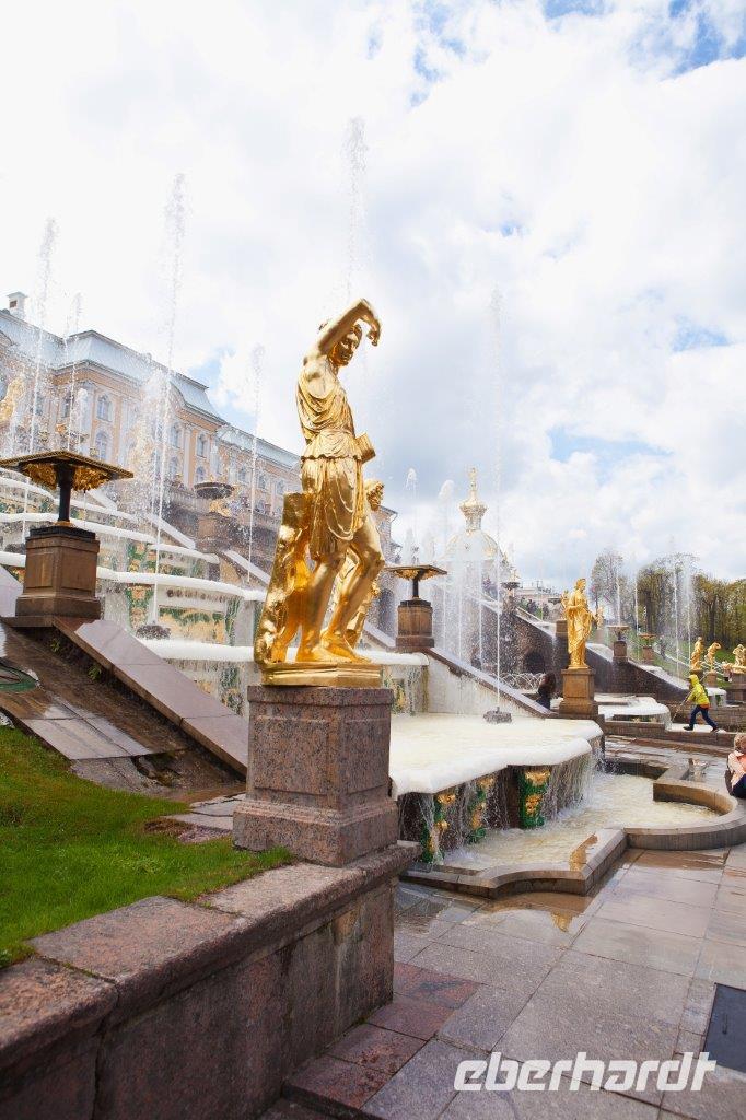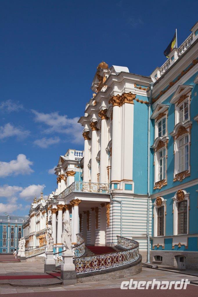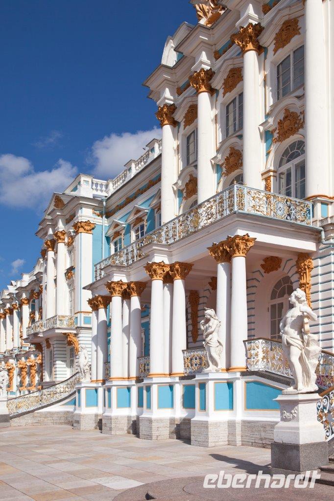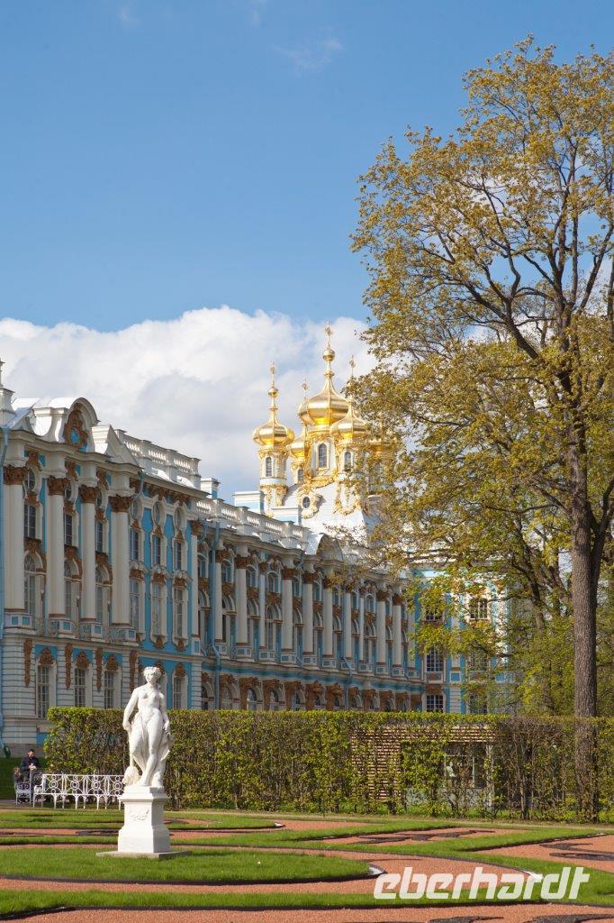 Bei frühlingshaften Temperaturen und Sonnenschein erkunden wir heute die ländliche Umgebung St. Petersburgs am finnischen Meerbusen. Hier erschuf die Zarendynastie ihre Sommerresidenzen. Peter der Große begann, angelehnt an die holländische Bauweise, mit dem Bau des Lustschlosses Monplaisir. Nach und nach dehnte sich die Parkanlage immer mehr aus. Wir bestaunen die verspielte Bauweise und die zum Lustwandeln einladende Atmosphäre, das in Goldfarben getauchte Schlossgebäude, Kaskaden, Spaßfontänen, Brunnen und Wasserspiele. Nicht minder prunkvoll und beeindruckend ist auch der Katharinenpalast, der zusammen mit den vergoldeten Kuppeln der Palastkirche eine wundervolle Einheit bildet. Eine Augenweide ist es, die Formenvielfalt der 300 Meter langen Fassade zu erfassen bis wir mit der Innenbesichtigung beginnen. Hervorzuheben sind der fulminante Thronsaal mit seinen Spiegeln und vergoldeten Kronleuchtern und natürlich das nach langer Rekonstruierungszeit wiedererstandene Bernsteinzimmer . Wir sind überwältigt von der handwerklichen Kunstfertigkeit der aus fossilem Harz gefertigten Wand - und Deckenschnitzereien.