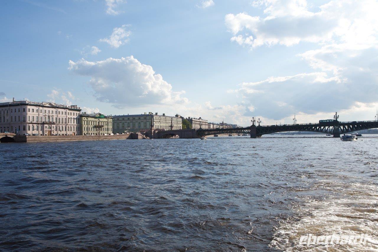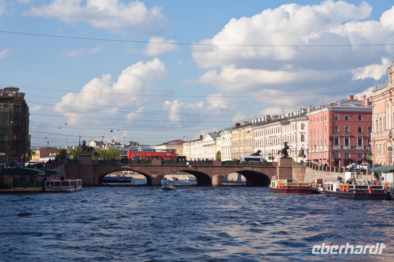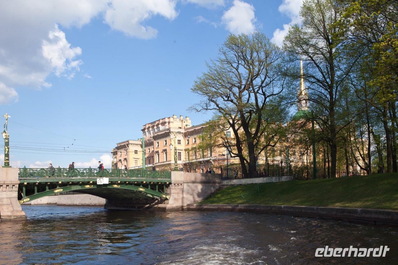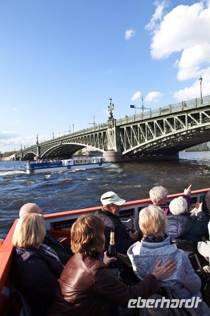 Am späten Nachmittag und bei herrlichem Sonnenschein nehmen wir Platz an Deck eines Ausflugsbootes und „gondeln" durch die Kanäle und schippern auf der mächtigen Newa entlang. Hier ziehen nun die zahlreichen Paläste, wunderschöne Bürgerhäuser und Brücken sowie Gärten und Parkanlagen an uns vorüber. Während wir uns bei russischem Sekt und Konfekt gemütlich zurücklehnen, bemerken wir einen jungen Burschen, der uns ganz auffällig von einer Brücke aus zuwinkt, an der nächsten Brücke bemerken wir ihn wieder. Er hat sich uns auserwählt und grüßt von jeder Brücke, die wir während der gesamten Rundfahrt passieren, um uns später an der Anlegestelle wieder aufzutauchen. Sein sportlicher Ehrgeiz wird belohnt.