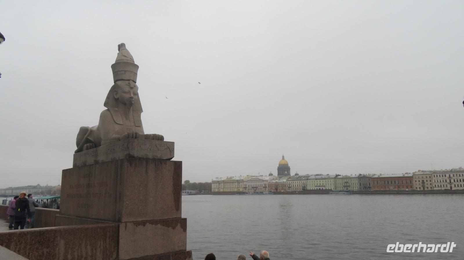 Heute stand zu Beginn die Stadtrundfahrt bei uns auf dem Programm. Unter anderem machten wir einen Fotostop an dem Anleger mit Sphingen. Der Bau stammt von der Kunstakademie. Links und rechts einer breiten Granittreppe erheben sich zwei in Ägypten angekaufte Sphinxe. Sie stammen aus dem 14. Jahrhunder und tragen die Gesichtszüge von Pharao Amenophis III.