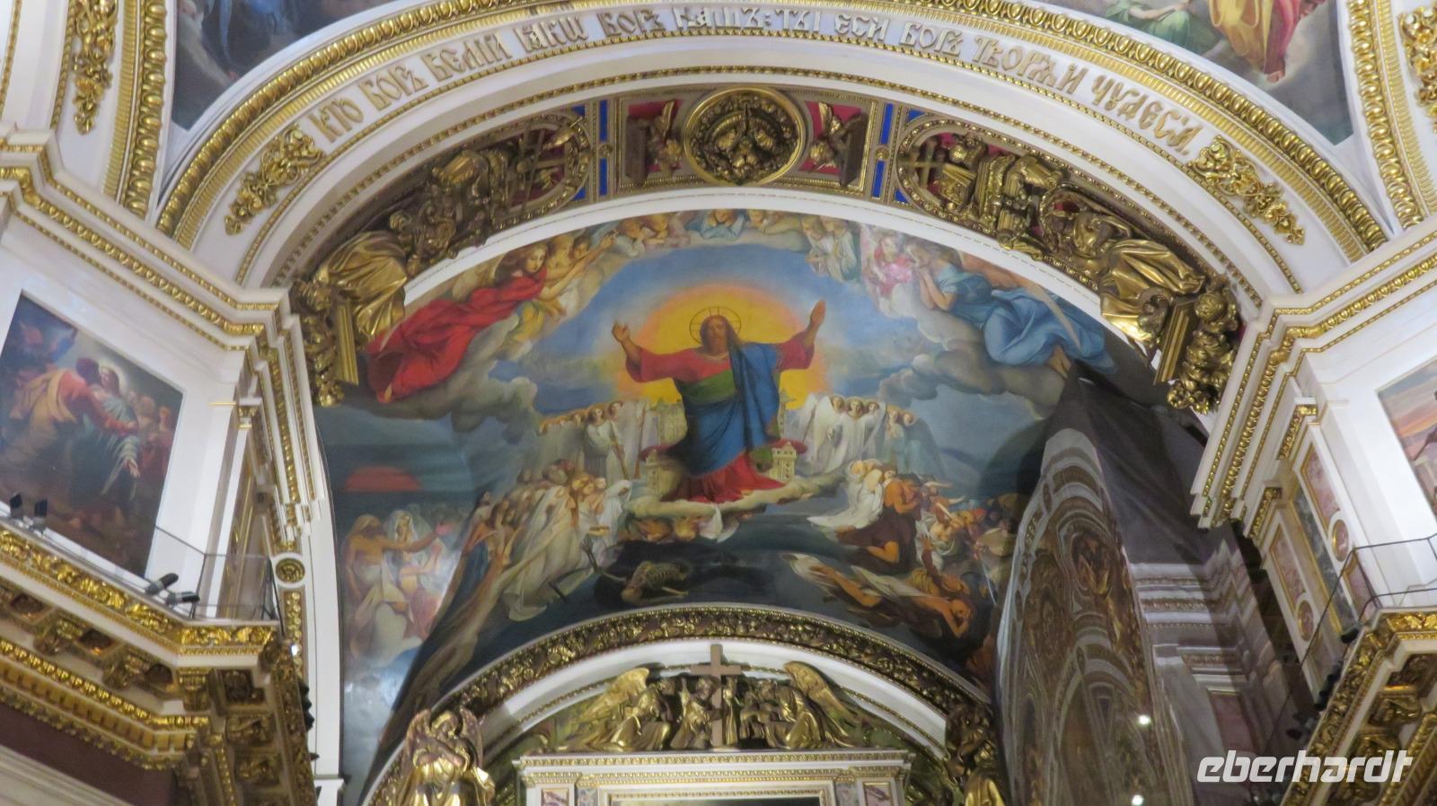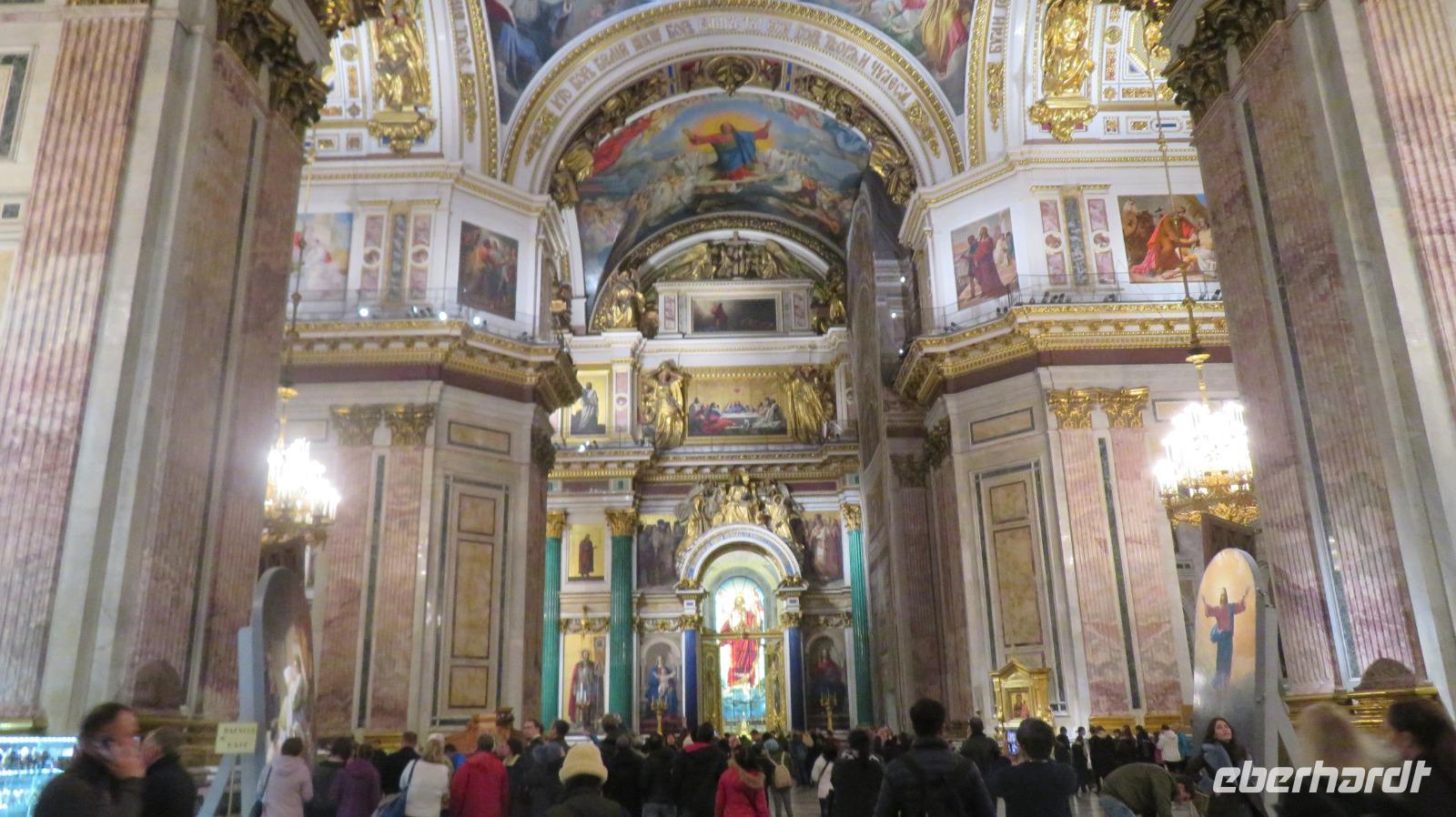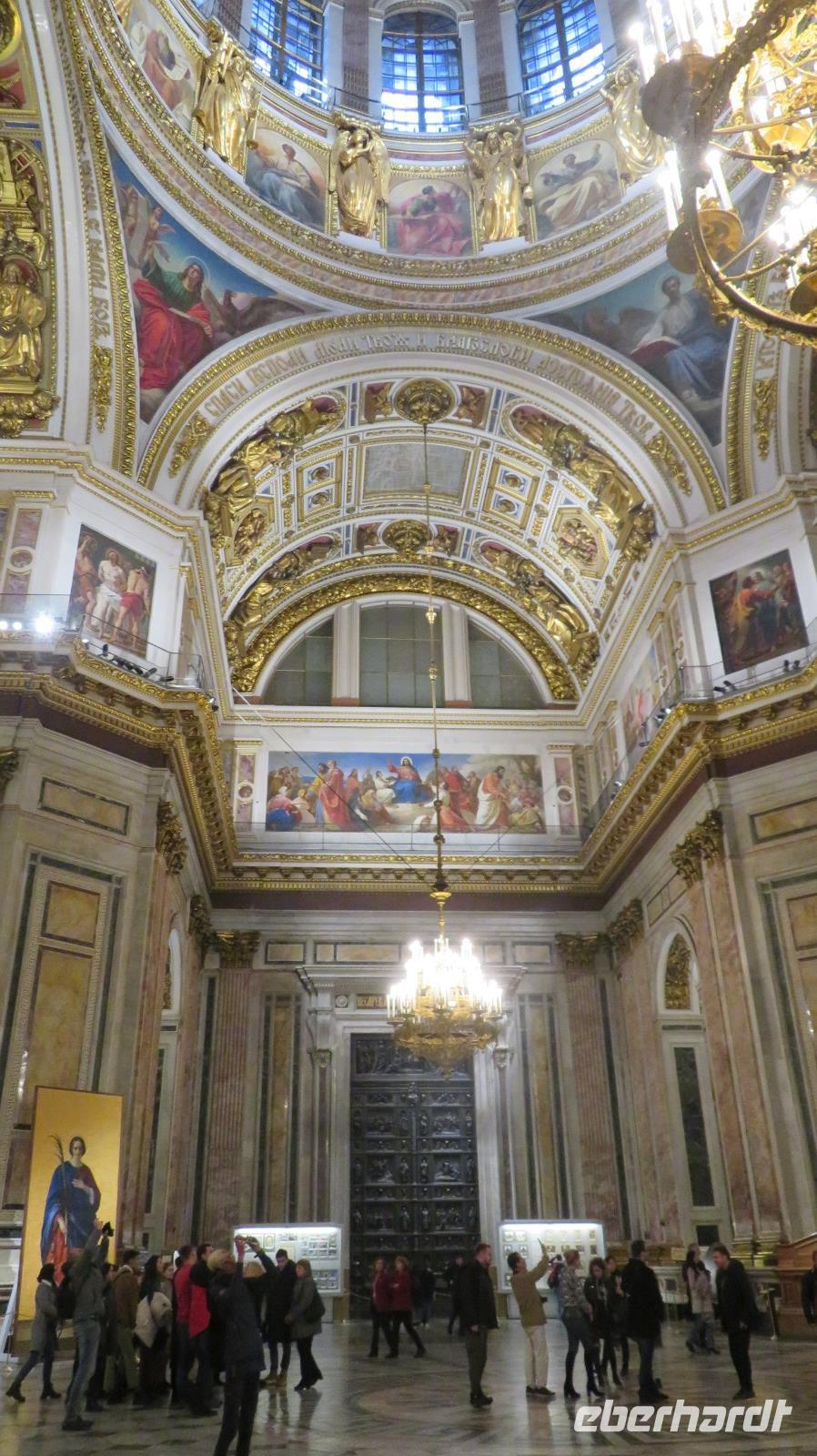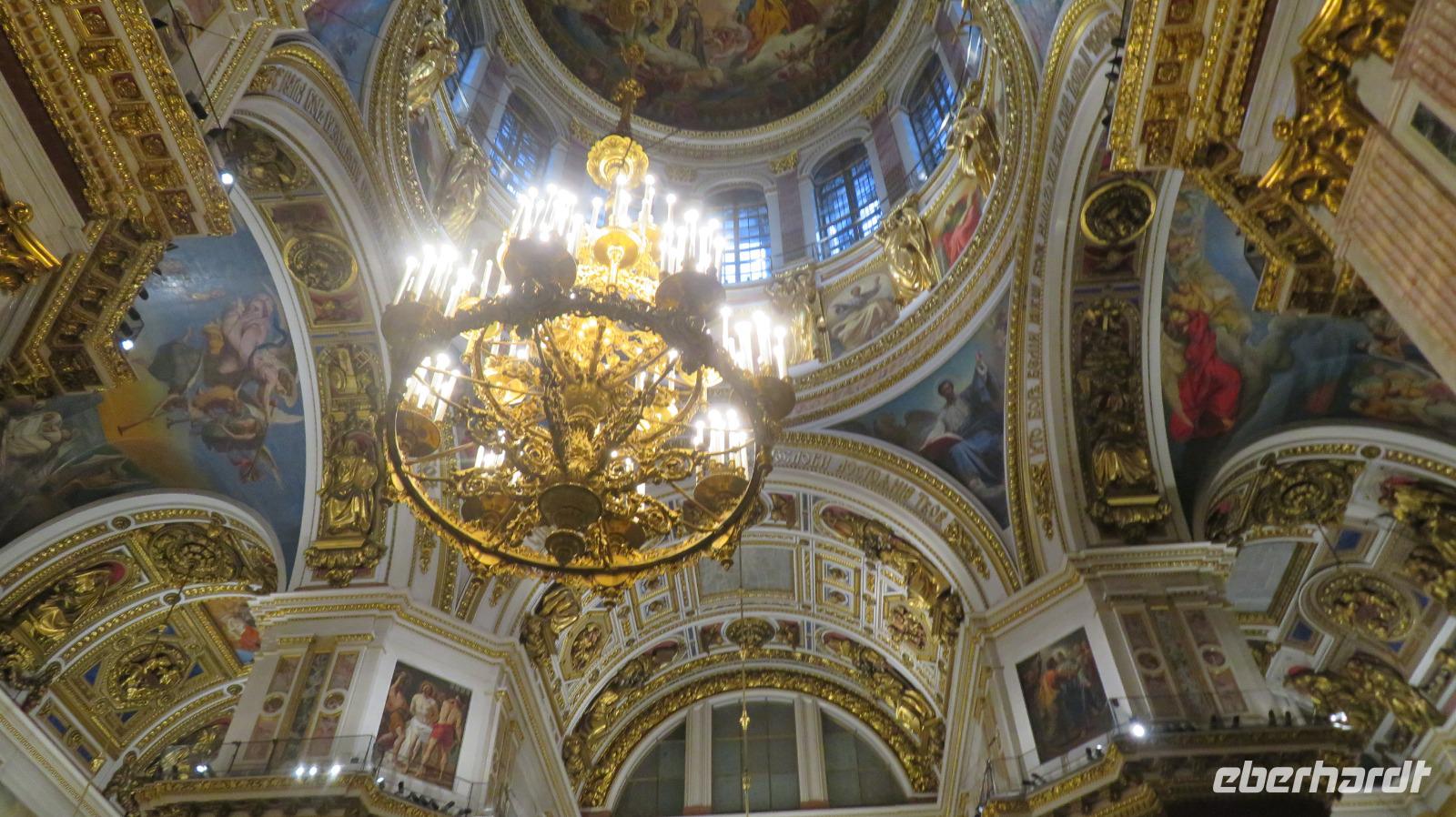 Unser letzter Programmpunkt für heute war die Isaakskathedrale. Hier handelt es sich um einen Bau der Superlative: 12.000 Menschen finden hier Platz, die Höhe beträgt 101 Meter, das Gesamtgewicht liegt bei 300.000 Tonnen und die Kathedrale steht auf 10.762 Pfählen.