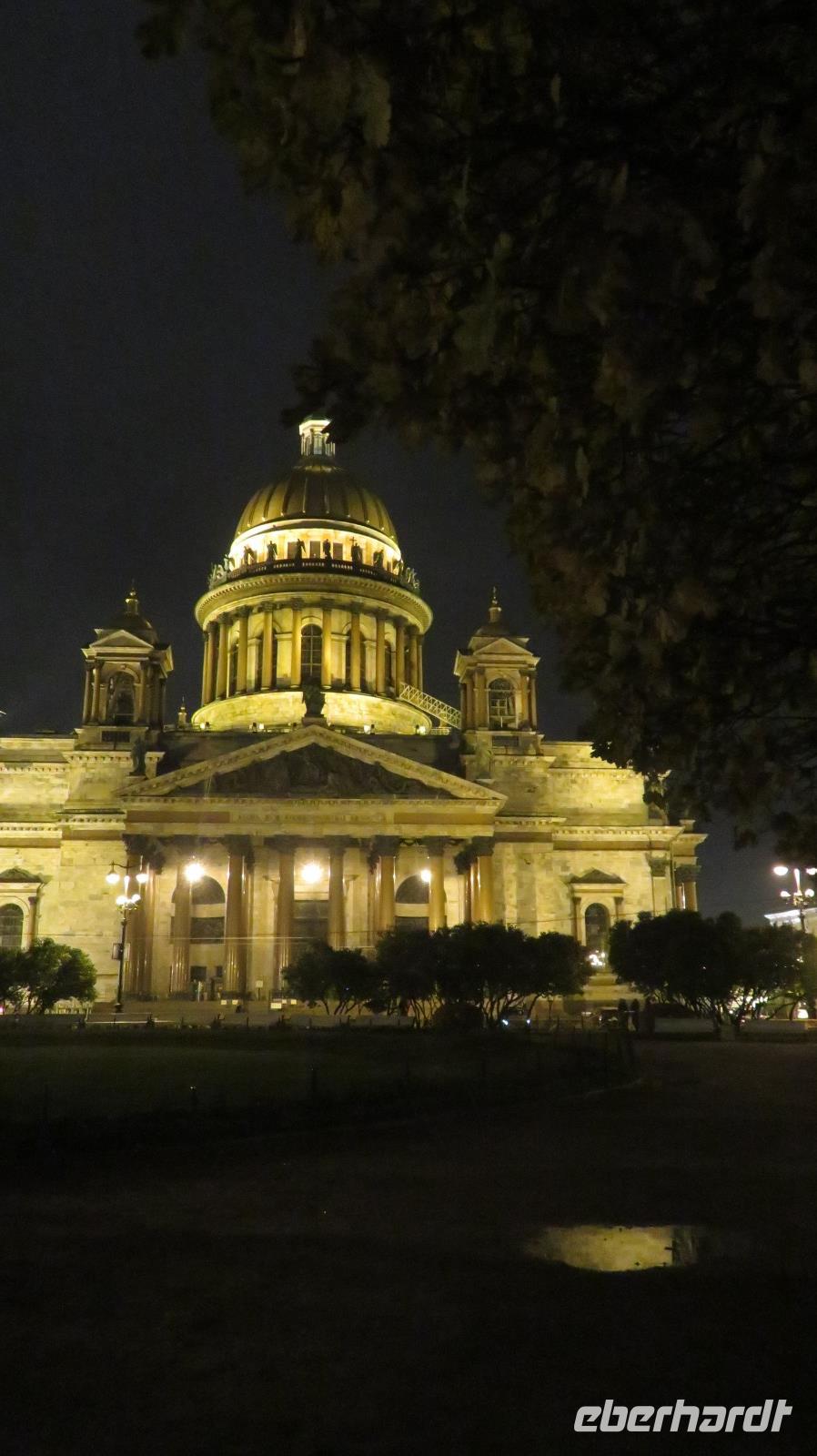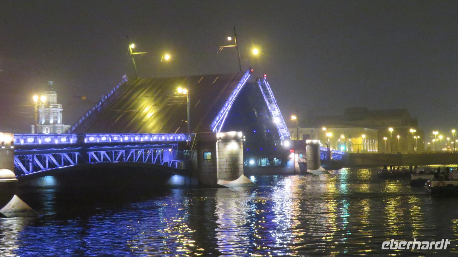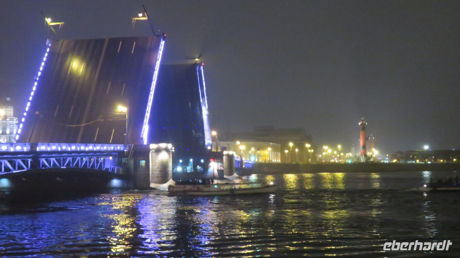 Um 23.30 wartete für einige aus unserer Gruppe heute noch ein besonderes Highlight: eine Lichterfahrt durch St. Petersburg. Unsere Reiseleiterin Evgenija führte uns zu den bekannten St. Petersburger Sehenswürdigkeiten, wie der Isaakskathedrale, dem Schlossplatz mit Winterpalais, der Blutskirche, der Kasaner Kathedrale und das Smolny Kloster. Gegen 01.10 Uhr konnten wir beobachten, wie die Schlossbrücke hochgezogen wurde. Wenn alle Brücken der Stadt hochgezogen sind, kann der Frachtverkehr St. Petersburg durchqueren.