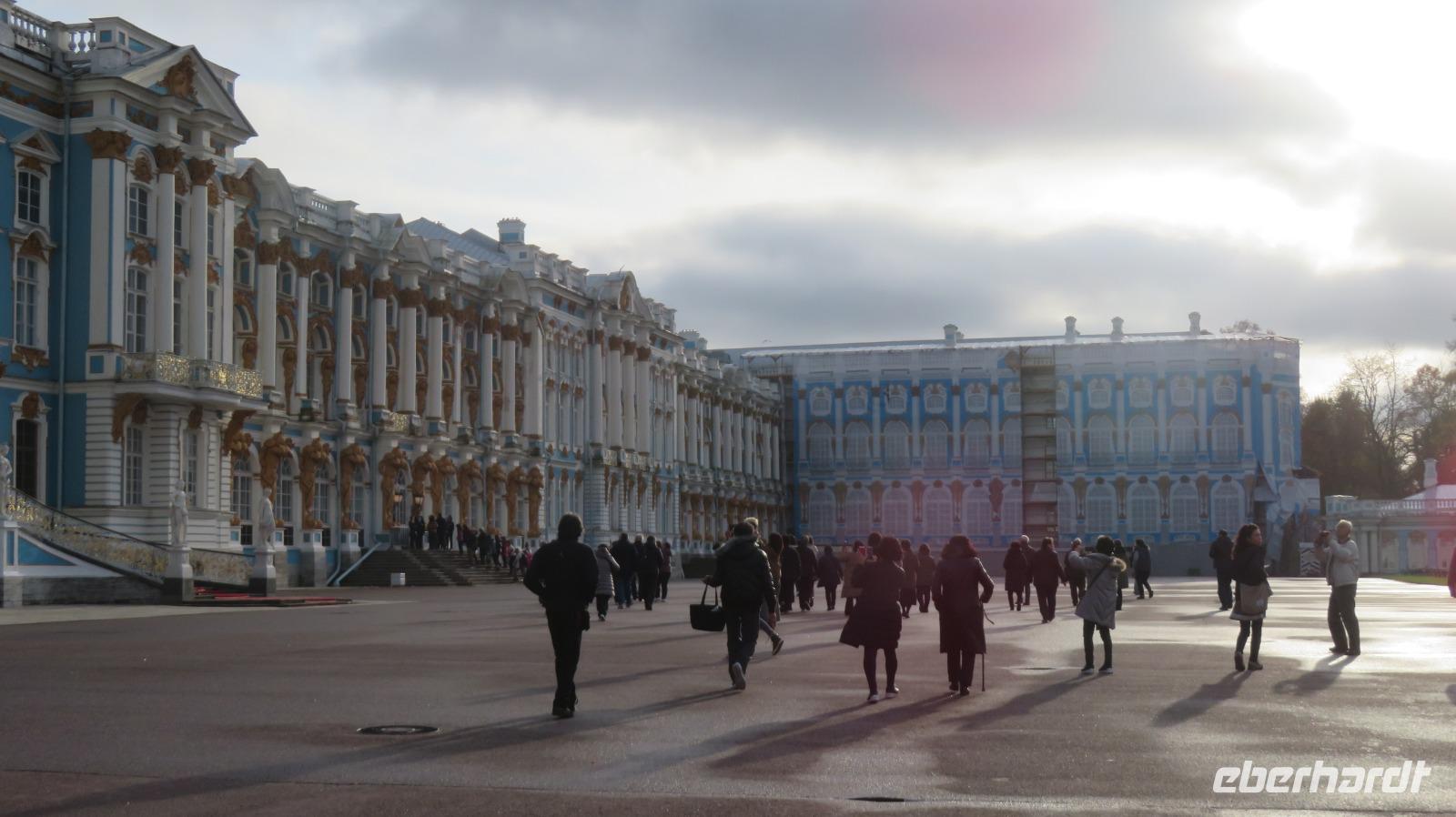 Da im Oktober auch viele Cafés nicht mehr geöffnet waren, machten wir vor dem Besuch des Katharinenpalasts eine kurze Mittagspause in dem riesigen Einkausfscenter „Lenta". Der Katharinenpalast wurde von Katharina I - der Ehefrau Peter des Großen - zwischen 1717 und 1724 erbaut. Der Palast erstreckt sich über eine Länge von 306 Meter und wurde ebenfalls bei Bartolomeo Rastrelli in Auftrag gegeben.