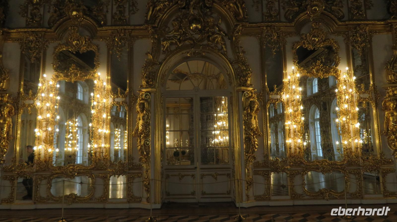Der Palast fällt durch seinen Prunk und seinen Luxus auf - Katharina die Große liebte es ihre Macht und ihren Reichtum zu präsentieren. Die Paläste von Peter dem Großen wirken dagegen viel bescheidener und waren auch praktischer eingerichtet.