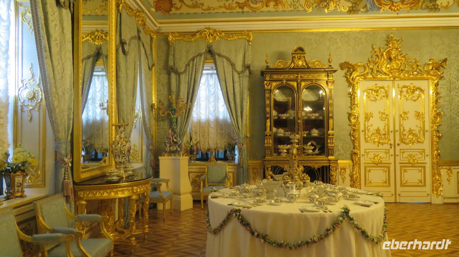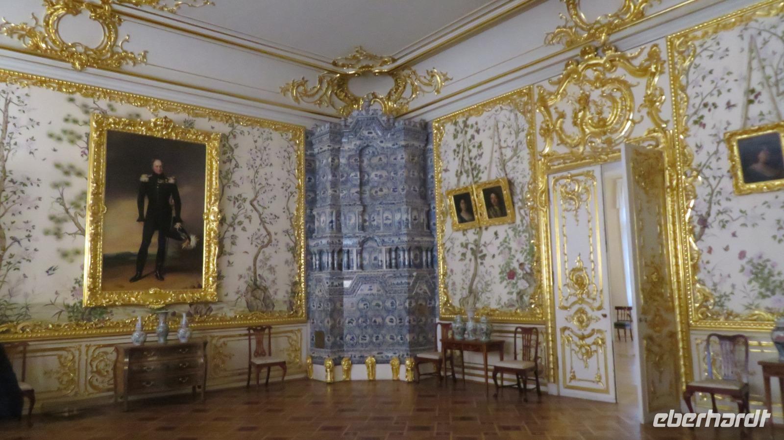 Berühmt ist der Palast für sein Bernsteinzimmer: 500.000 Bernsteinscheibchen sind hier passgenau auf die Wände angebracht.