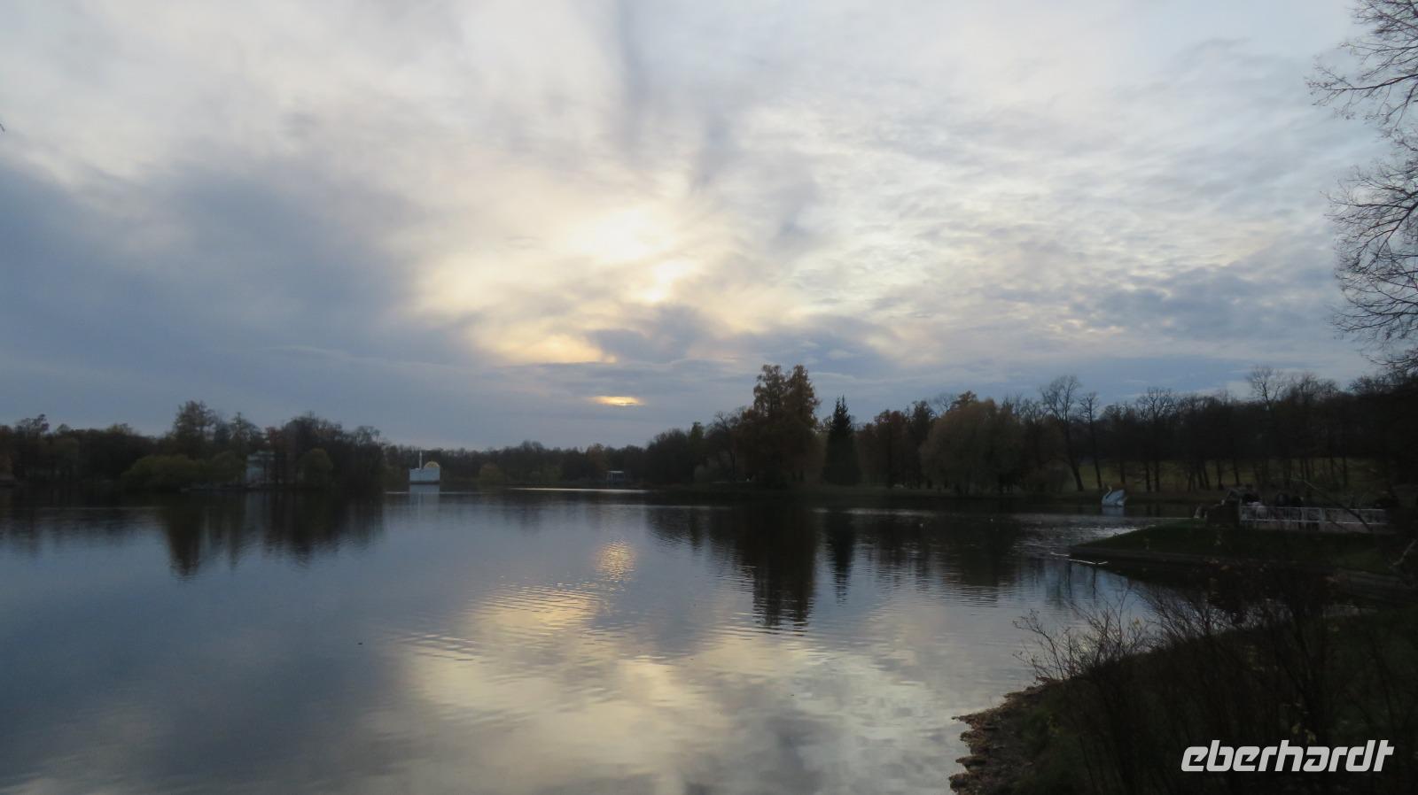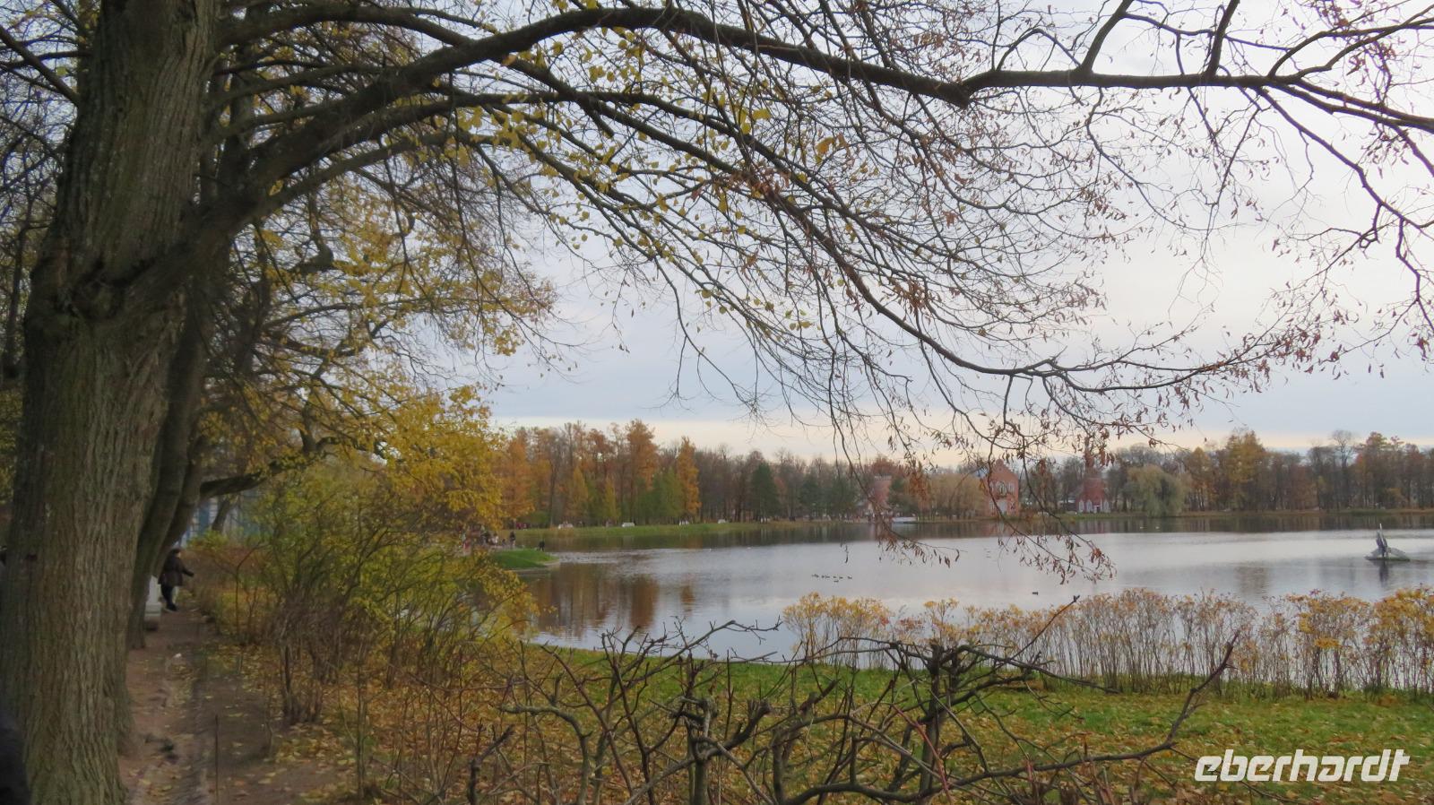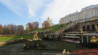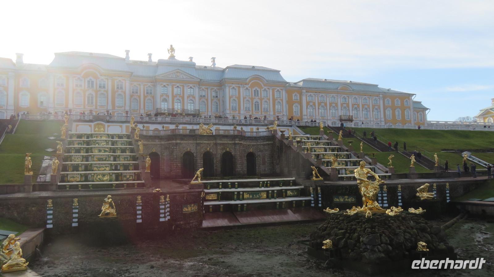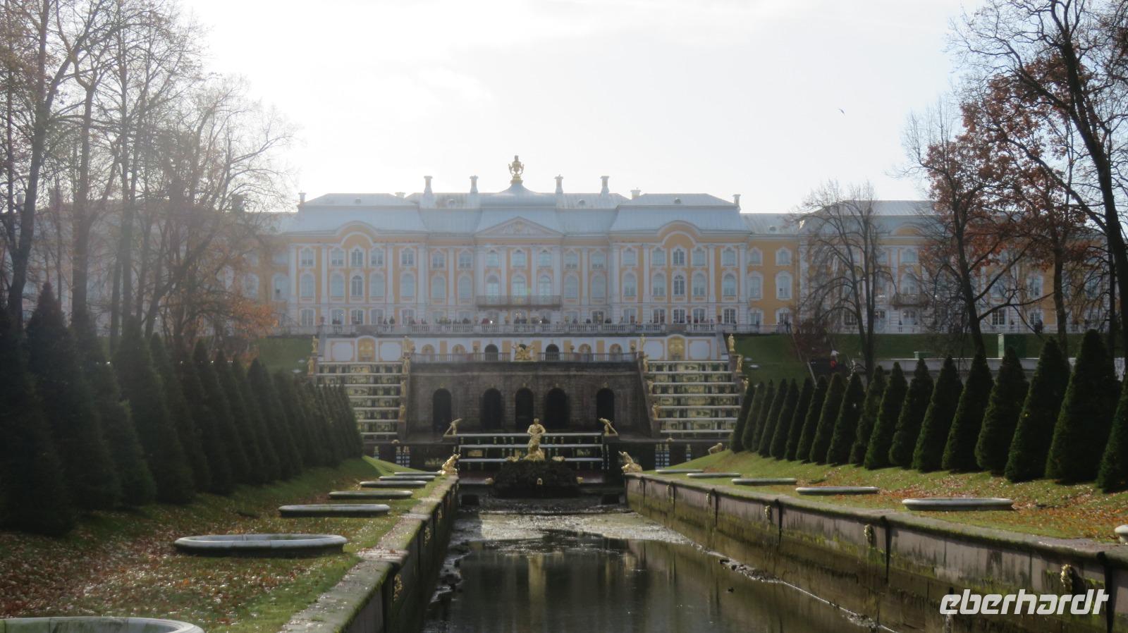 Heute standen die beiden großen Zarenpaläste auf unserem Programm: Peterhof und Katharinenpalast. Bei Peterhof handelt es sich um die ehemalige Sommerresidenz von Peter dem Großen. Obwohl die Fontänen im Oktober nicht mehr in Betrieb waren herrschte hier reger Andrang und wir musste fast 40 Minuten anstehen, bis wir in den Palast eingelassen wurden. Der 33 Meter lange Barockbau erstreckt sich auf einer Anhöhe - unterhalb der sich die riesige Parkanlage der Sommerresidenz erstreckt. Der Palast entstand in seinen Grundzügen zwischen 1714-1723. Elisabeth - die Tochter Peter des Großen - erweiterte den Palast im Jahr 1750 um einige Räume. In Auftrag gegeben wurden diese Anbauten bei dem italienischen Baumeister Bartolomeo Rastrelli.