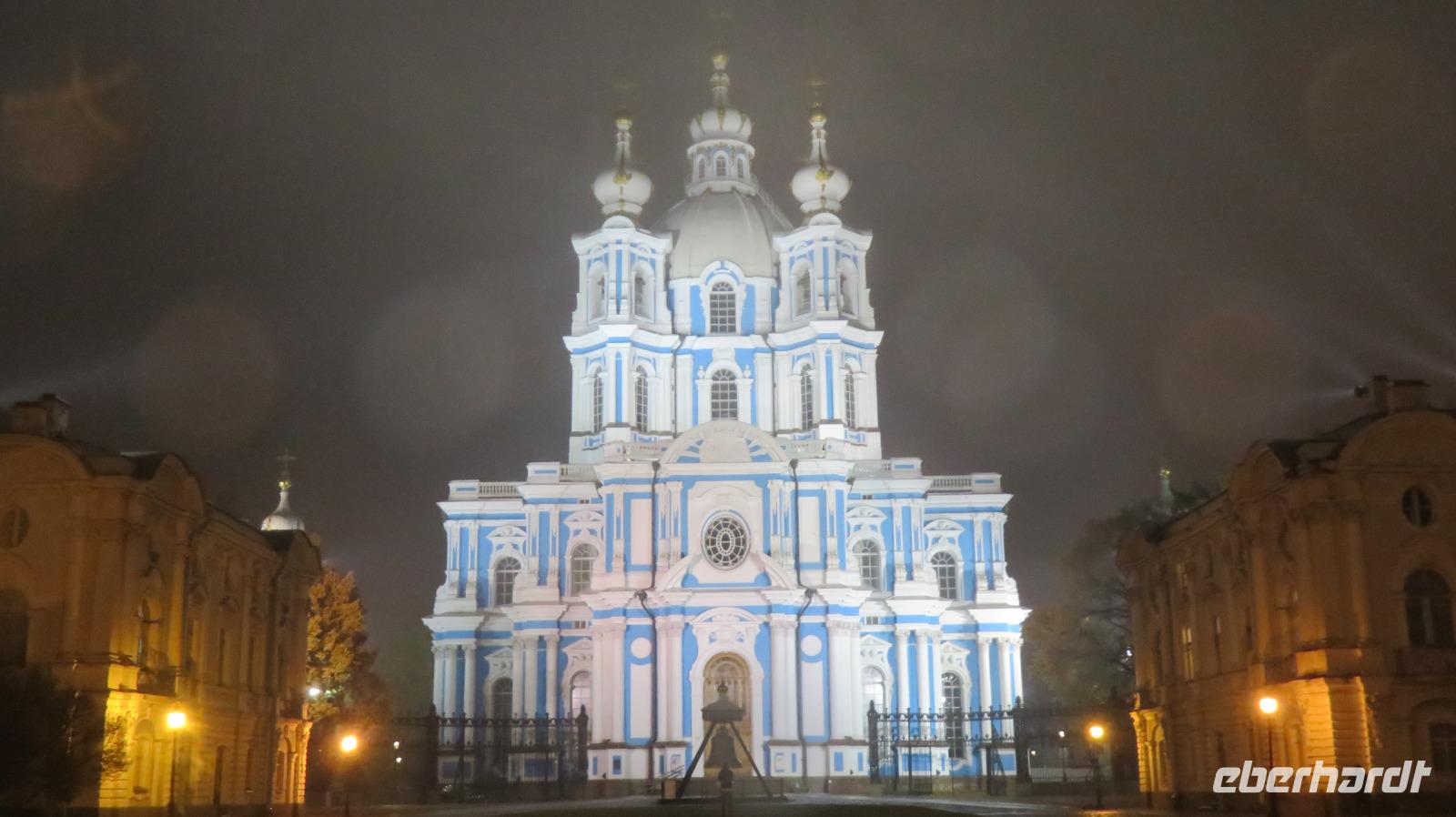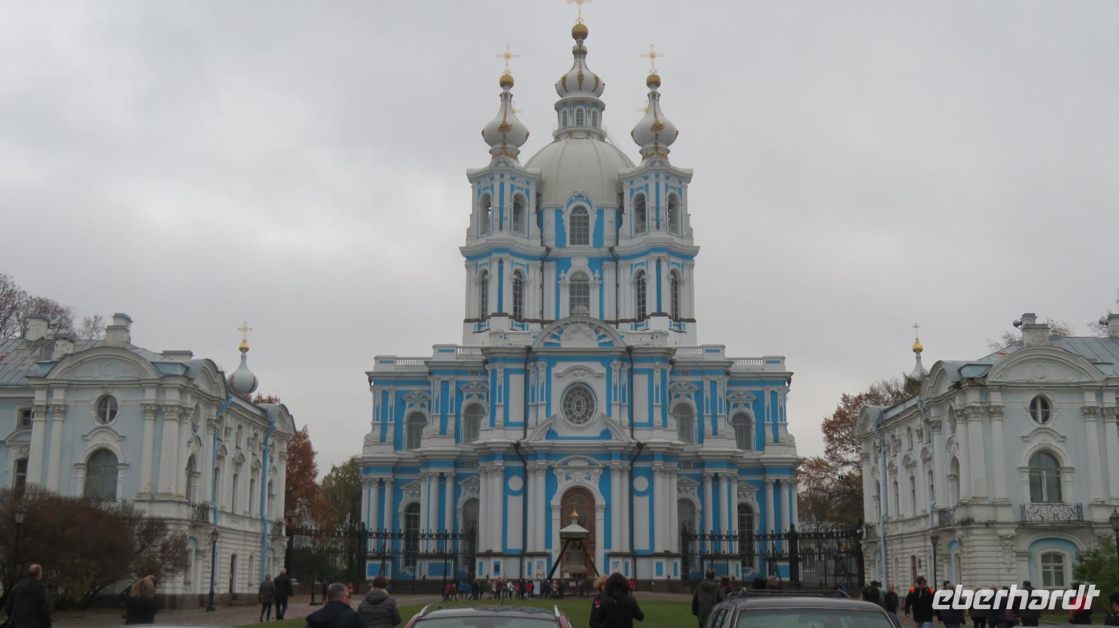 Gleich am nächsten Morgen, war unser erster Stop das Smolny Kloster. Hier hatten einige von uns die Möglichkeit die Kathedrale bei Nacht und bei Tageslicht direkt miteinander zu vergleichen. Von Konstantin erfuhren wir, dass das Smolny Kloster eigentlich nie ein Kloster war. Aus Geldmangel konnte das Großprojekt zur damaligen Zeit nicht umgesetzt werden und so richtete Zarin Elisabeth im Jahr 1764 ein Mädcheninternat hier ein. Die kräftige hellblaue Farbe des Klosters soll an die Augenfarbe der Zarin erinnern.
