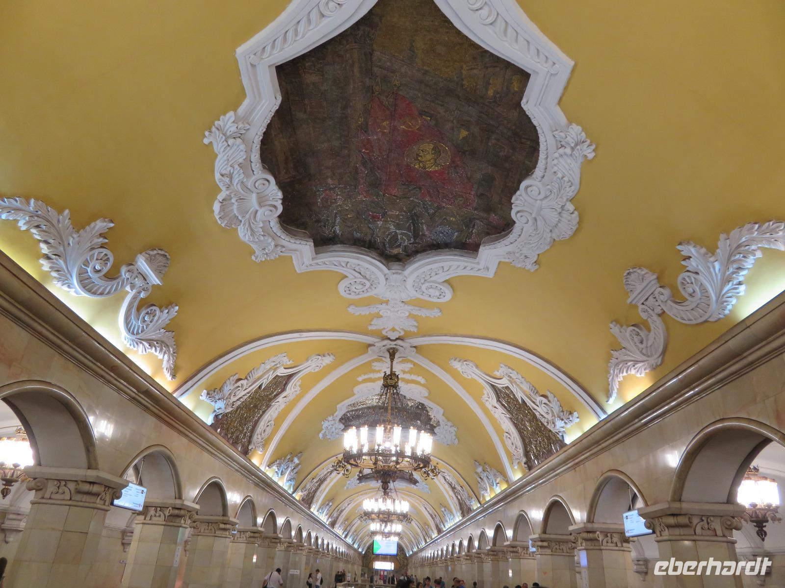 Eine Gruppe von vierzehn Gästen traf sich am Dienstagmorgen am noch-immer-Flughafen Berlin-Schönefeld, um mit Aeroflot nach Moskau zu fliegen. Voller Spannung trafen wir mit einer Stunden Zeitumstellung - Russland hat keine Sommerzeitregelung - am warmen Sommernachmittag in Scheremetjewo ein. Jelena, unsere Moskauer Stadtführerin holte uns ab. Mit dem Bus ging es durch den „Vorort" Chimki über die Leningrader Chaussee und den Leningrader Prospekt zum Weißrussischen Bahnhof, dann über die Twerskaja direkt Richtung Manegeplatz am Kreml; weiter über die Ljubljanka, am Moskwaufer entlang hinüber auf deren Südseite zum Hotel Katarina City am Moskwa-Kanals. Wie in jedem Jahr waren wieder viele Bauforschritte festzustellen; insbesondere durch die Fussballweltmeisterschaft hatte sich manches weiter herausgeputzt. Bis zum Abendessen war Zeit zum Geldtauschen; manche der einst unzähligen Wechselstellen am Paweletzki-Bahnhof waren allerdings verschwunden. Nach dem Abendessen starteten wir zu einer kleinen zusätzlichen Tour mit der Metro und ihren phantastischen Stationen -insbesondere der Ringbahn.