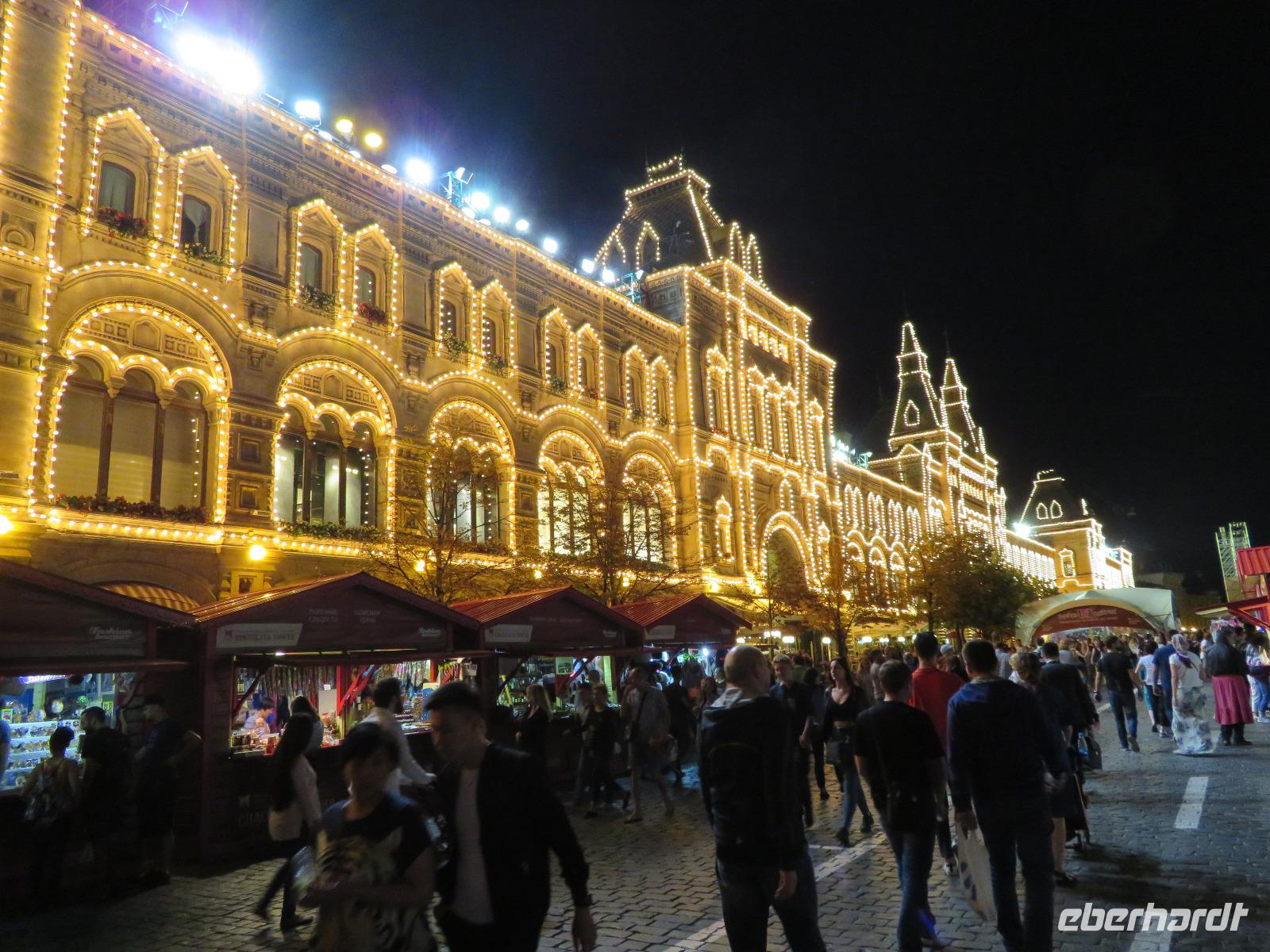 Als es schon dunkel war, bummelten wir von der Ljubjanka durch die „weihnachtlich" illuminierte Nikolska zum GUM und Roten Platz. Riesige Tribünen und Kioske mit Volksfestcharakter versperrten allerdings den Blick und Weg auf die sonst so erhaben wirkende Prozessionsfläche.Nach langem Tag war dann die Kraft heraus und in dreißig Minuten erreichten wir mit der grünen Metrolinie unser Hotel.