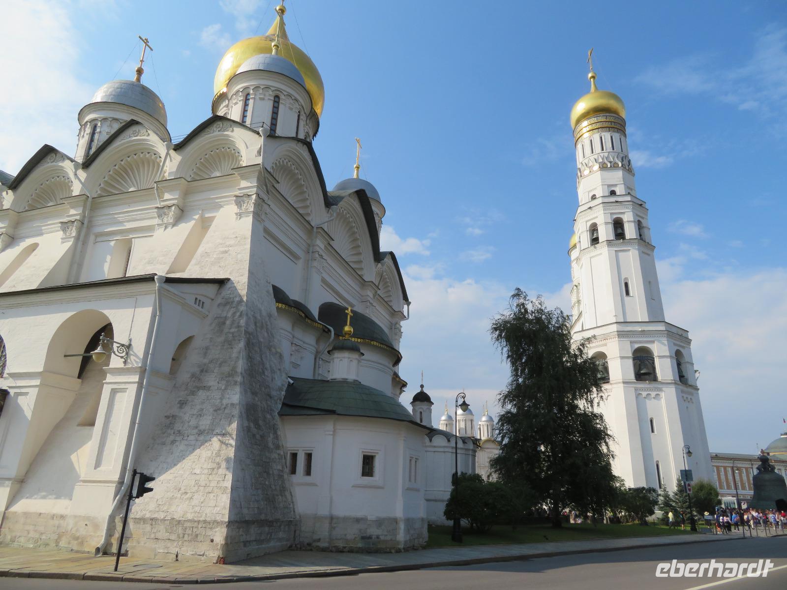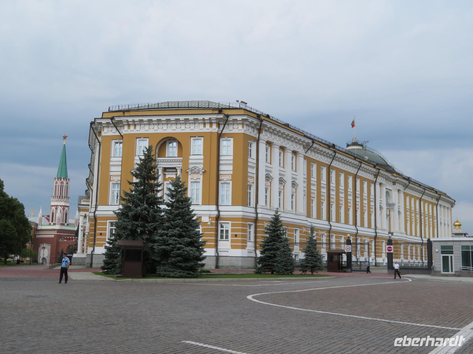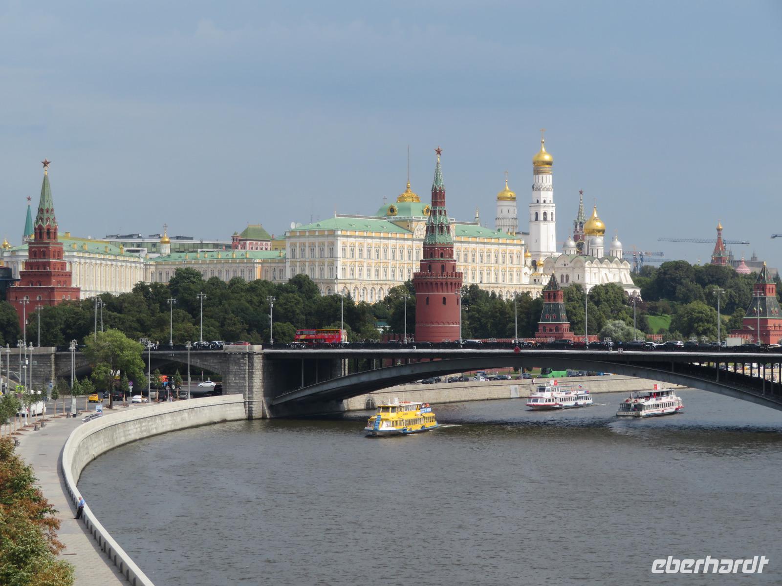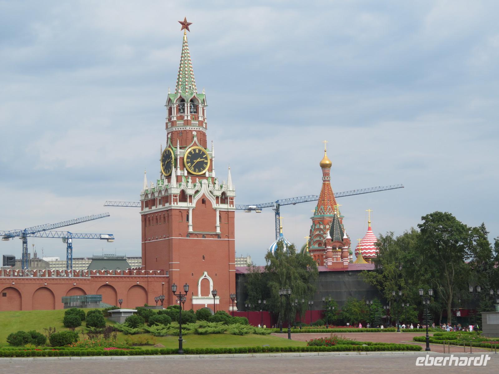 Um 10 Uhr trafen wir uns für eine Stadtrundfahrt mit dem Bus. Durch das sich über die Jahre bestens herausgeputzte Samoskworetschie ging es an der Moskwa gegenüber dem Kreml vorbei zur Erlöserkirche - seit über fünfzehn Jahren Ziel tausender Gläubiger und der Touristen. (Aber bitte nicht mit kurzen Hosen!). Dann ging auf die andere Seite der Moskwa hinauf zur Lomonossov-Universität und dem üblichen Touristenblick von der Plattform auf Moskau. Seit diesem Jahr ist das Podest erfreulicherweise „anbieterbereinigt". Der Blick von den Sperlingsbergen heute jedoch recht trüb. Kleine Bummel-Kaffee-Pause dann zur Mittagszeit auf dem Alten Arbat mit Traditionsausstieg am Außenministerium. Gut schafften wir es zur vorgesehenen Besichtigungszeit in den Kreml. Pünktlich ging es durch das Troizkitor des Kreml zur Besichtigung des Kreml. Mit nur einem kurzen Schlangestehen und ein wenig Schupsen waren wir im Heiligtum russischer Staatsmacht. Auf den üblichen, touristenbelassenen Wegen ging es zum großen Kremlplatz gegenüber dem Amtssitz des Präsidenten, wo das ehemalige Gebäude einer Militärschule vor zwei Jahren abgerissen wurde und seitdem freier Blick zur Kremlmauer und Spasskiturm besteht. Die große Kanone, die Glocke und zwei Kremlkirchen gehören zum „Pflichtprogramm" bevor wir durch das Tor im Spasskiturm den Kreml verließen. Der Bus brachte uns dann zum Prominentenfriedhof am Neujungfruenkloster, wo wir uns an einigen Grabstätten in die russisch-sowjetisch-russische Geschichte des Landes hineindachten. Bevor wir unsere Bahnfahrt nach Kasan antraten, aßen wir diesmal im Restaurant Lermontow recht frühzeitig zu Abend. Später am Kasaner Bahnhof konnten wir ein wenig das bunte Treiben auf Moskauer Bahnhöfen beobachten. Im Wagon 2 des Zuges Nr. 2 fanden wir unsere Plätze. Der Verstau des Gepäcks ging ungewöhnlich zügig voran; vielleicht weil drei Gästepaare auch je ein Abteil gebucht hatten und so der Platz nicht ganz so beengt war. Pünktlich 20:48 Uhr zog der Zug an. Durch die schon dunkle Stadt, Vorstädte, Wälder und Datschensiedlungen des Moskauer Umlandes ging es in die tiefe Nacht hinein. Nur einige Raucher standen nach Mitternacht auf dem Bahnsteig und „lauschten" dem geschäftigen Treiben, während die meisten schon fest schliefen.